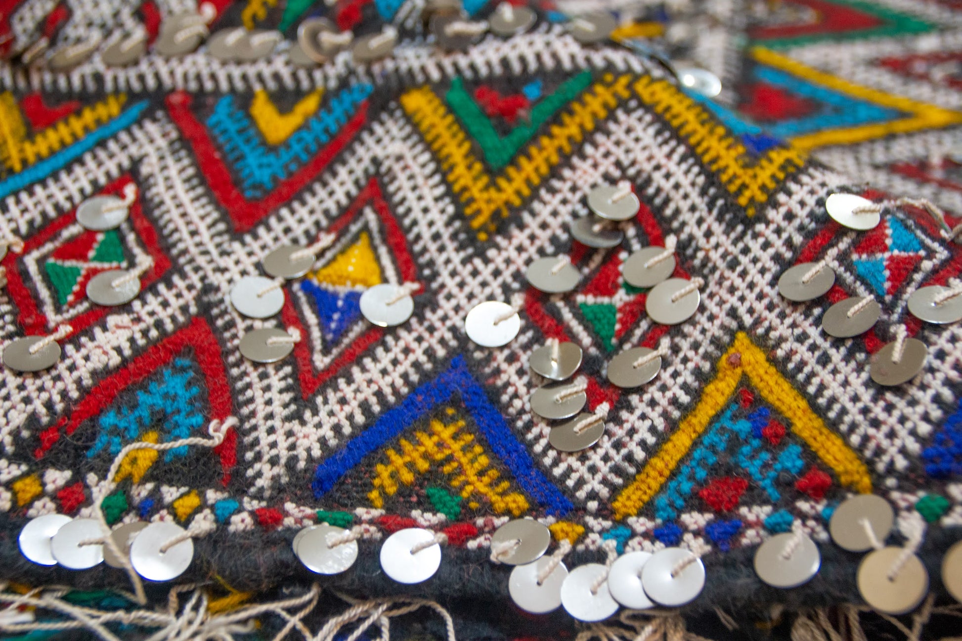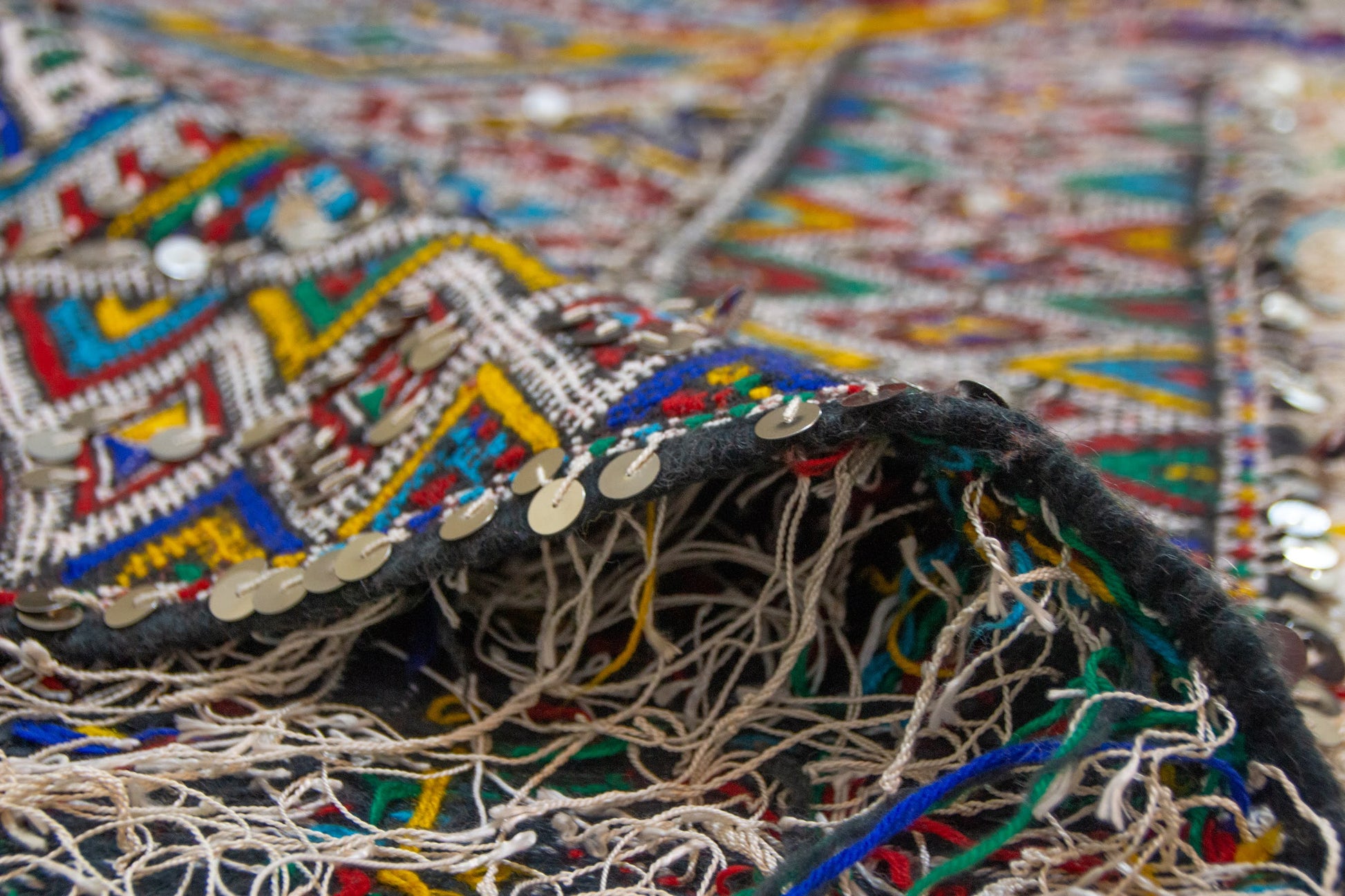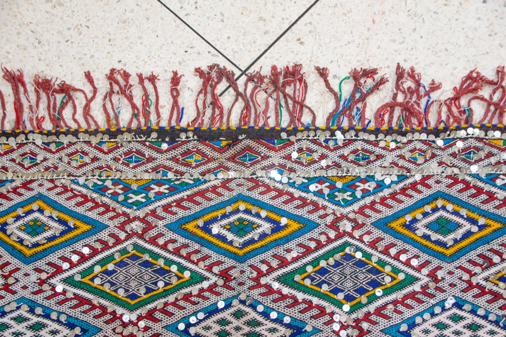 - Palette: Indigo/teal, olive, saffron, madder, ivory; wine-red fringe