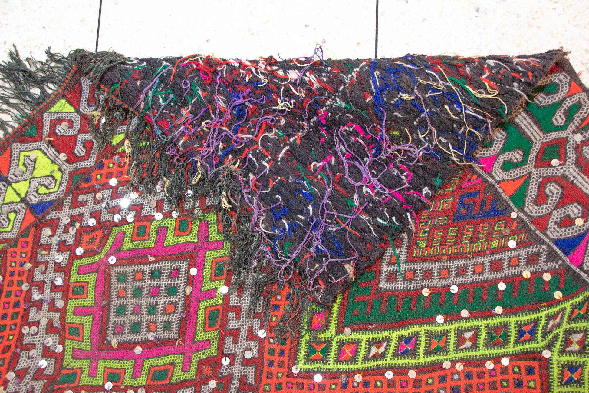 - Construction: Flatwoven kilim (henbel) with brocaded motifs and sequined details