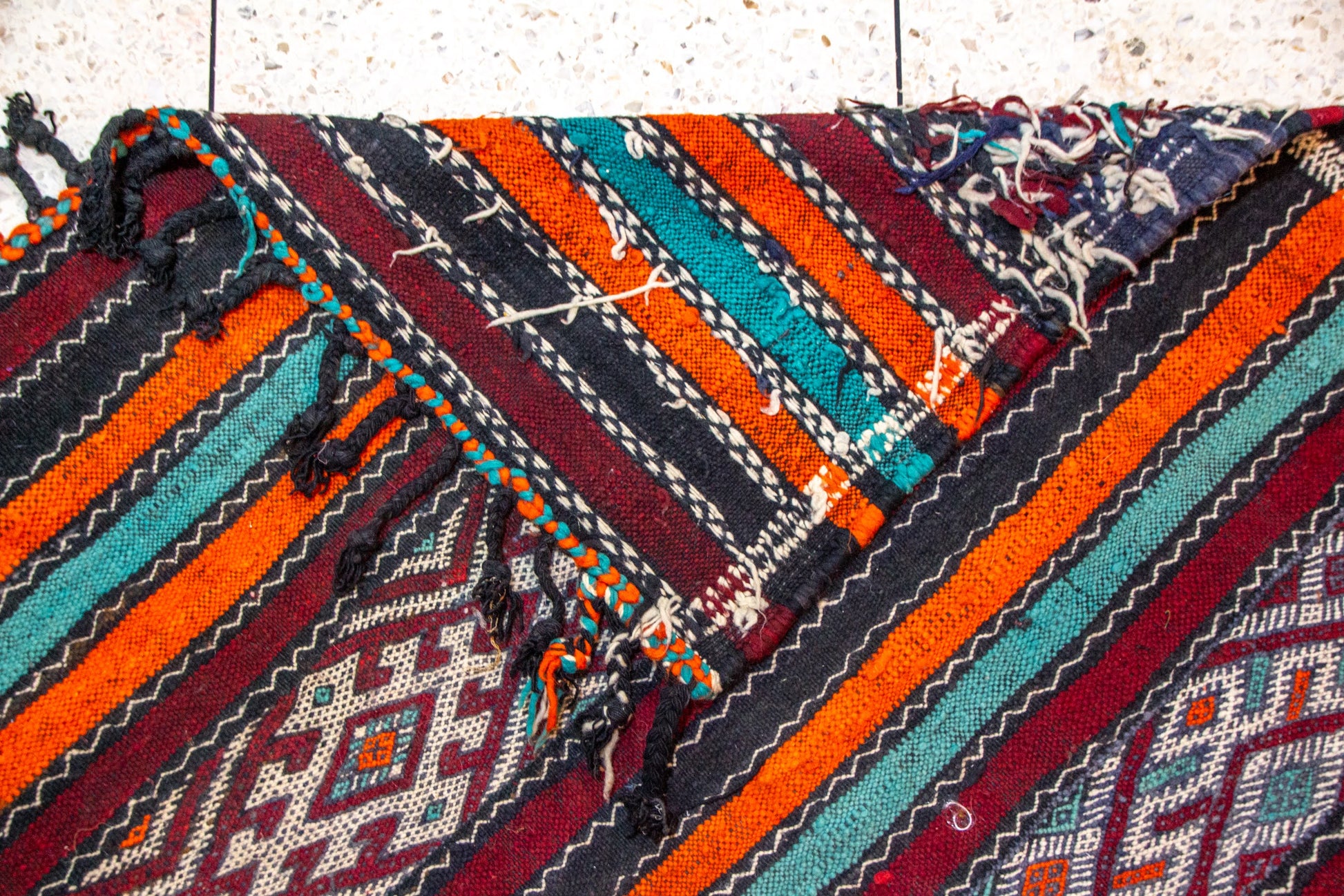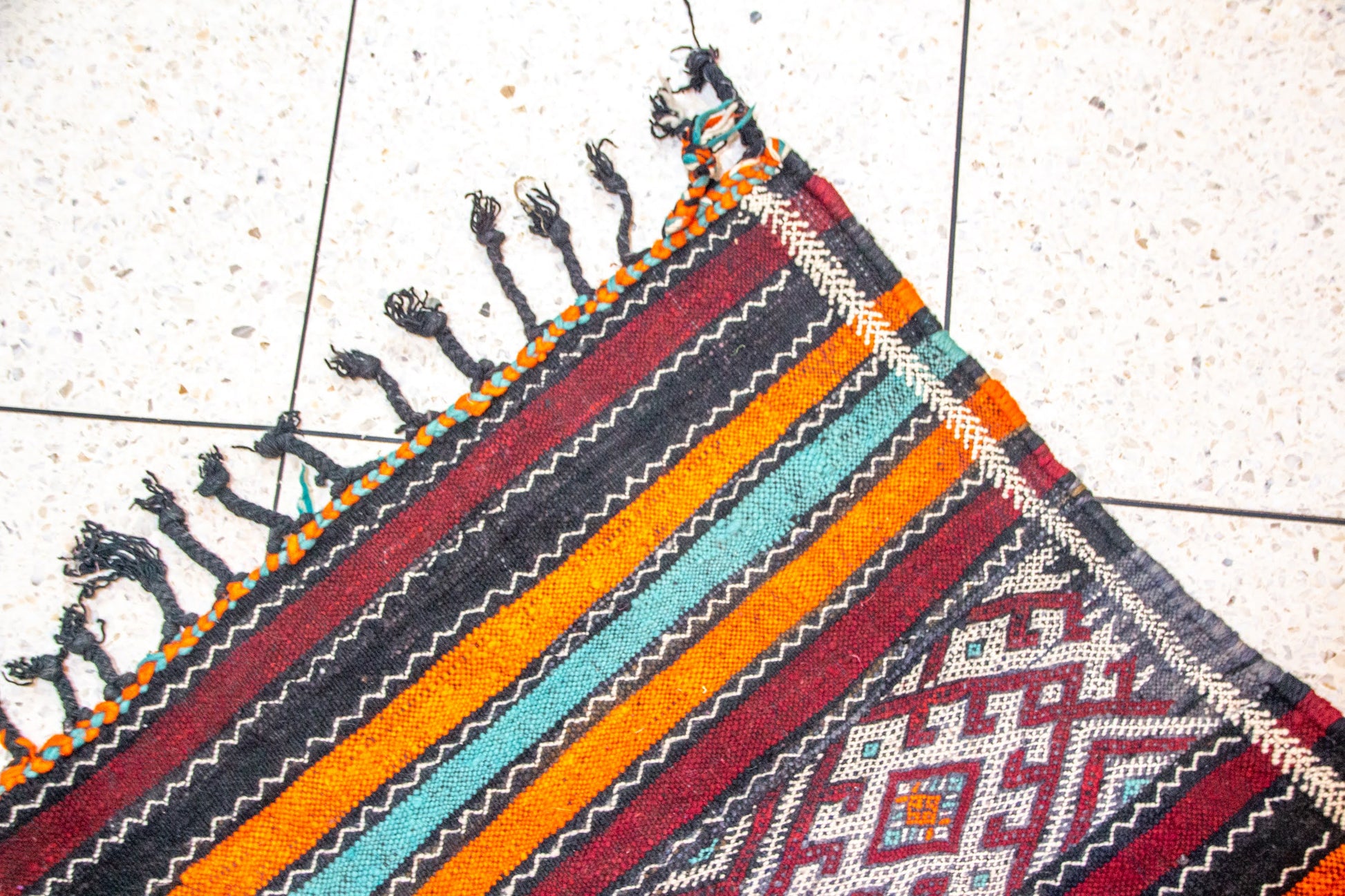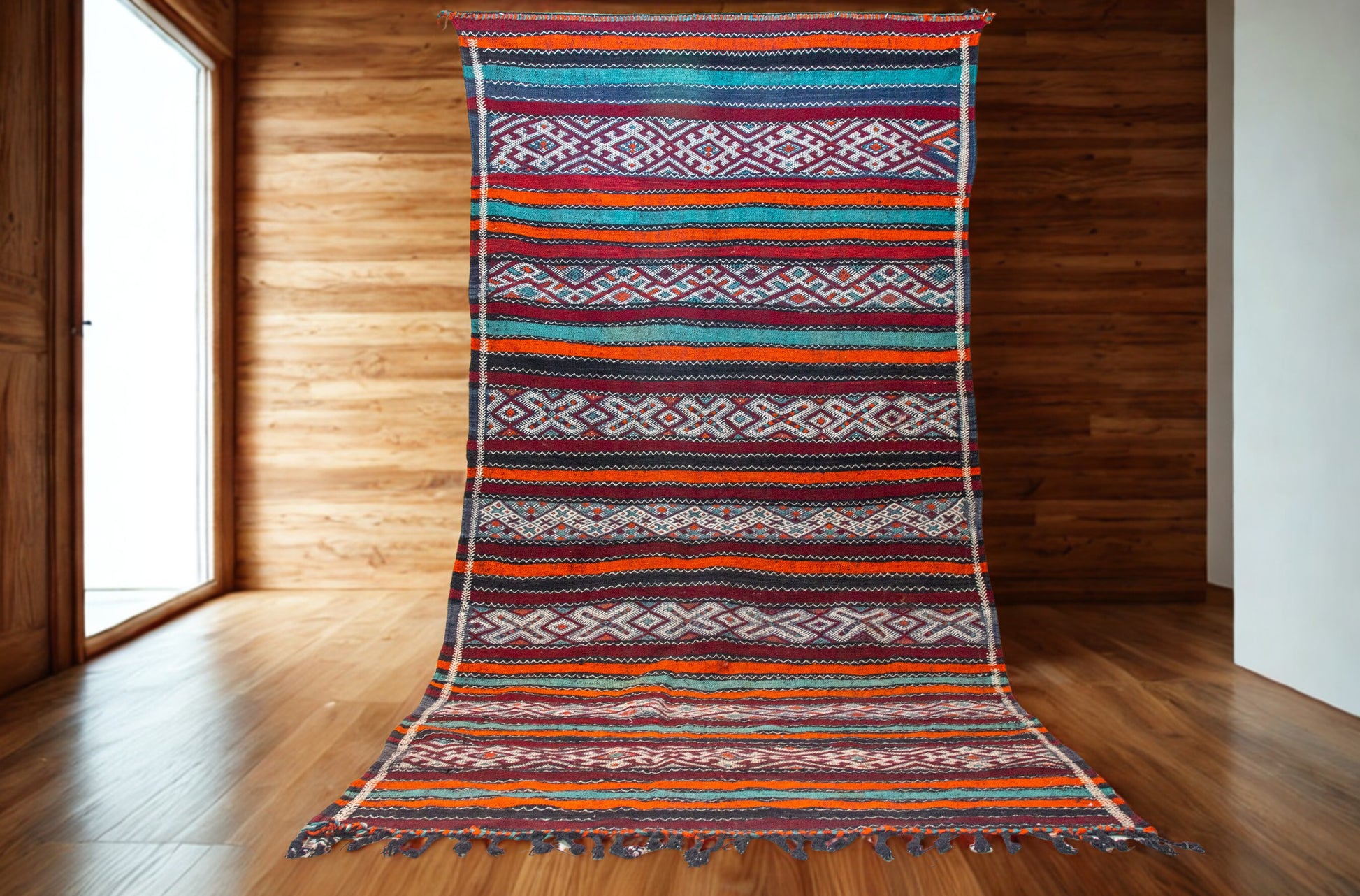 This Beni Mguild weaving embodies the architectural precision and chromatic audacity of the Middle Atlas. Its structured horizontal bands, rendered in deep crimson, emerald, and saffron, frame complex nested motifs, each a coded fragment of tribal identity. This is more than a rug: it is a woven cartography of memory, trade, and ritual continuity.