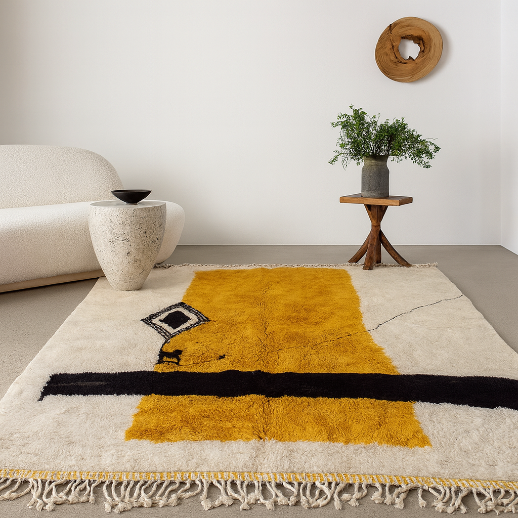 A contemporary Beni Mrirt statement from the Middle Atlas, where a luminous ivory ground hosts a bold ochre panel and inky horizontal band—minimalist geometry distilled to its essentials. A small nested lozenge and fine linear thread recall Amazigh talismanic registers, reframed through modernist composition.