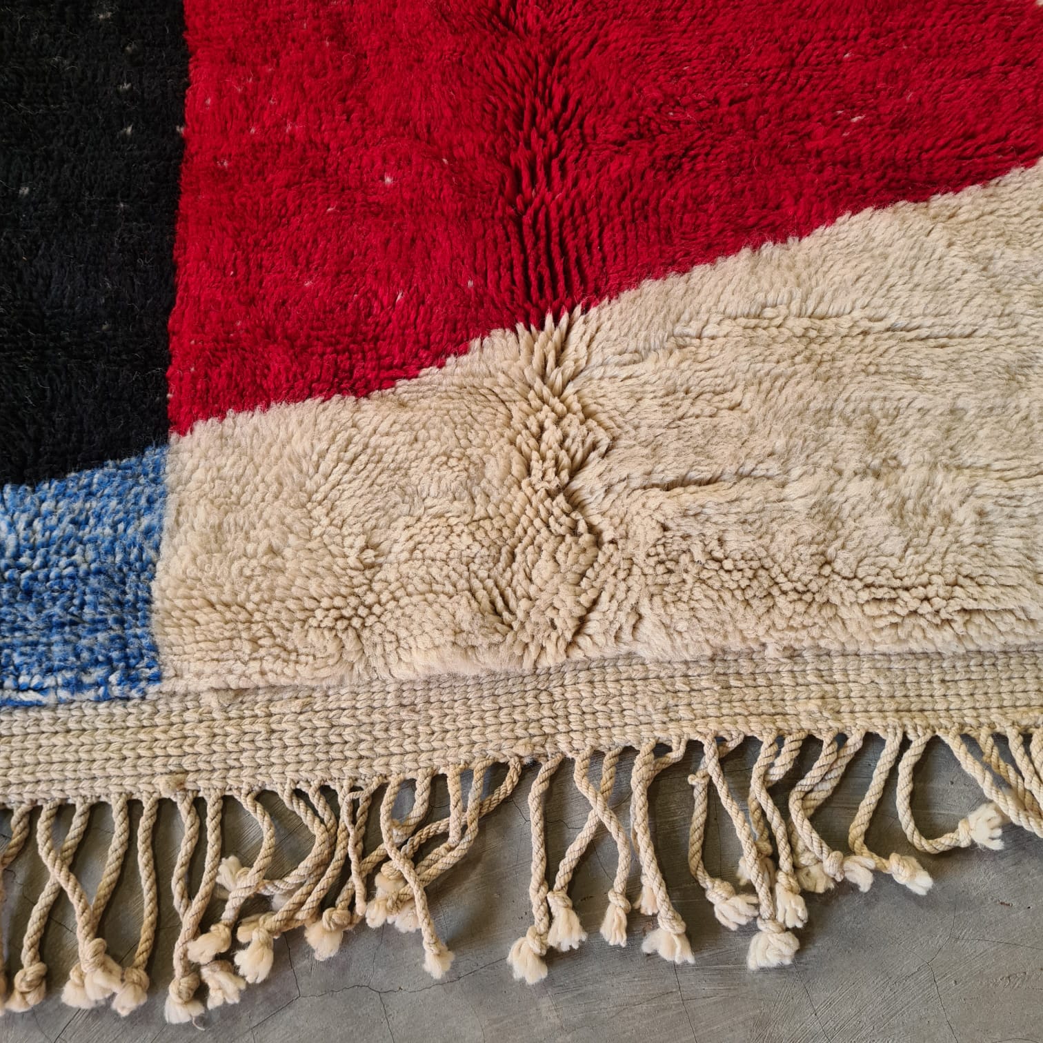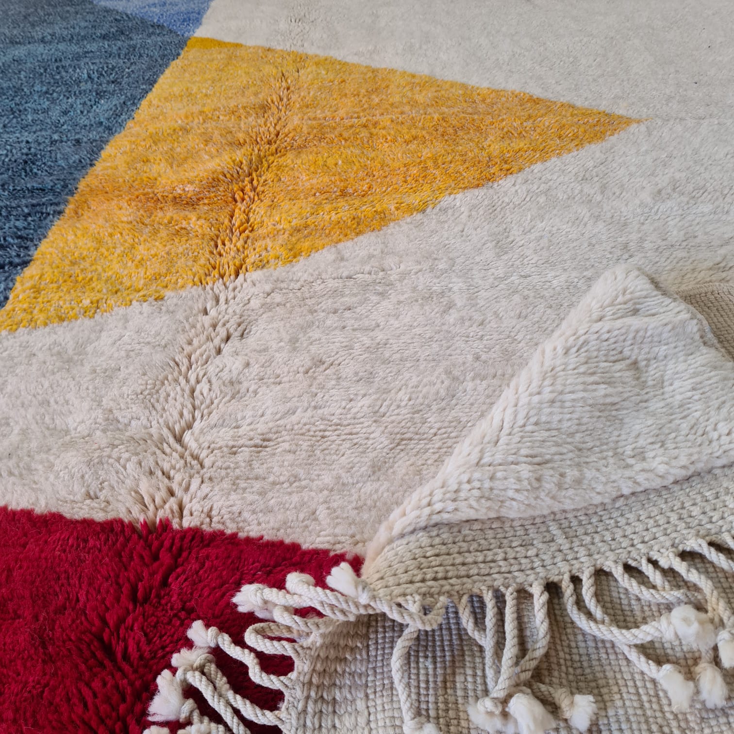 From the Middle Atlas highlands, a contemporary Beni Mrirt that reframes Amazigh geometry through modernist color planes: overlapping fields of indigo, sky, saffron, and carmine anchor a quiet ivory expanse. The composition reads like a painter’s study—angled forms in dynamic balance, grounded by a soft, luminous field.