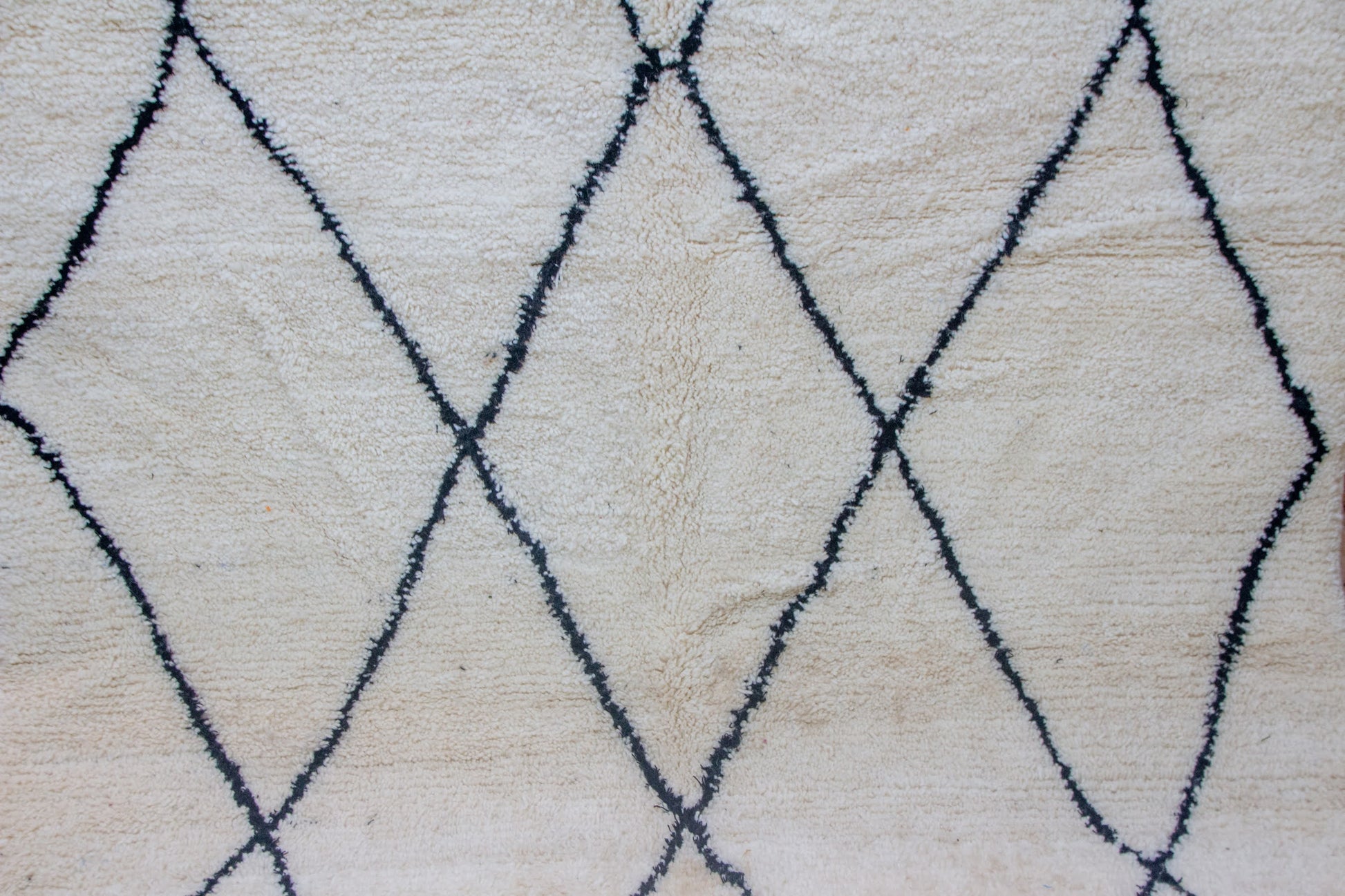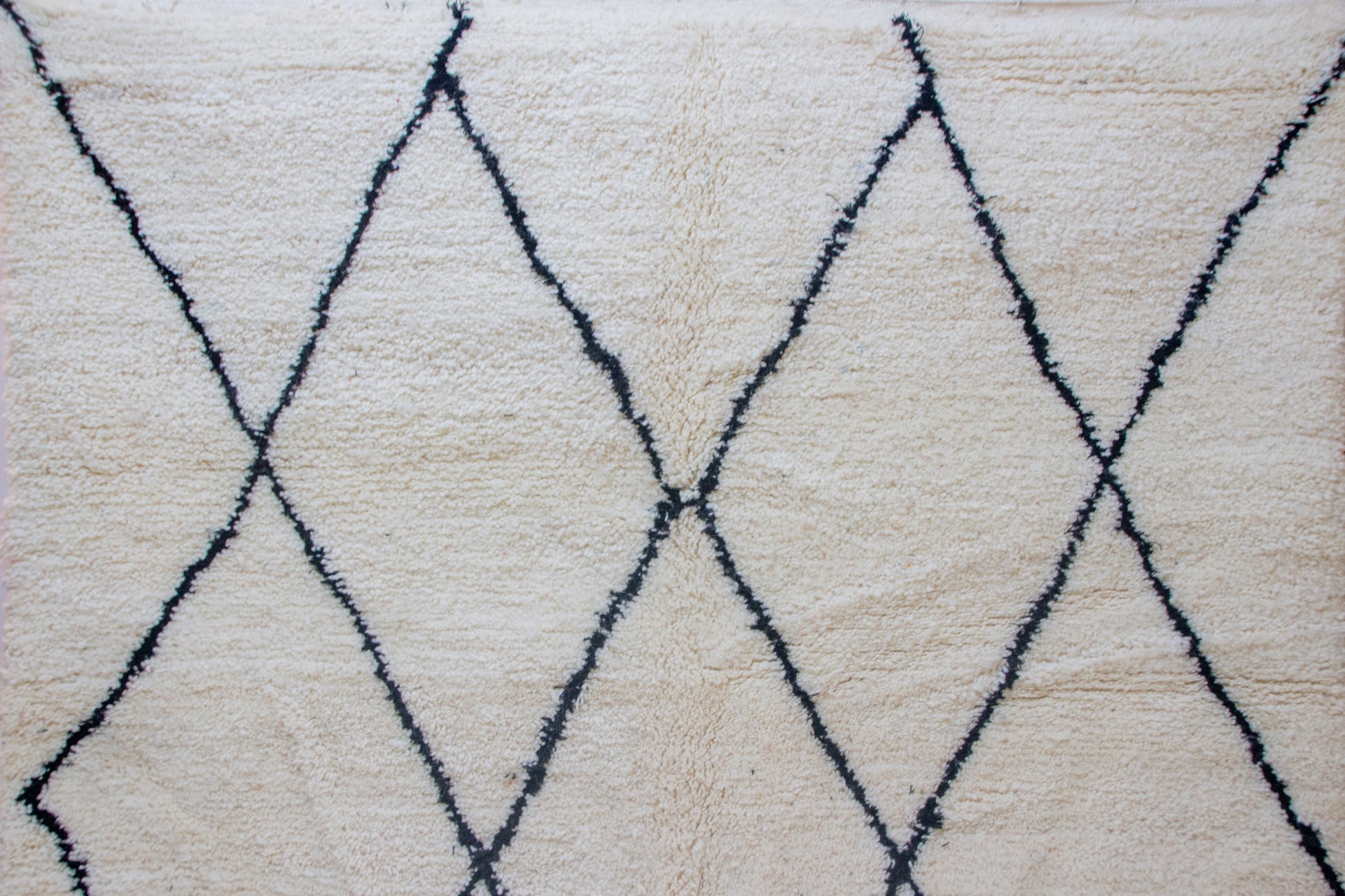 A quintessential Beni Ourain field in natural ivory, traversed by a generous, hand-drawn lozenge lattice in deep indigo-black. The expanded spacing and soft line-variation articulate the Amazigh grammar of protection and balance with quiet, architectural clarity.