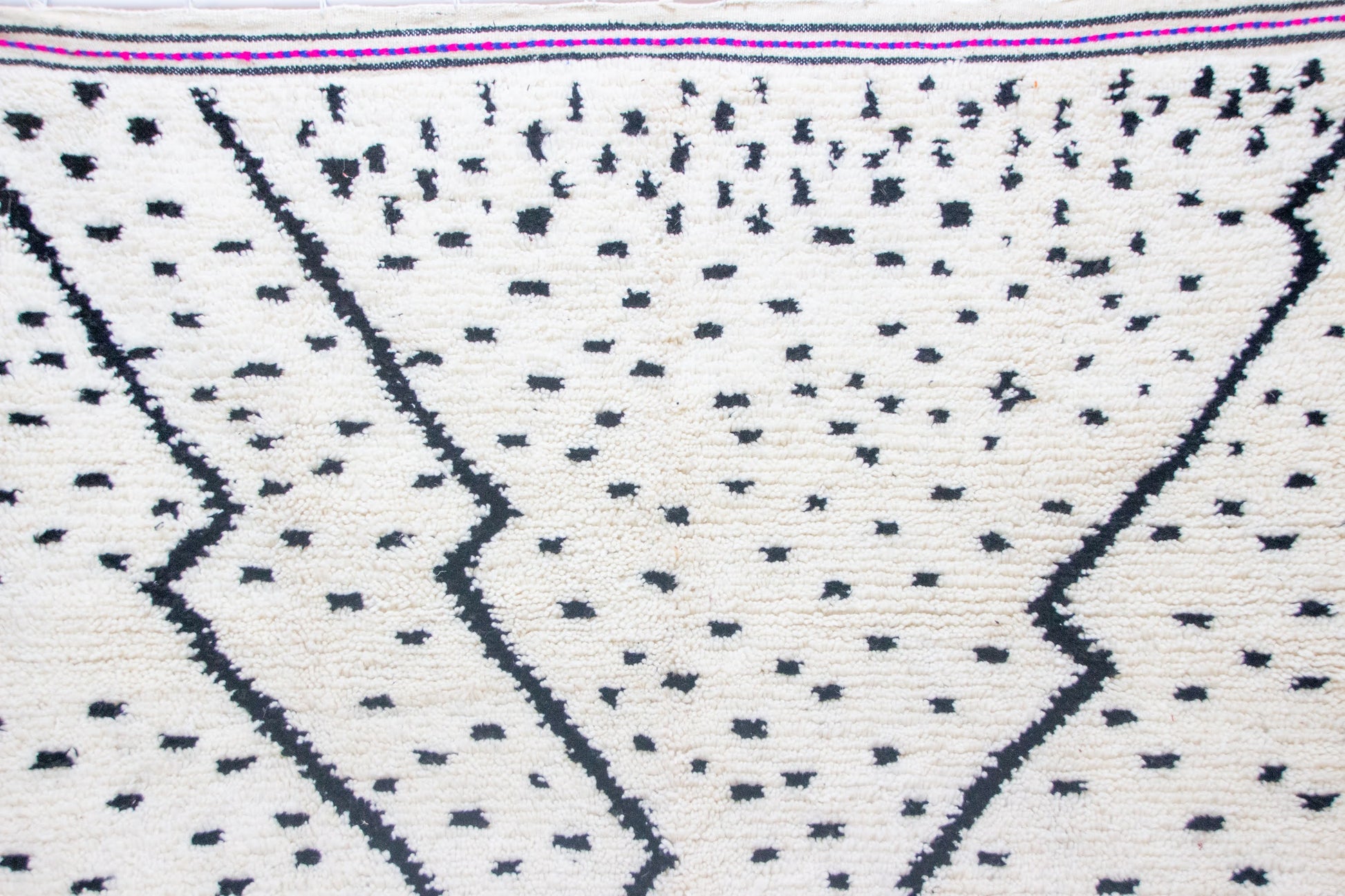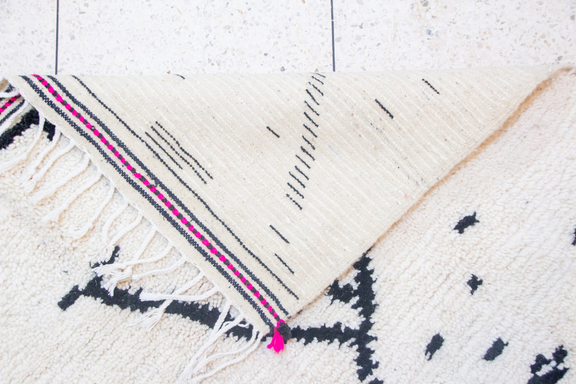 A quietly striking Beni Ourain on a creamy ivory ground. Charcoal lines sketch a graphic mountain–valley geometry, punctuated by scattered constellations—minimal, modern, and deeply rooted in High Atlas abstraction.