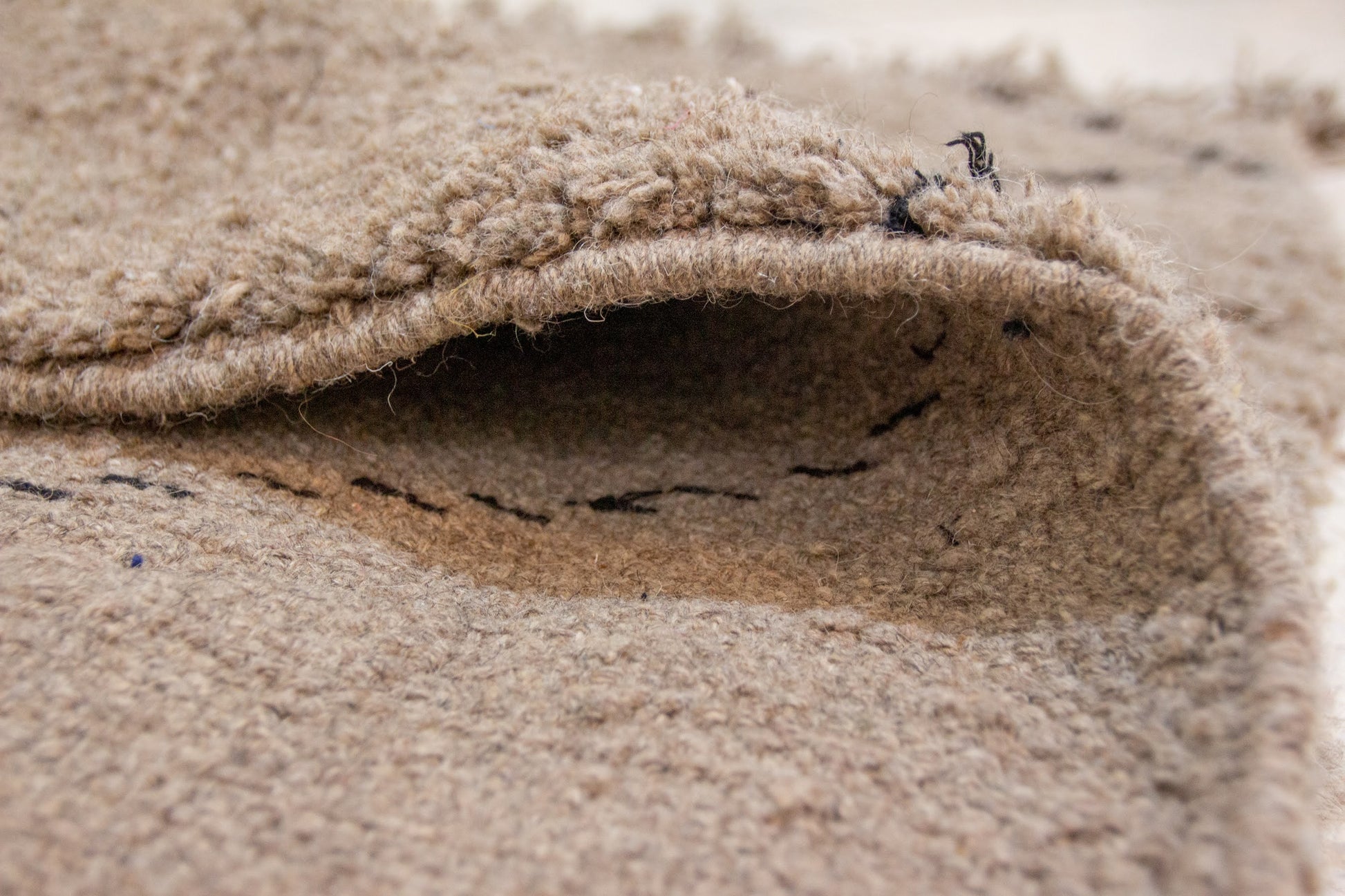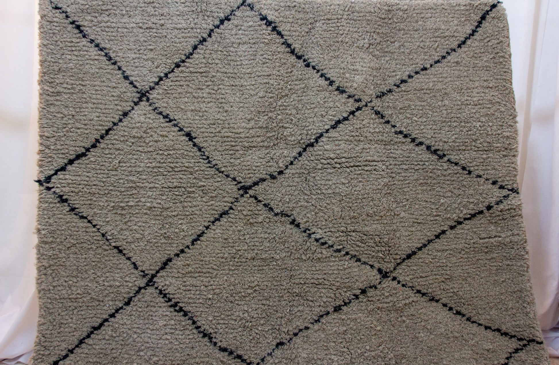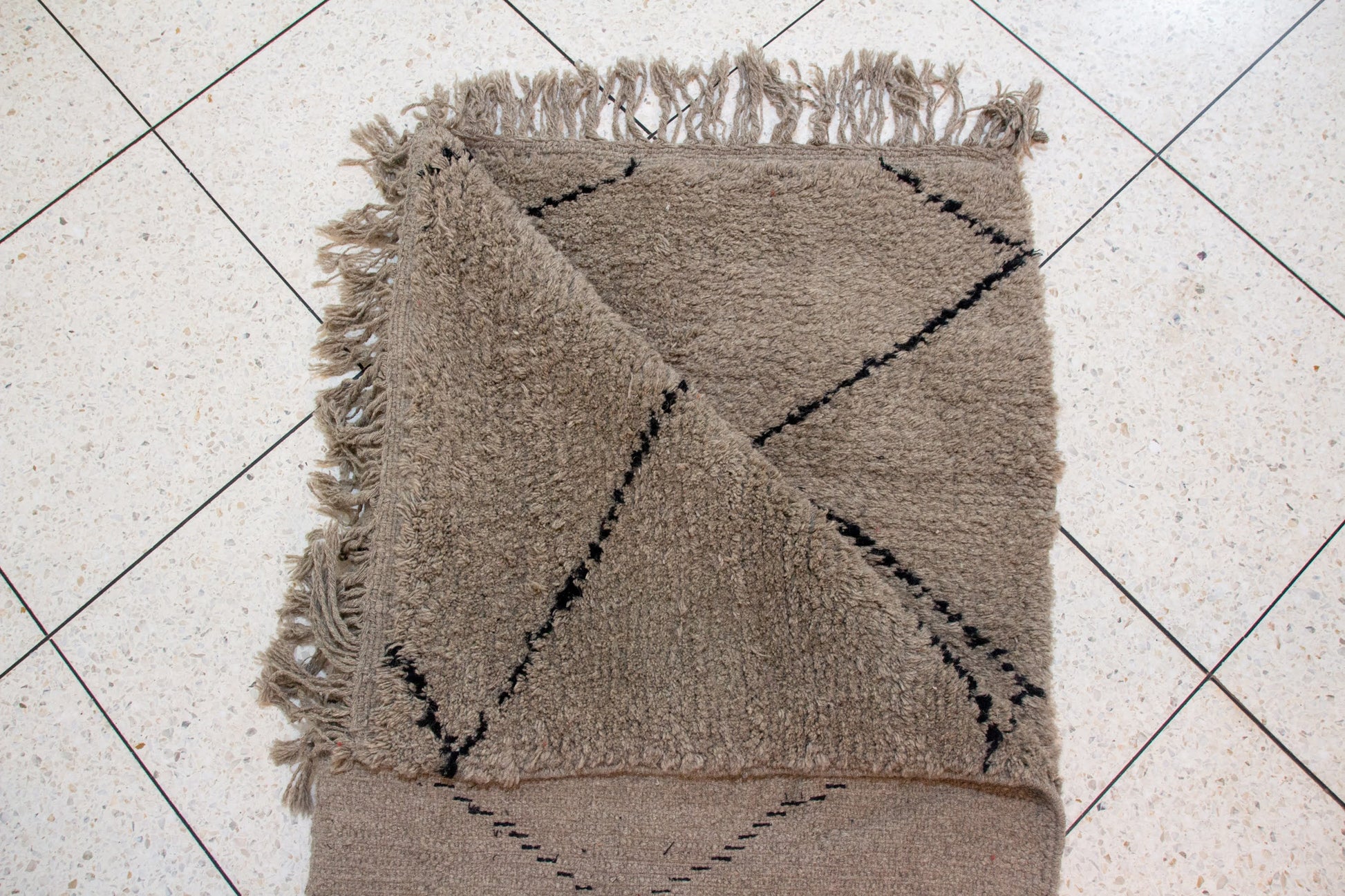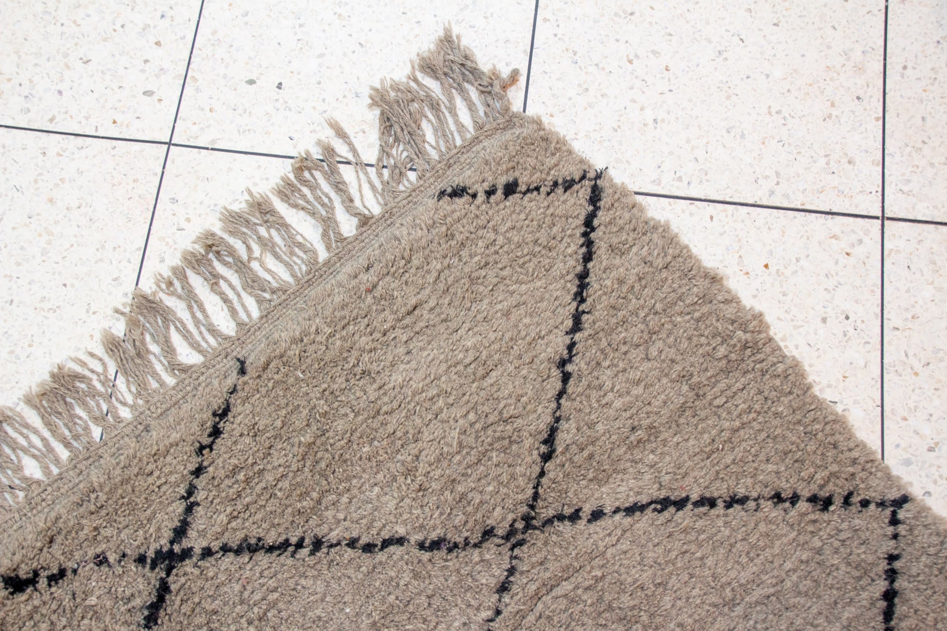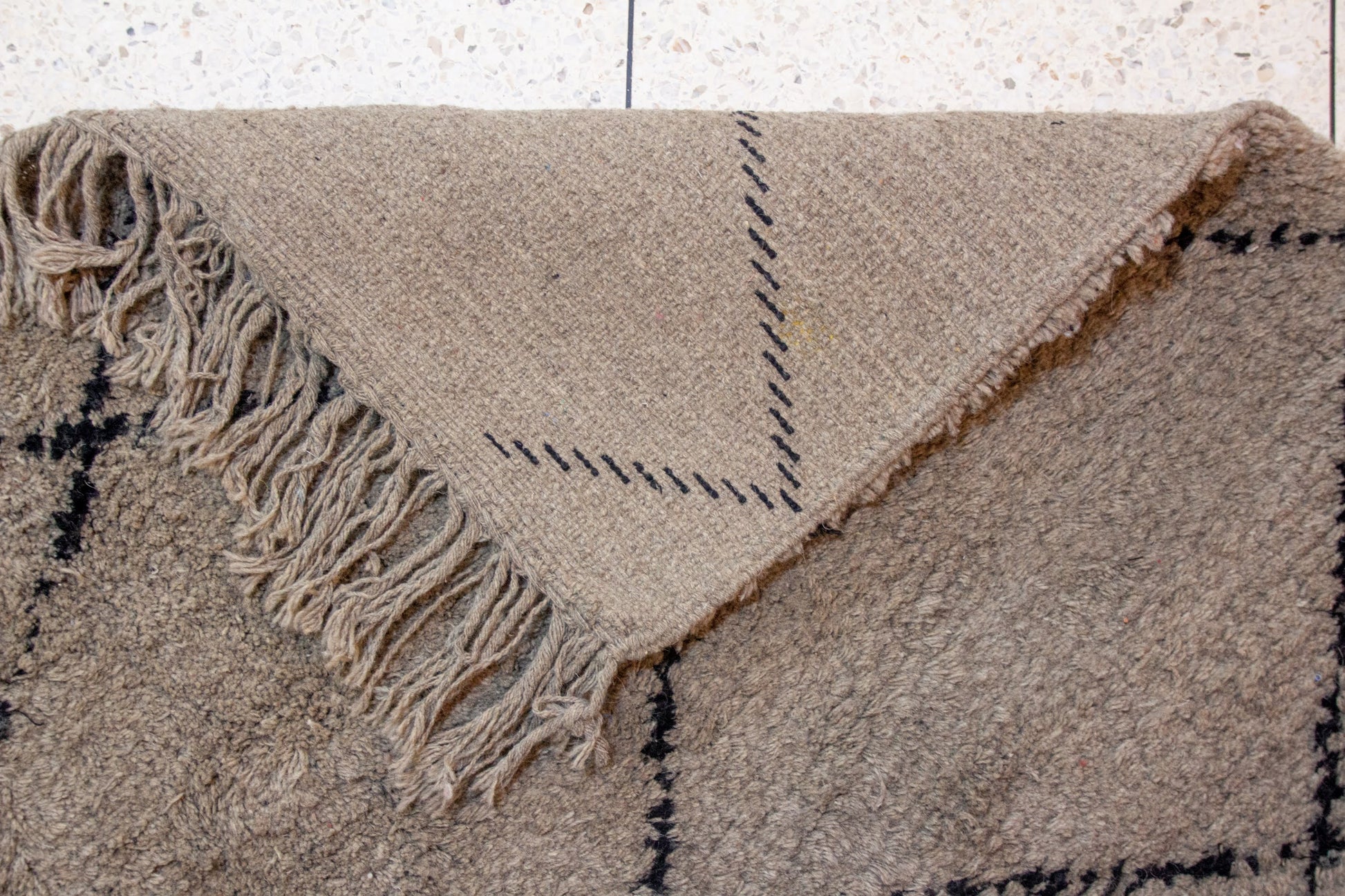 Classic Beni Ourain minimalism reimagined in a warm cocoa ground. A hand-drawn charcoal diamond lattice drifts across the plush field, ending in tonal fringe. Understated contrast, timeless Amazigh geometry.