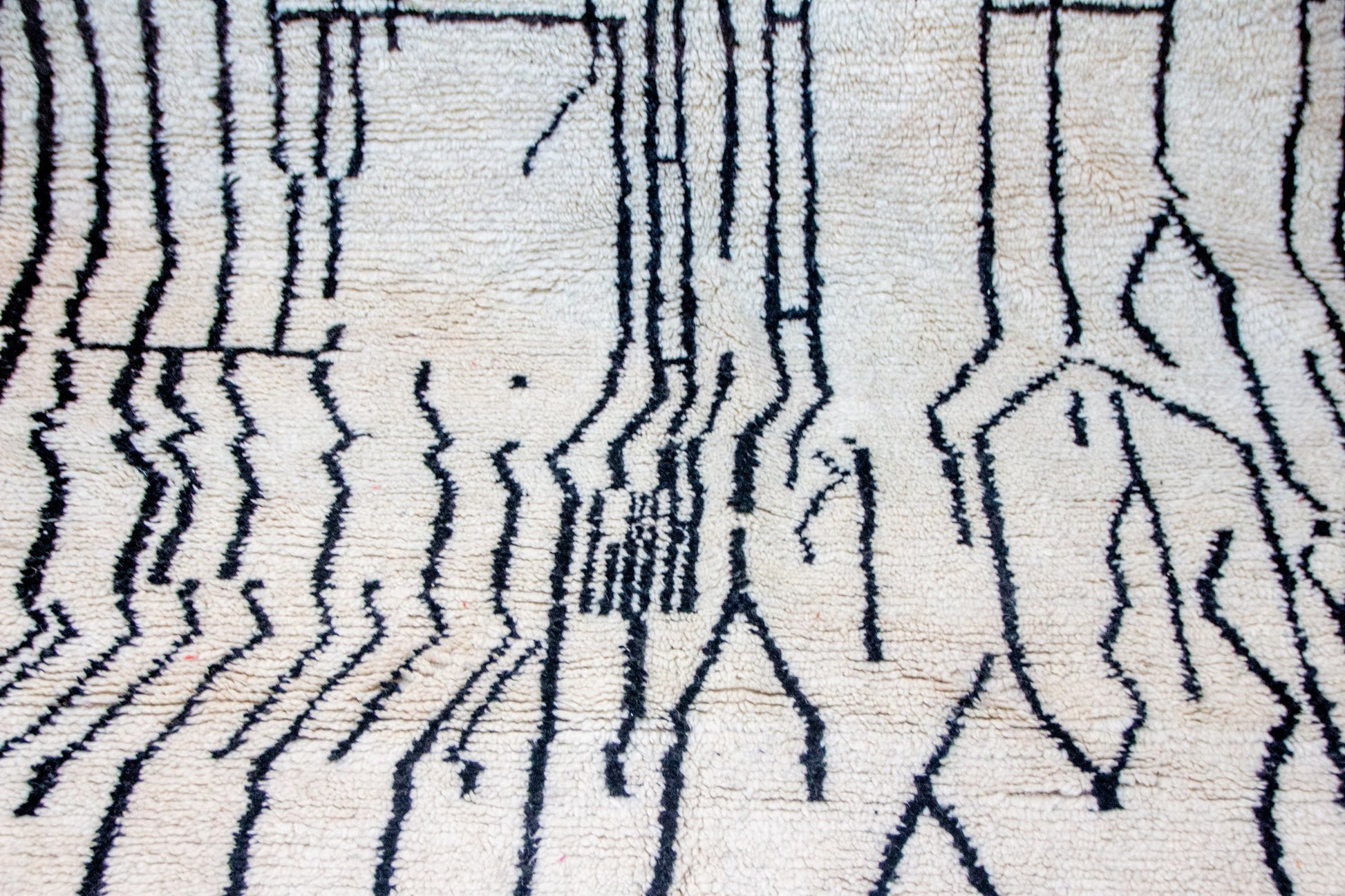 Hand-knotted Beni Ourain from Morocco’s Middle Atlas. An ivory ground is traversed by meandering ink-dark lines that climb like slender trunks and branch into roots at the base—an organic take on Amazigh geometry that feels both minimalist and expressive.