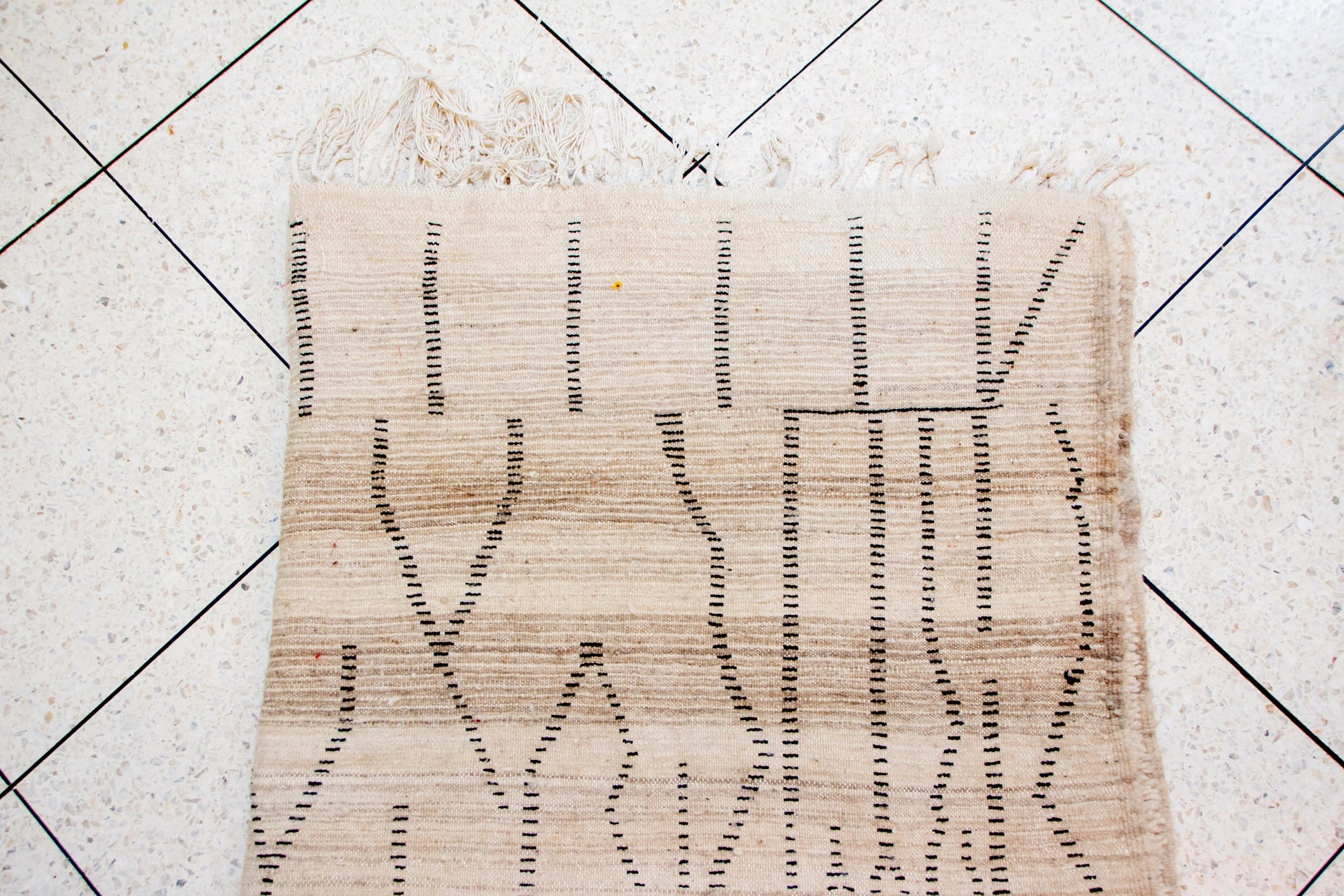 This rug is an original sample from our weaving workshop. Every stitch is handcrafted using undyed or plant-dyed wool sourced from the Atlas. The motifs, symbols, and size can all be reimagined to reflect your own vision.