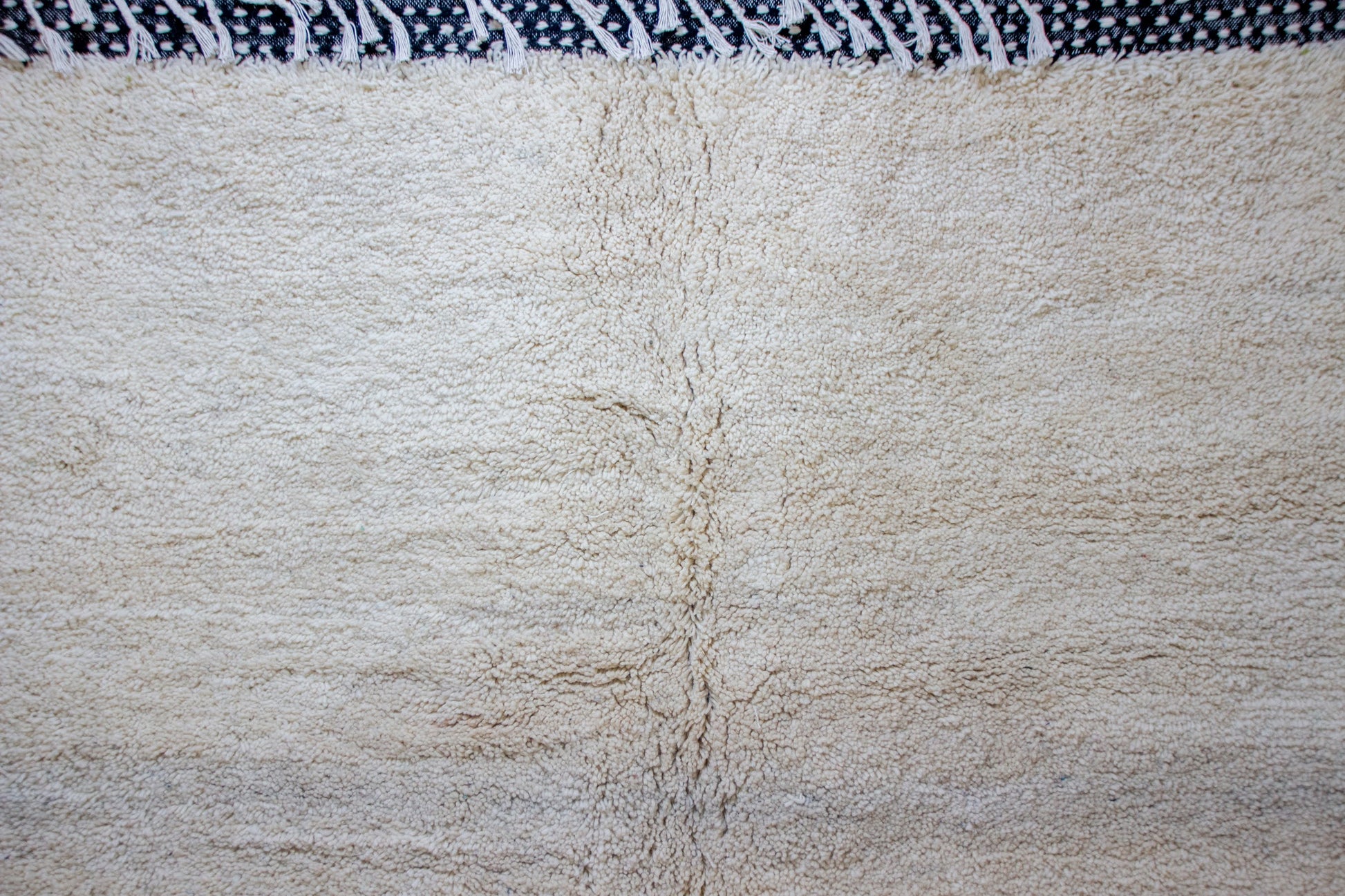 A serene, room-sized Beni Ourain in natural ivory with gentle horizontal abrash and a soft central spine. Framed by woven indigo-and-ivory checker bands and fringed ends—quiet luxury with timeless Amazigh simplicity.