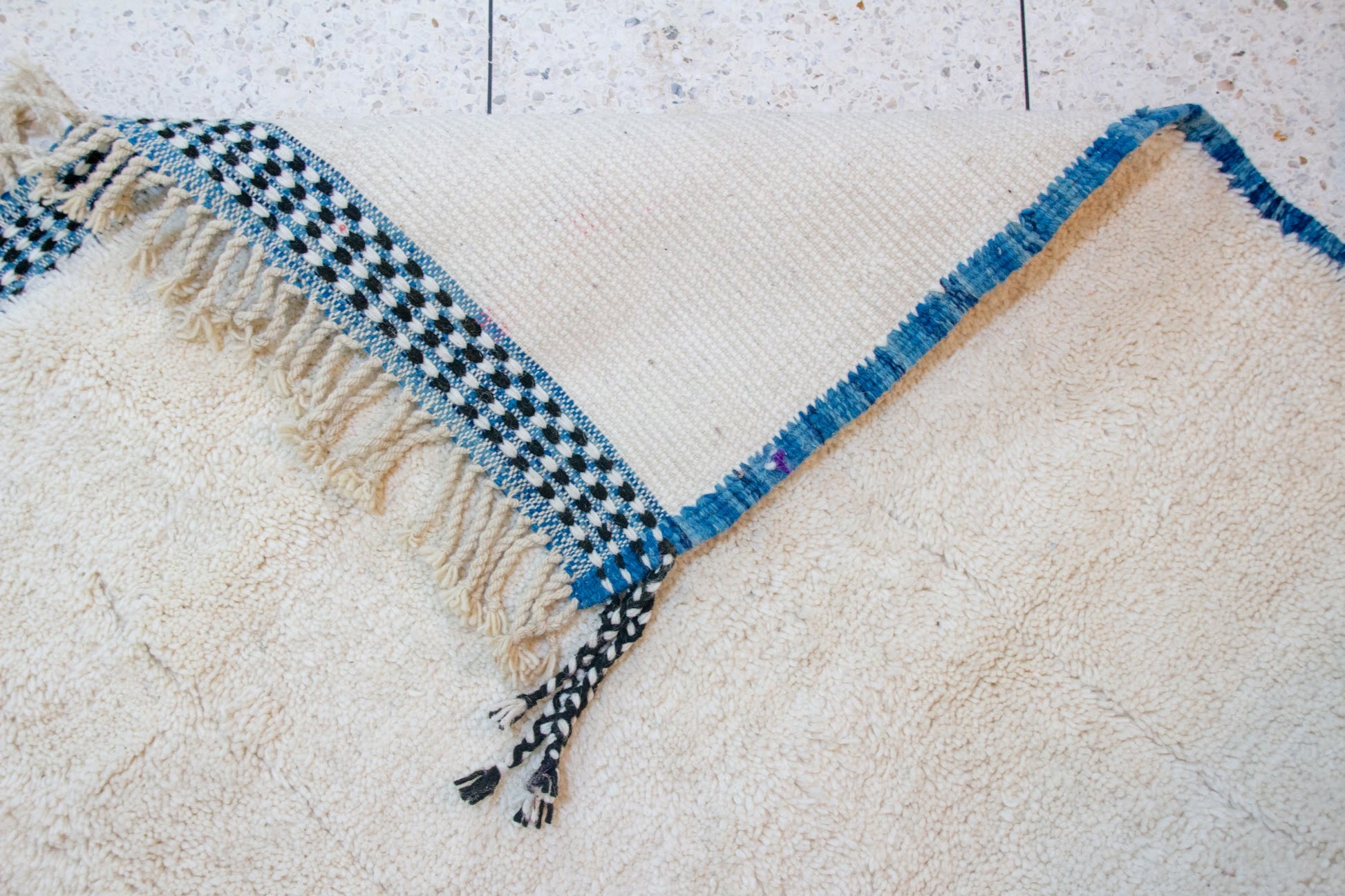 Beni Ourain Pile Rug — Ivory Field with Indigo Check Guard Bands