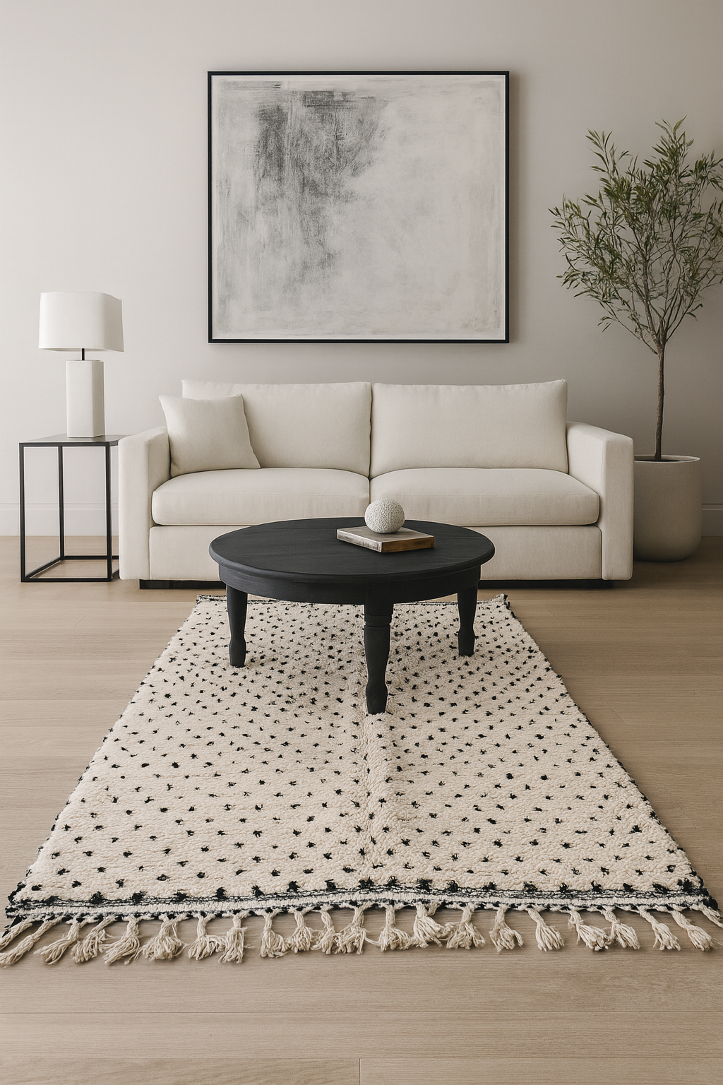 A luminous Beni Ourain composition from the Middle Atlas, defined by its ivory ground dispersed with charcoal tuft “constellations.” The restrained, all-over field reads like night snow under starlight—quiet, graphic, and profoundly architectural. A banded selvedge and hand-twisted fringe anchor the piece with traditional Amazigh finishing.