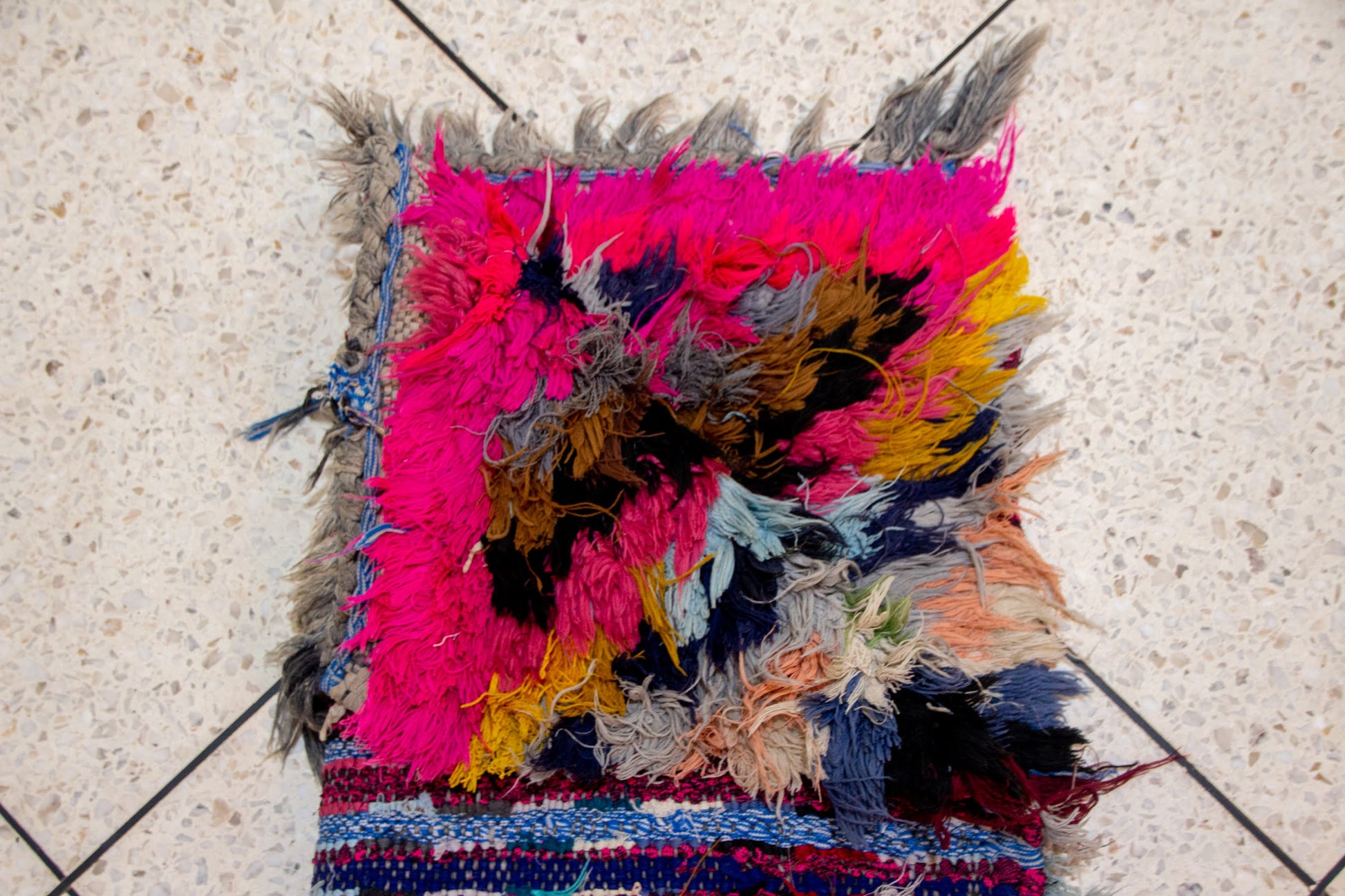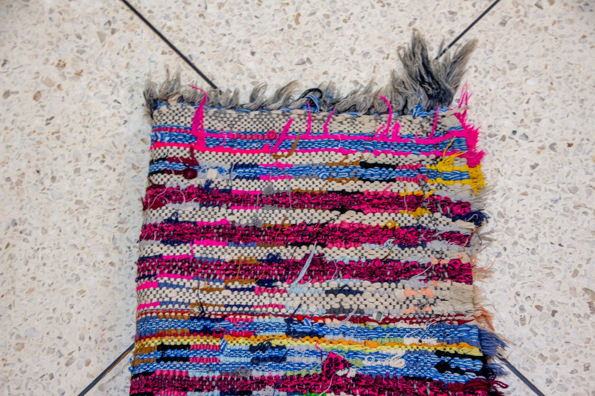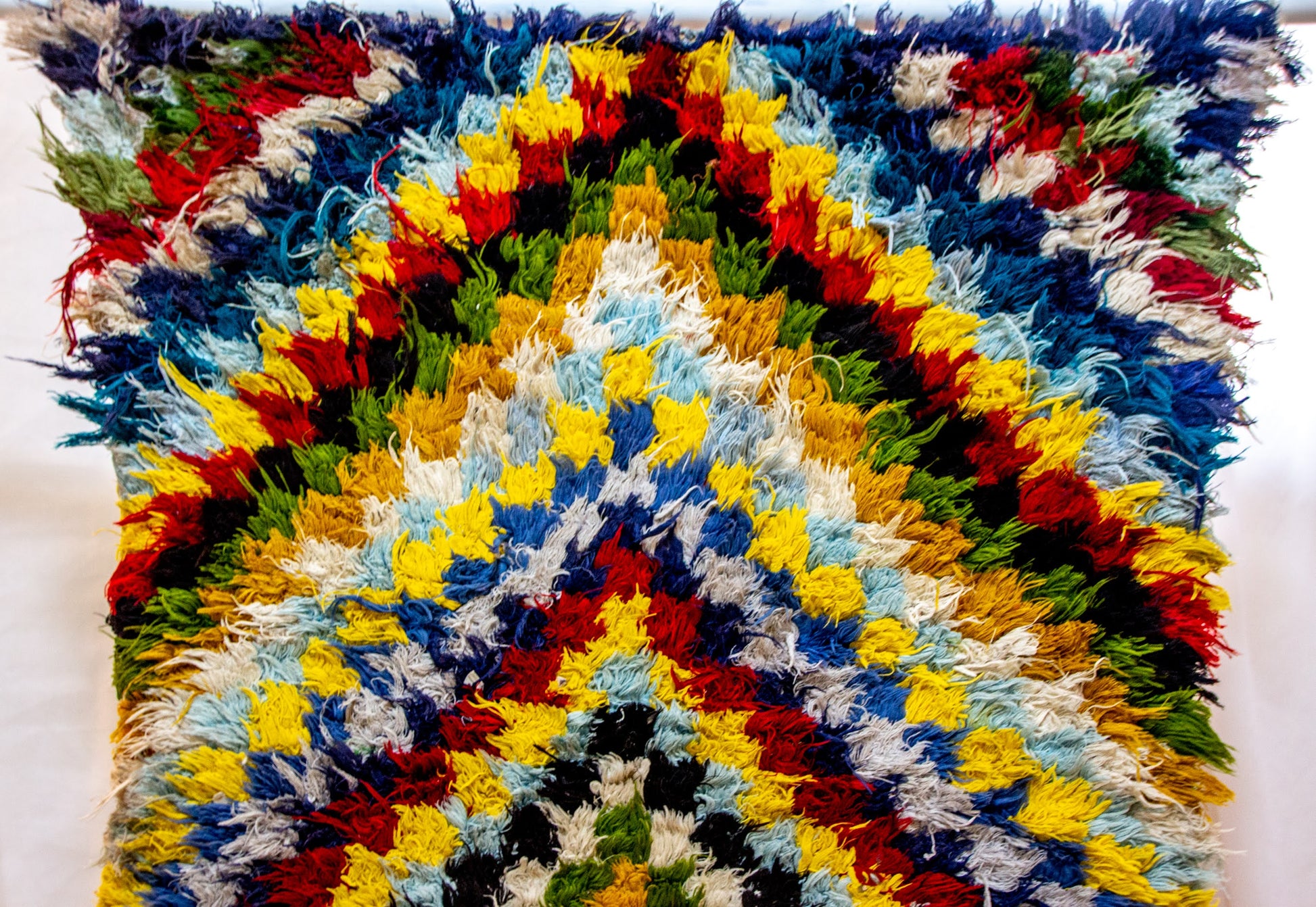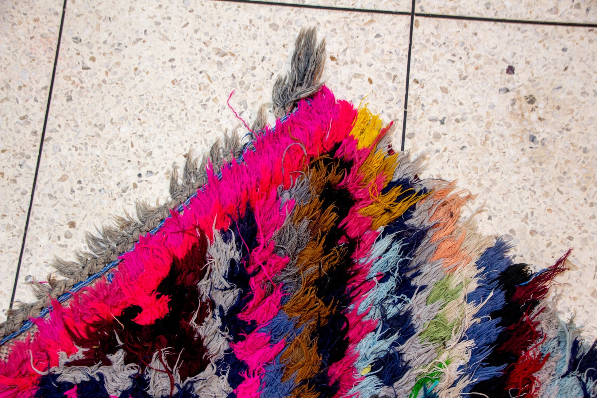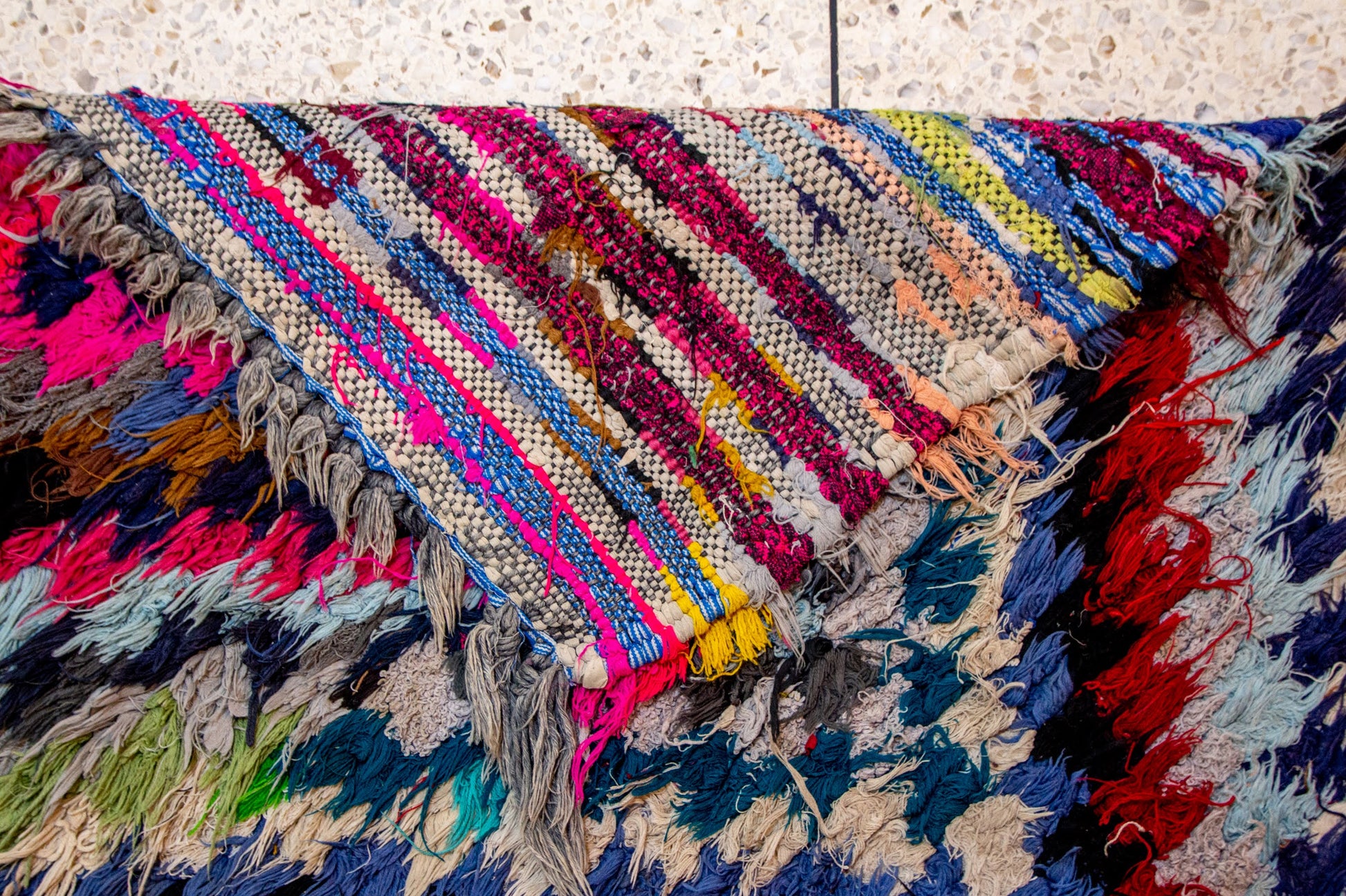 A kinetic boucherouite runner fashioned from reclaimed textiles, organized as stacked chevron “V” bands that ripple the length of the piece. Lemon, cobalt, jade, charcoal, blush, and flashes of fuchsia create a lively, tactile cascade—Amazigh improvisation made architectural.