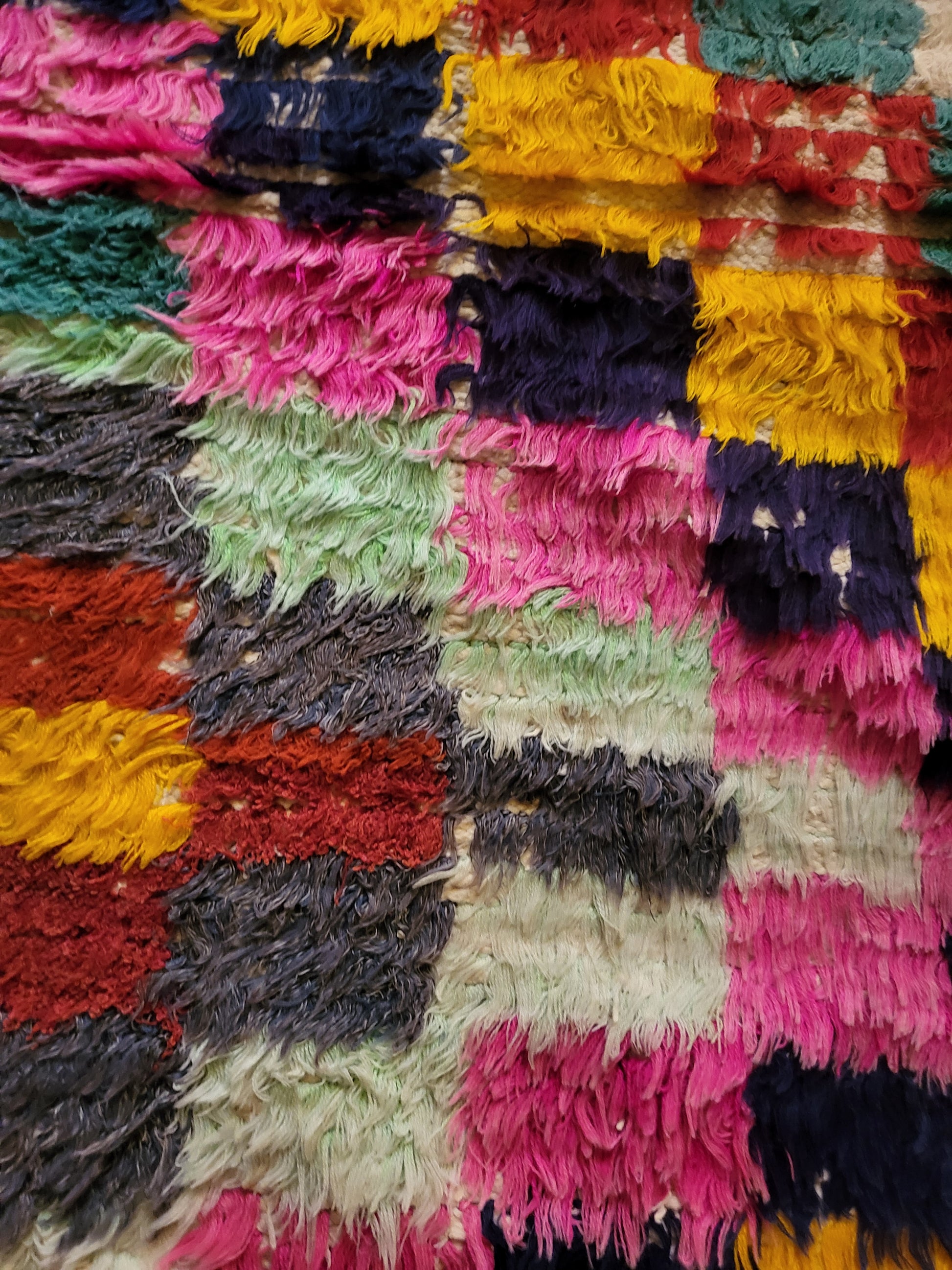A luminous boucherouite runner woven from recycled textiles, forming a checkerboard symphony of chromatic squares that coalesce into subtle diamond echoes. Each hue — crimson, ochre, turquoise, lilac, and ivory — evokes a fragment of Morocco’s visual memory, reframed for the modern interior.