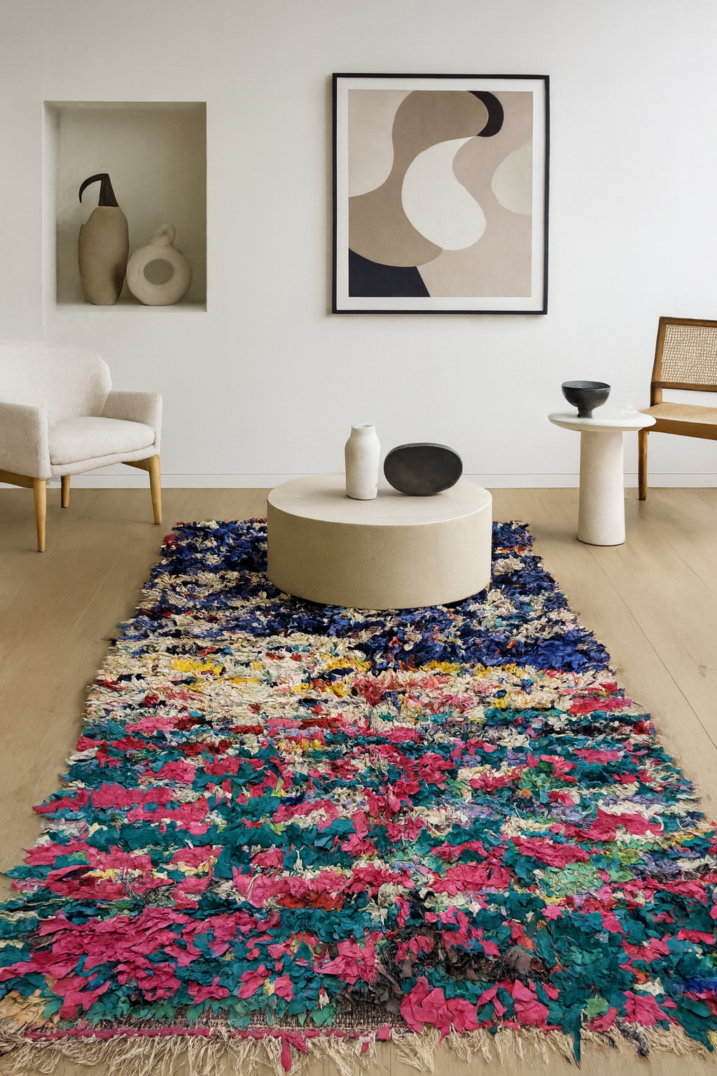 Waste transfigured: an upcycled atlas of color and touch—joyfully sustainable, unmistakably Moroccan.