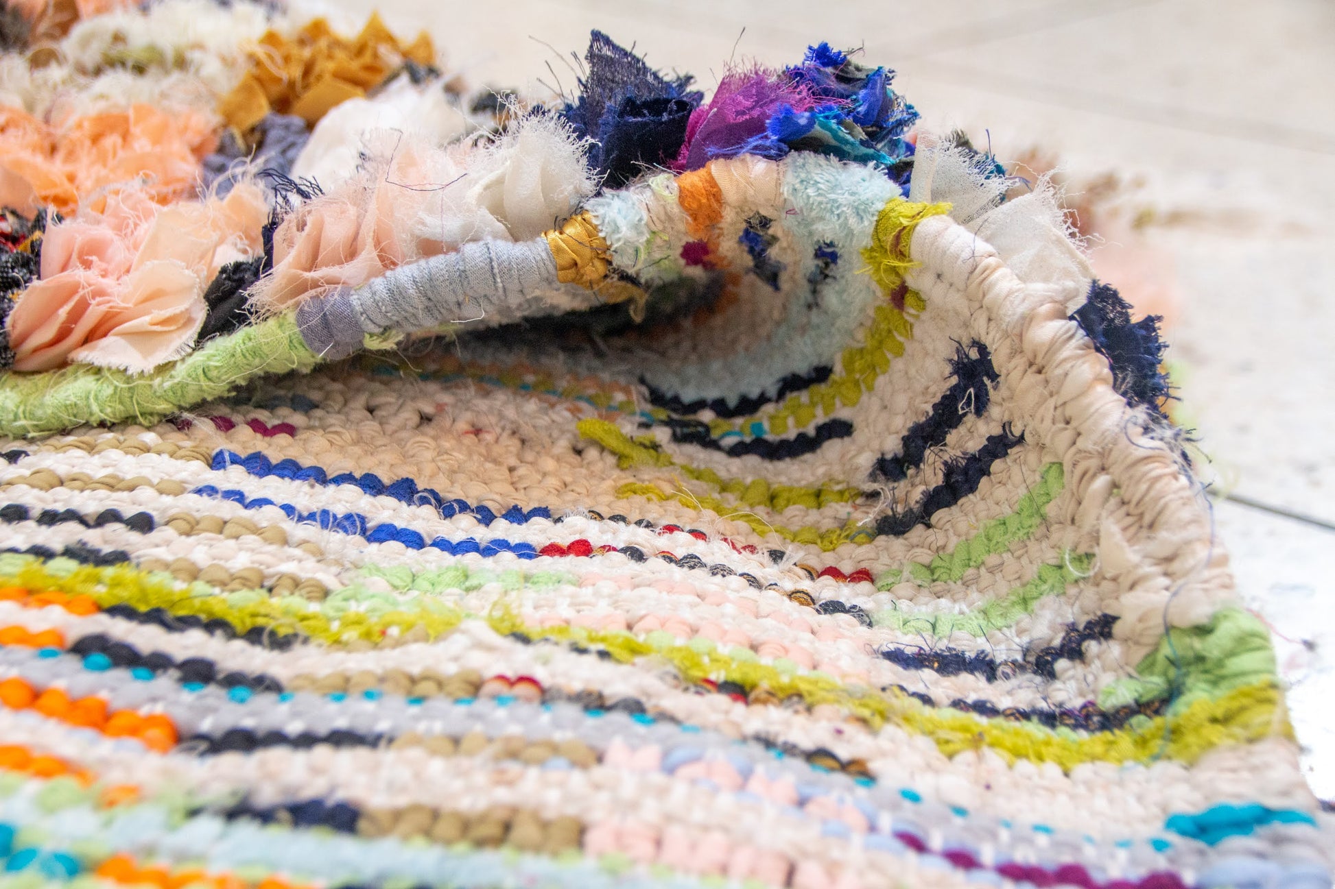 Hand-knotted rag pile on a sturdy cotton foundation. Plush, high-texture surface with soft, variegated tufts that animate the pattern and invite tactile exploration.