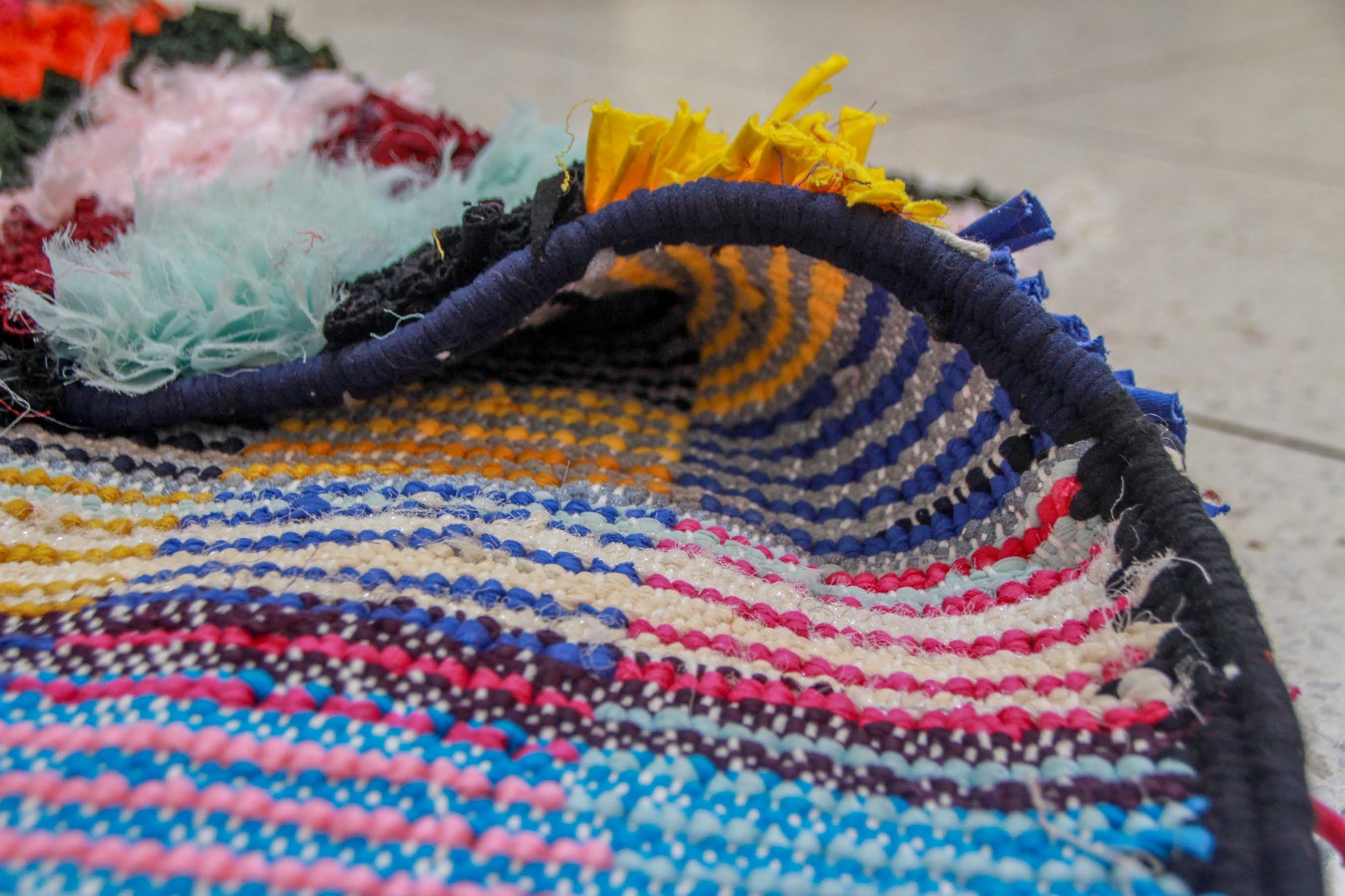 Hand-knotted rag pile on a sturdy cotton foundation. Dense, soft tufts with natural variegation create a cushioned surface alive with texture and chromatic depth.