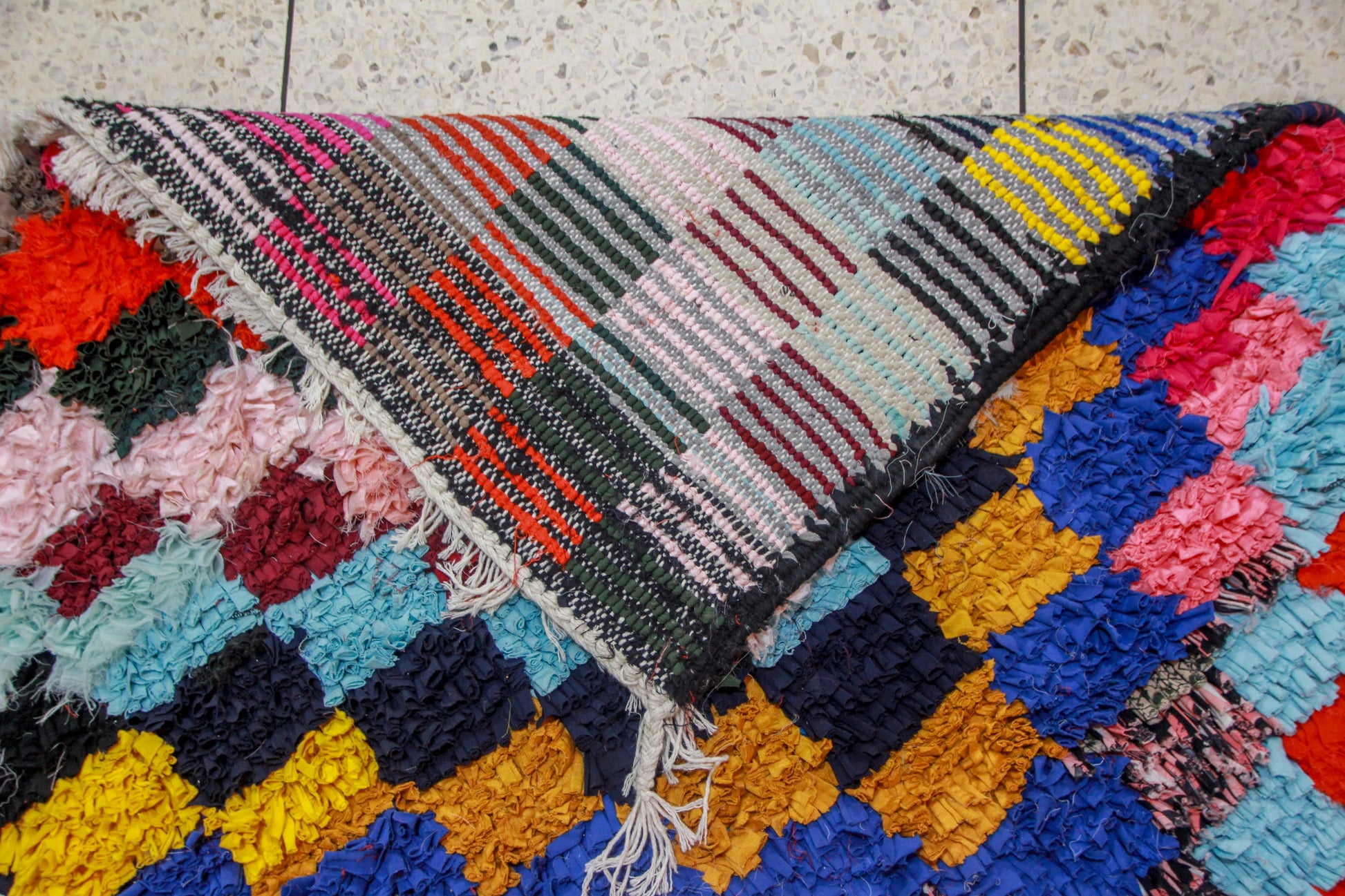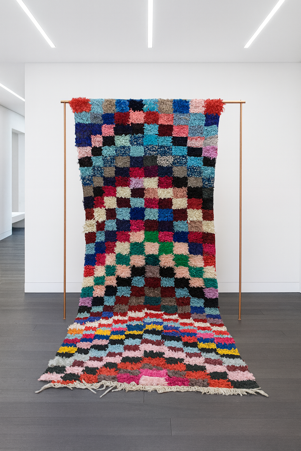 A joyful boucherouite runner composed from reclaimed fabrics, arranged in a plush checkerboard of saturated hues—cerulean, magenta, saffron, jade, charcoal, ivory, and blush. Each square reads like a jeweled tessera, forming a tactile mosaic that celebrates Amazigh improvisation and the poetics of reuse.
