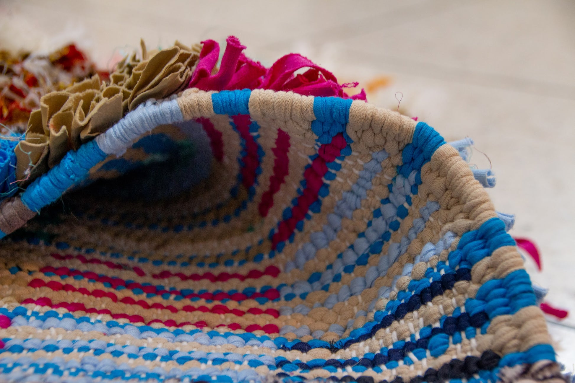 A colorful patchwork of saved textiles—woven improvisation turned into a radiant path.