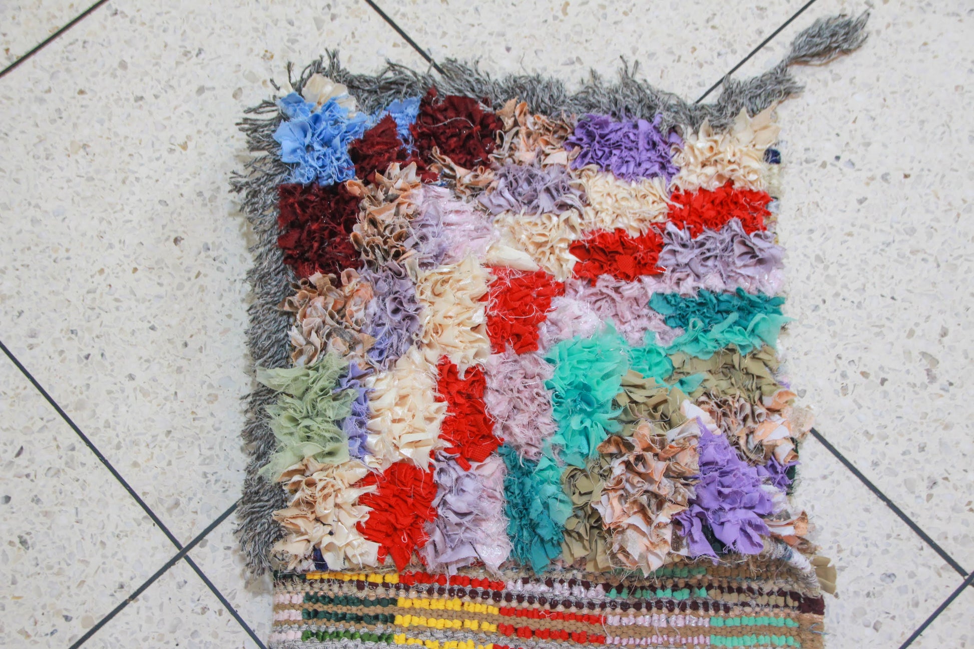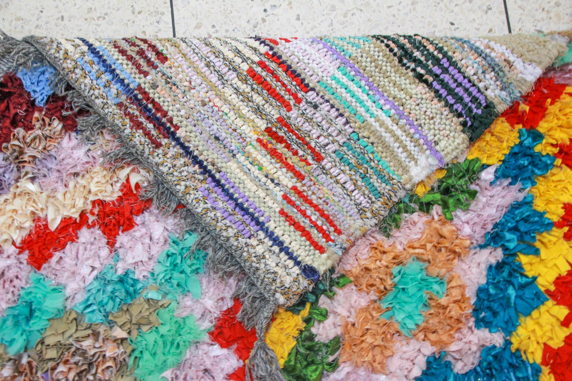A jubilant boucherouite runner pieced from reclaimed textiles, forming a prism of checker-squares that gather into concentric rosettes along the field. The exuberant palette—carmine, saffron, turquoise, lilac, cobalt, and ivory—celebrates Amazigh ingenuity and the poetics of reuse.