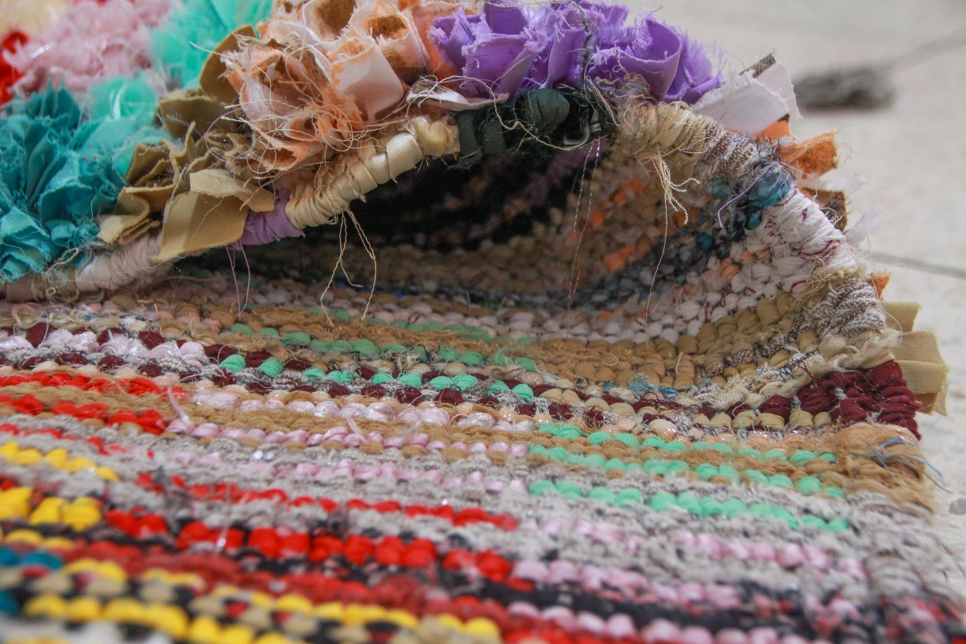- Vacuum with suction only (no rotating brush). Spot-clean gently; professional cleaning recommended for rag-pile weaves.