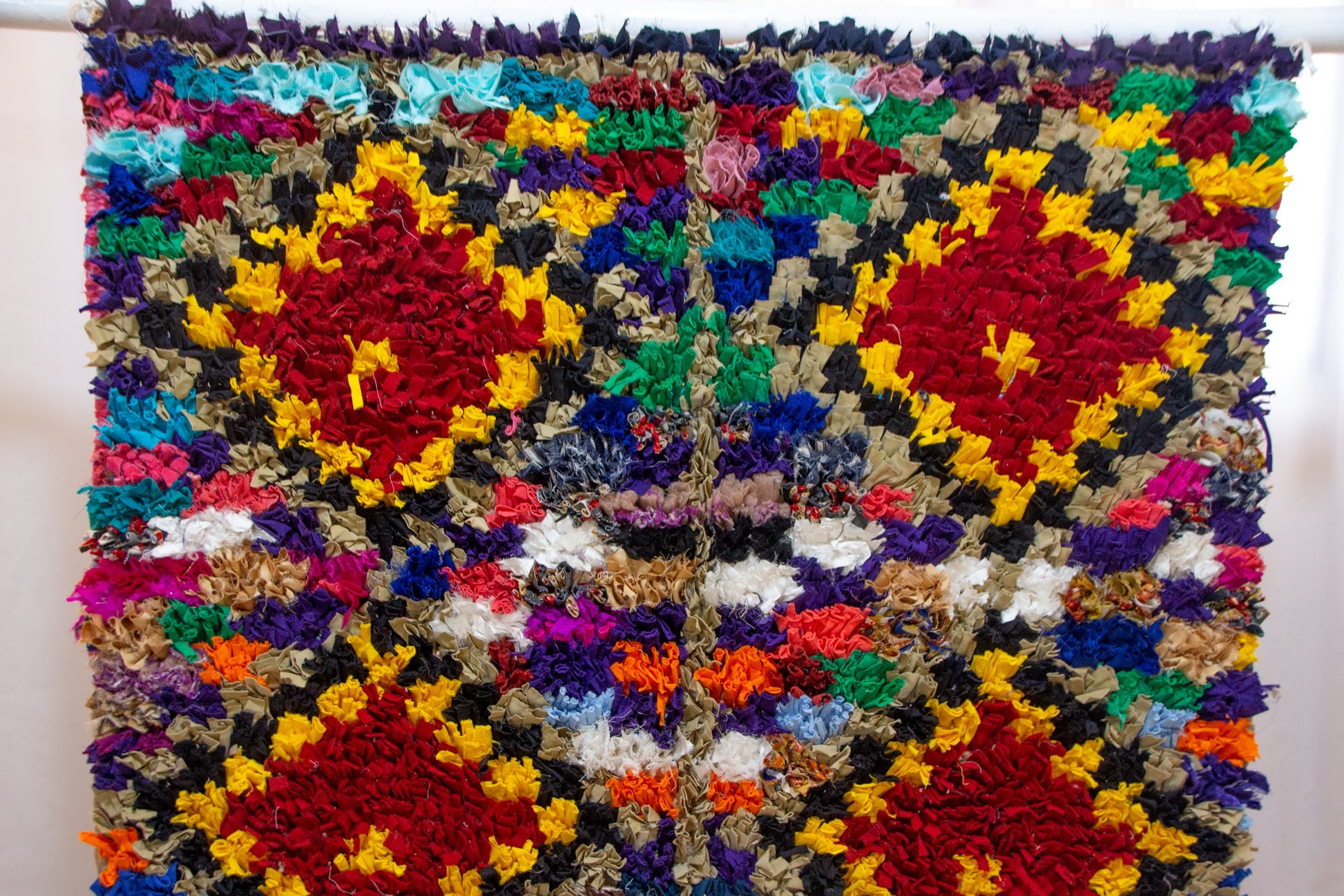 A kinetic boucherouite runner fashioned from reclaimed textiles. Four large radiant diamond medallions—crimson hearts ringed in saffron—float over a lively patchwork of jewel and pastel checks. The result is a jubilant, tactile field that channels Amazigh improvisation and the poetics of reuse.