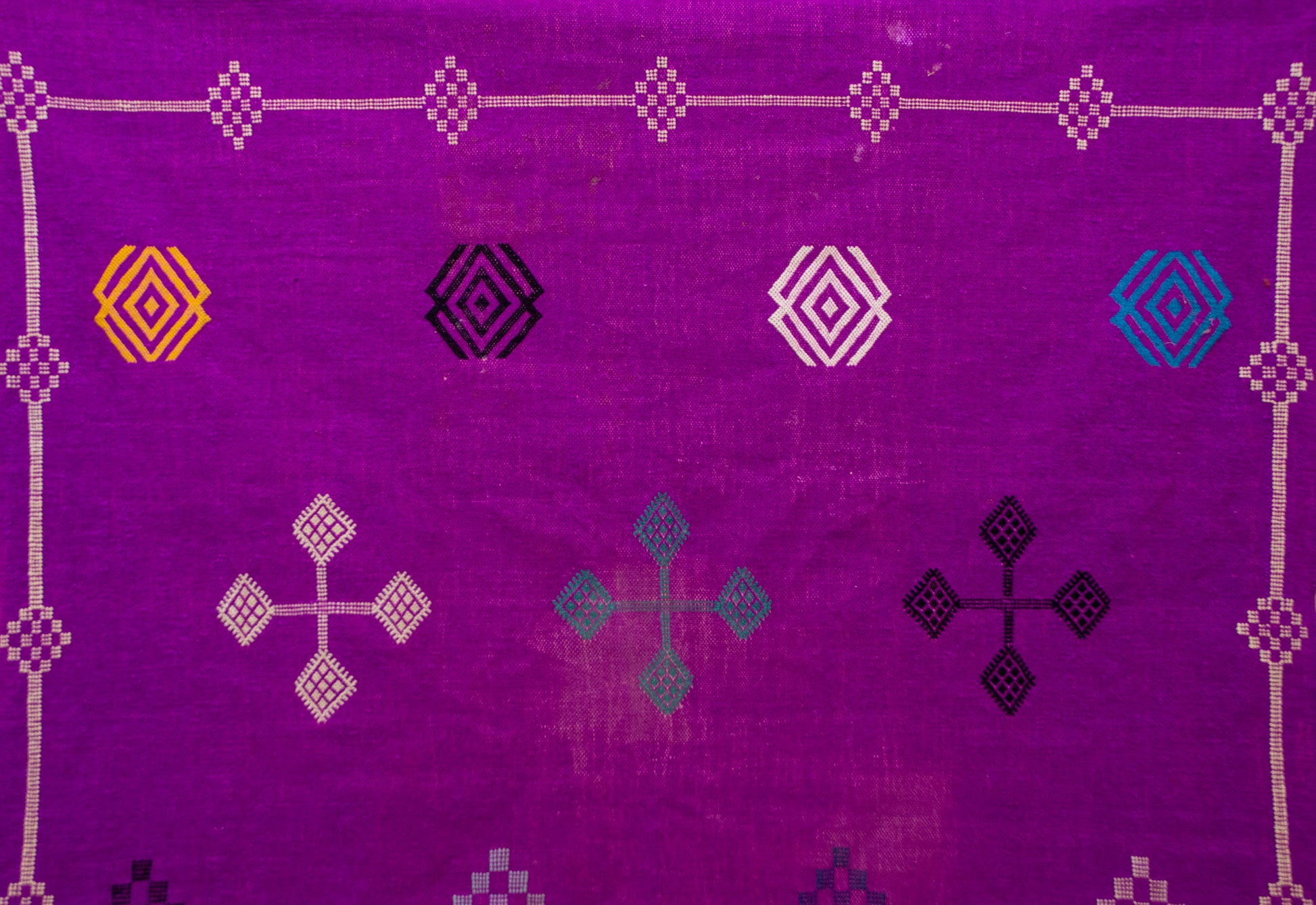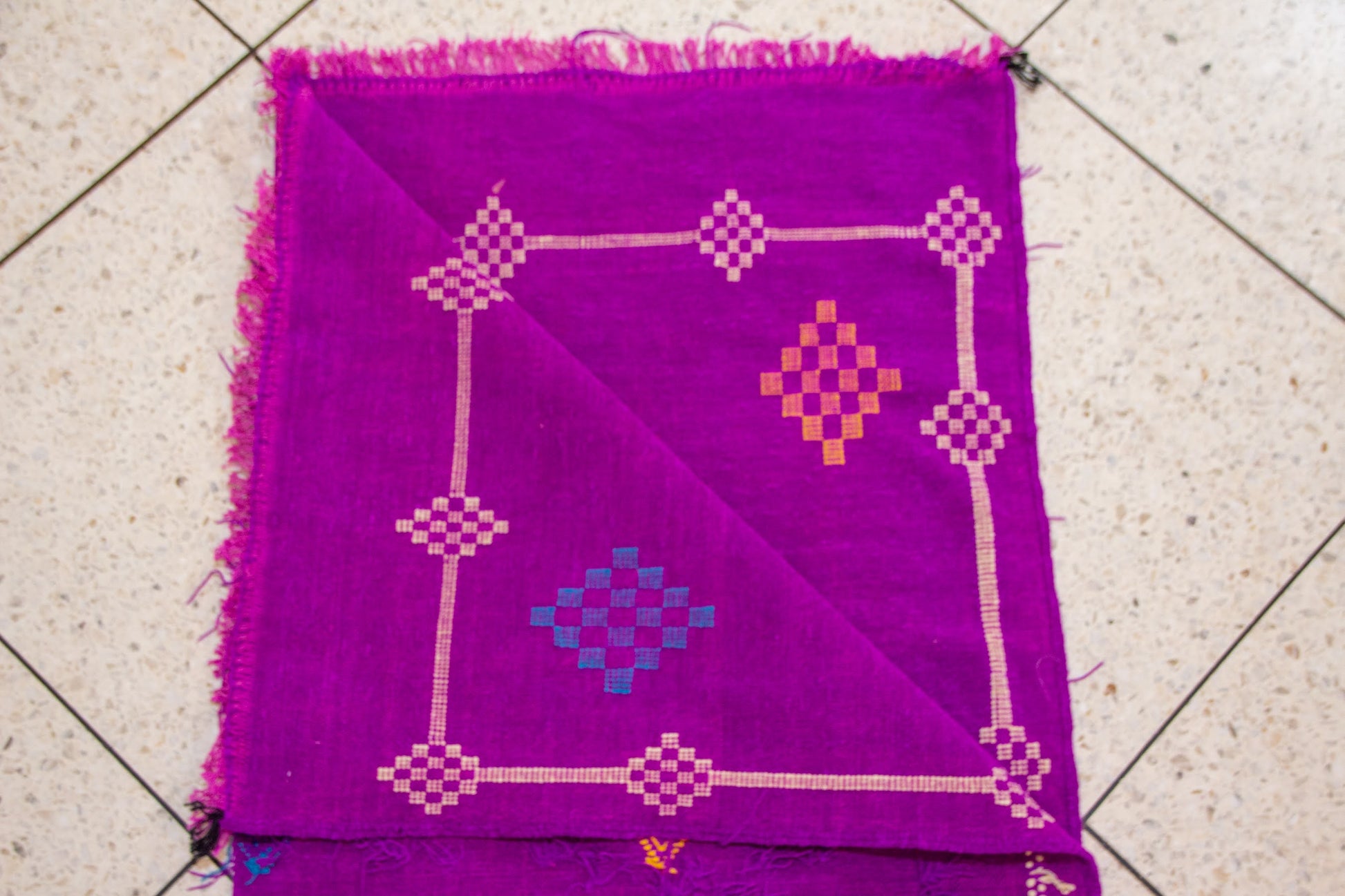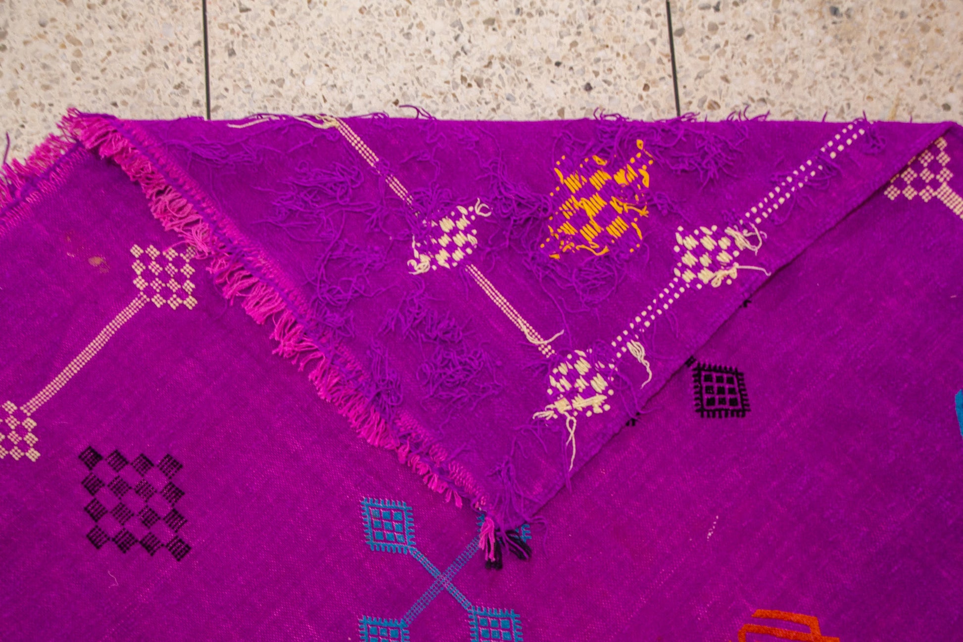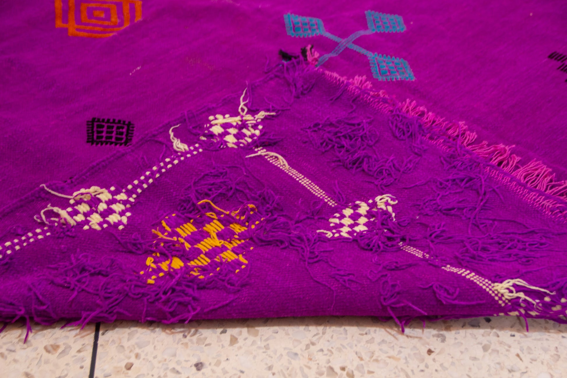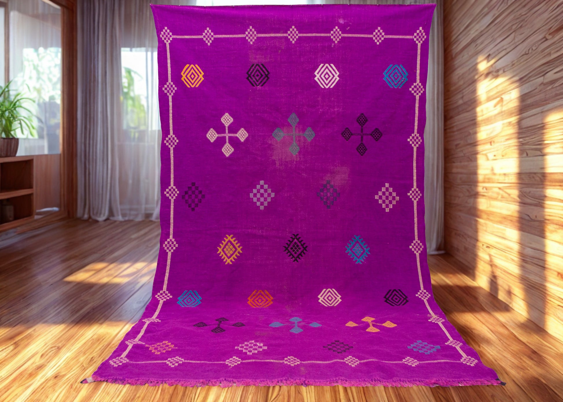 This Boujaad rug radiates the chromatic boldness of the Haouz plains. Its amethyst ground is scattered with diamond medallions and cross-like glyphs, each rendered in contrasting jewel tones. Woven by master weavers of Boujaad, this piece is both ornamental and emblematic: a narrative of protection, fertility, and the cosmic order of Amazigh design, distilled into a single textile.