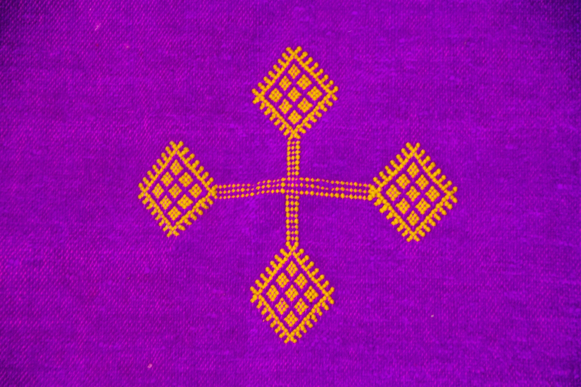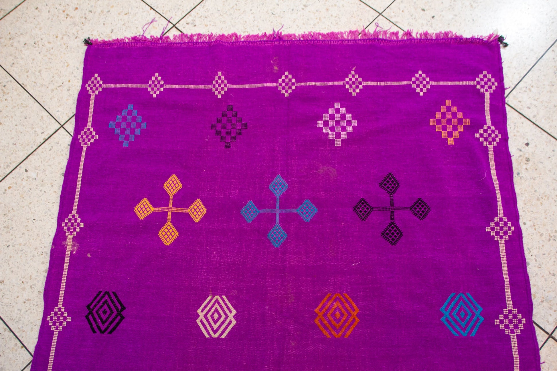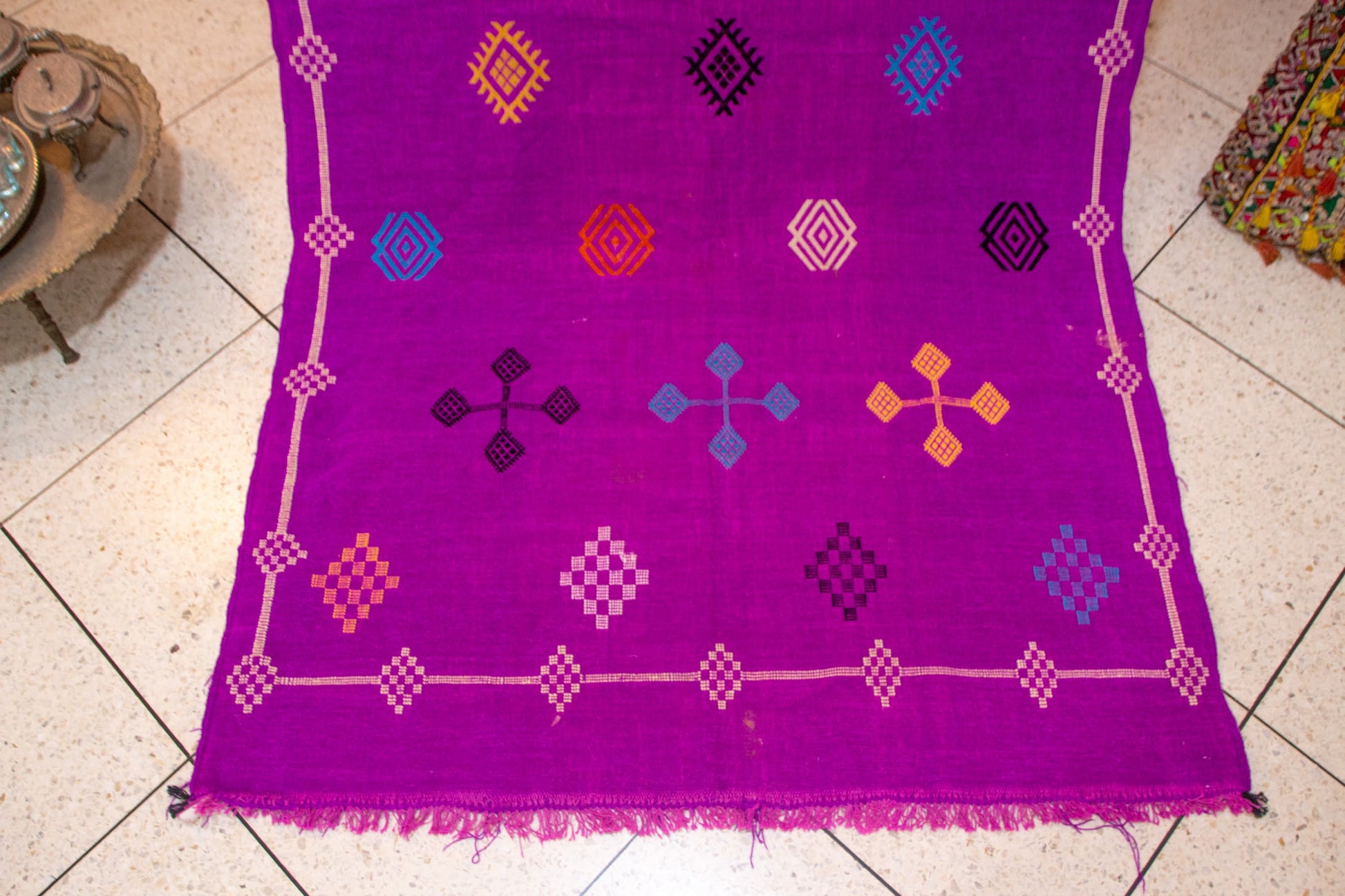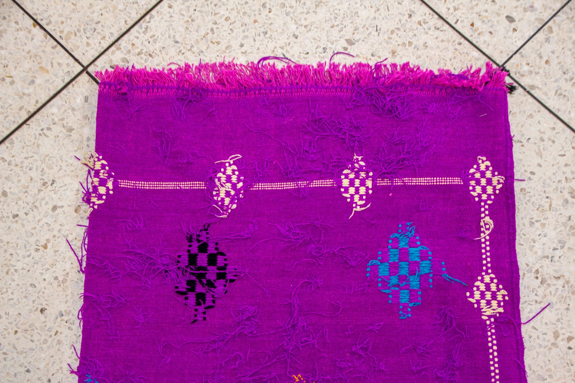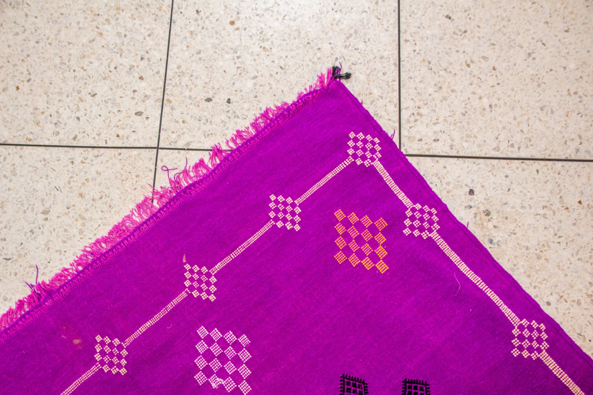 This Boujaad rug radiates the chromatic boldness of the Haouz plains. Its amethyst ground is scattered with diamond medallions and cross-like glyphs, each rendered in contrasting jewel tones. Woven by master weavers of Boujaad, this piece is both ornamental and emblematic: a narrative of protection, fertility, and the cosmic order of Amazigh design, distilled into a single textile.