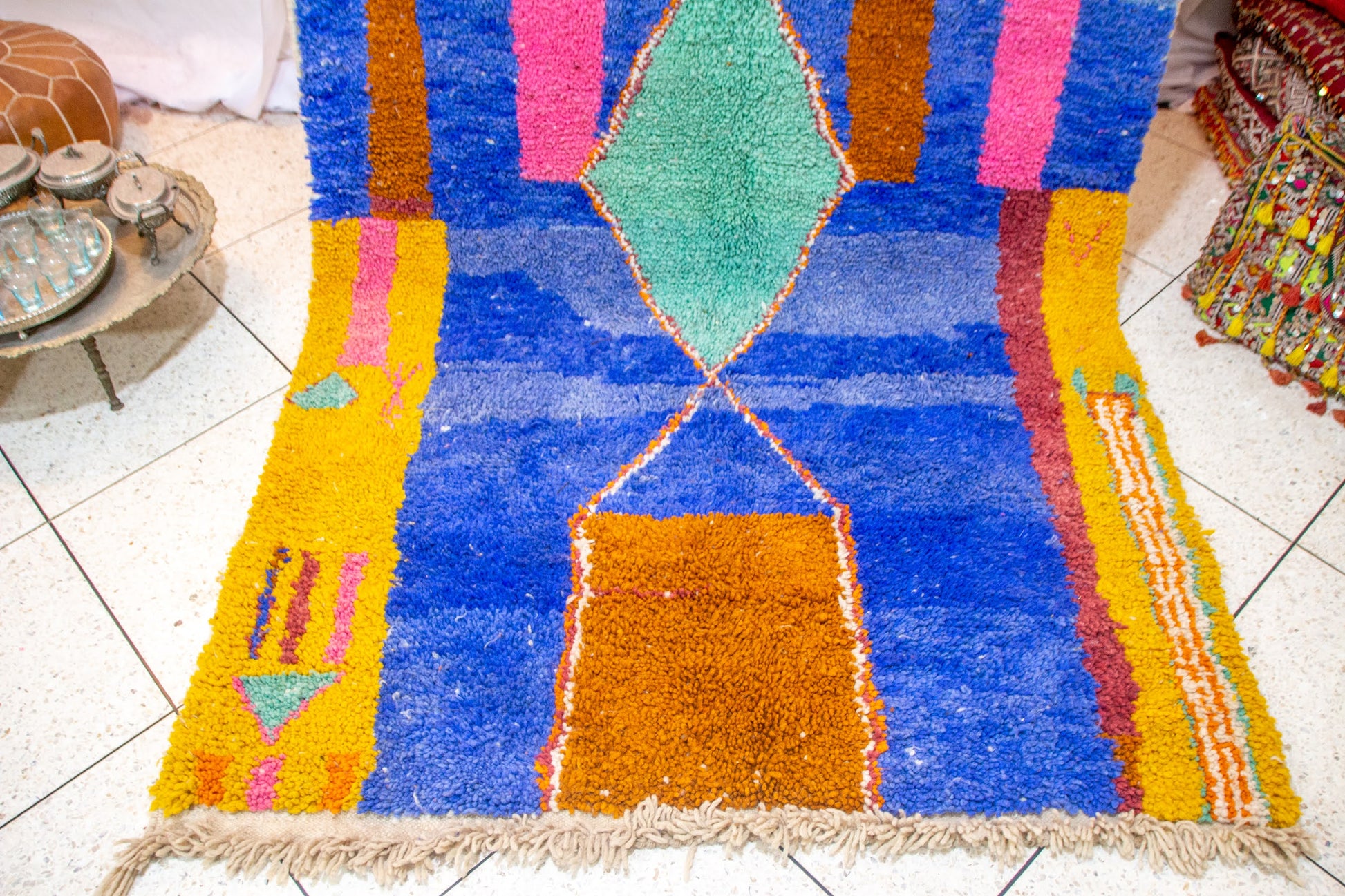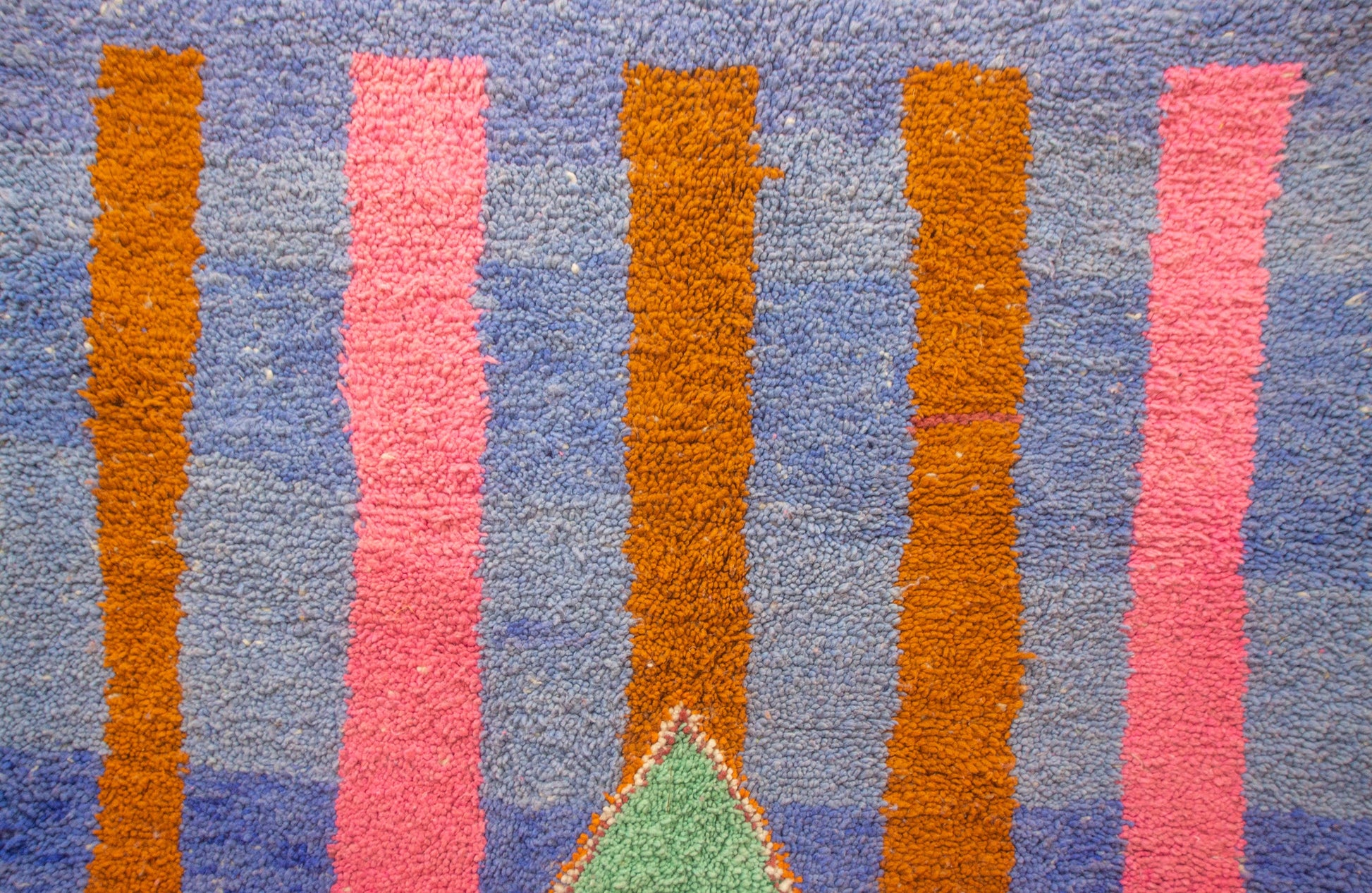 A radiant Boujaad composition with a saturated azure field. Upright columnar bands in rose and ochre flank a central mint lozenge that mirrors to a rust rectangle below, creating a ceremonial axis. Vivid border passages in saffron, teal, and coral add a joyful, painterly cadence—modern color with Middle Atlas spirit.