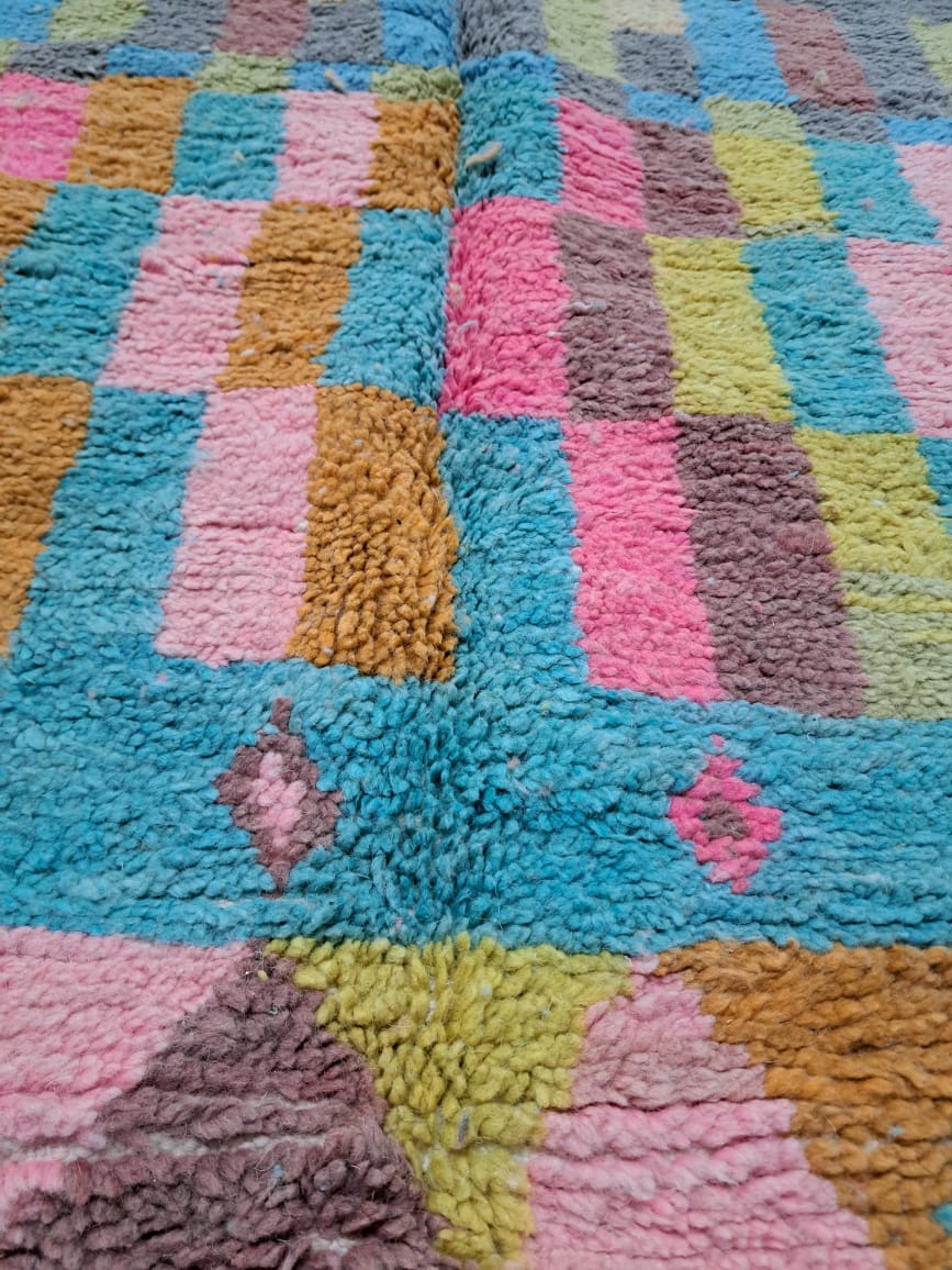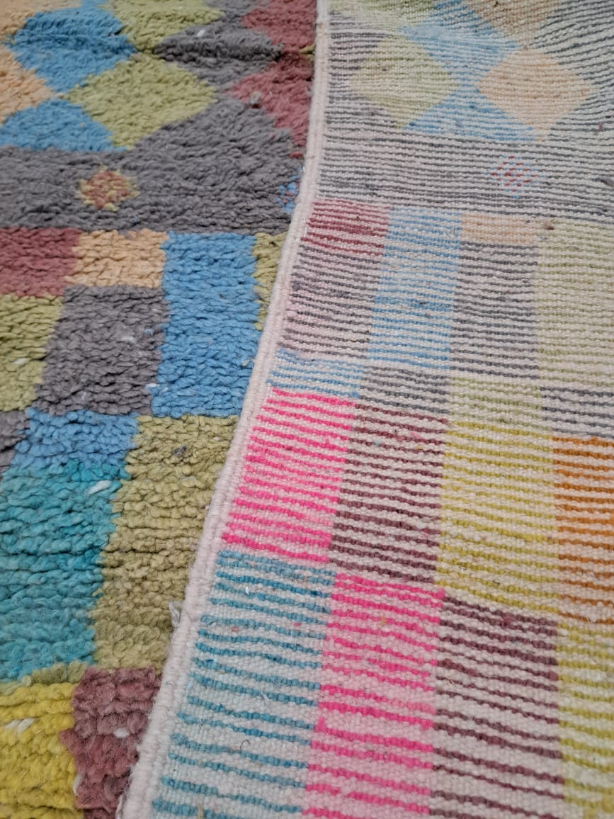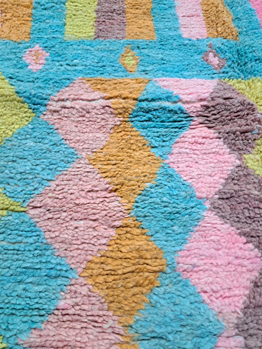 A radiant and highly expressive example of Boujaad artistry, this piece merges chromatic mosaic blocks with the lineage’s recognisable central Zanafi-inspired spine. The composition oscillates between geometric rhythm and painterly softness — a visual narrative emblematic of the Haouz region's evolving aesthetics.