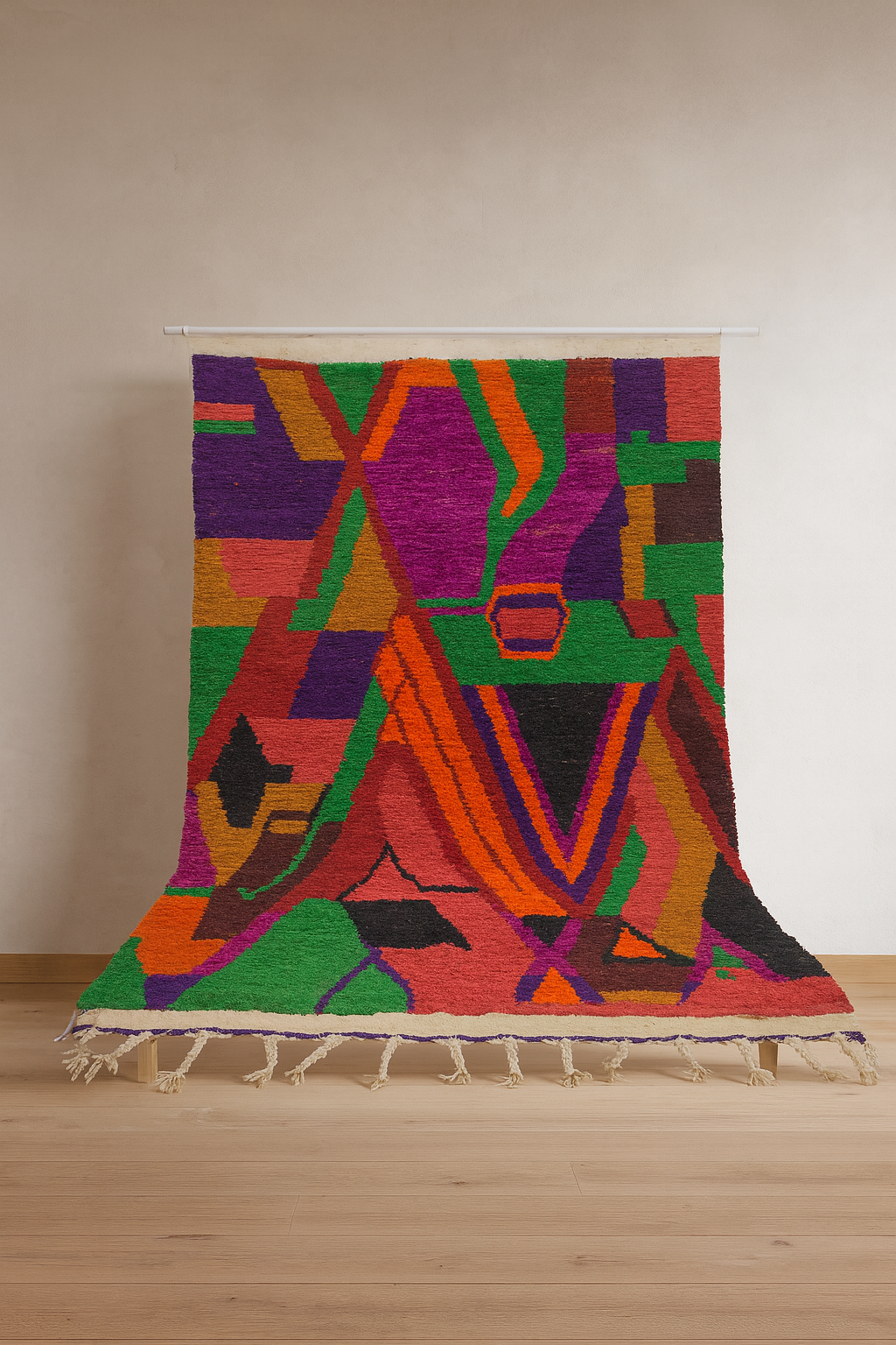 A festival of color and angle—Boujaad modernism woven in saturated wool.