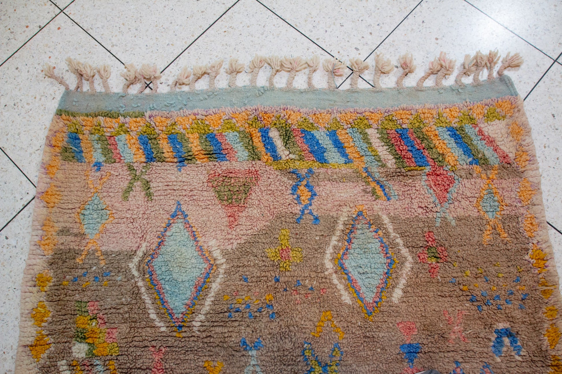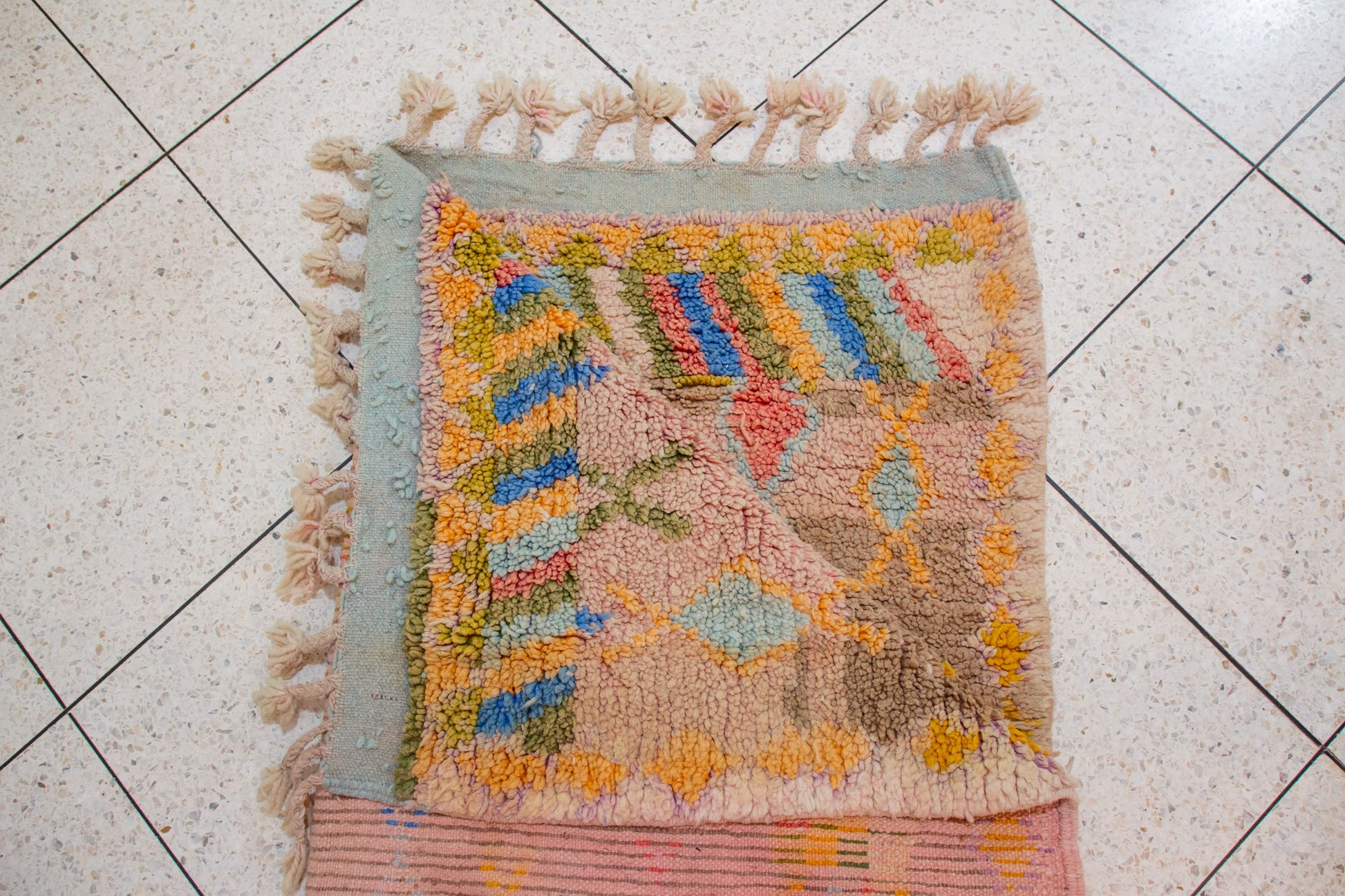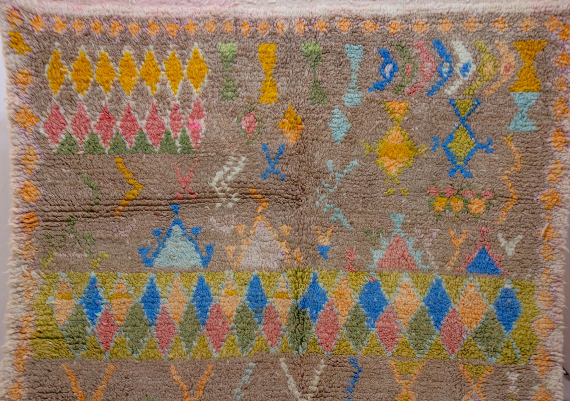 A luminous Boujaad composition woven on an earthy rose ground. Pastel-hued diamonds, glyphs, and scattered motifs in yellow, blue, mint, and coral soften the strong Middle Atlas geometry with an airy, dreamlike presence. A vintage-inspired palette suited to warm and contemporary interiors.