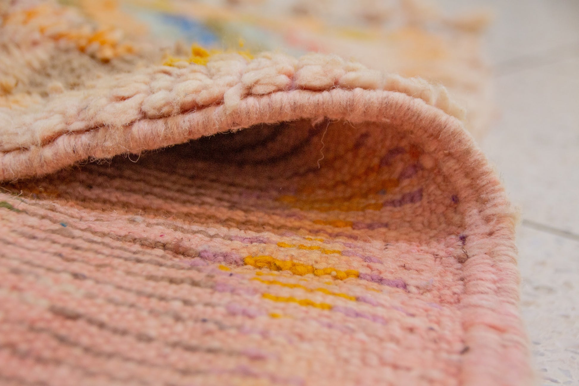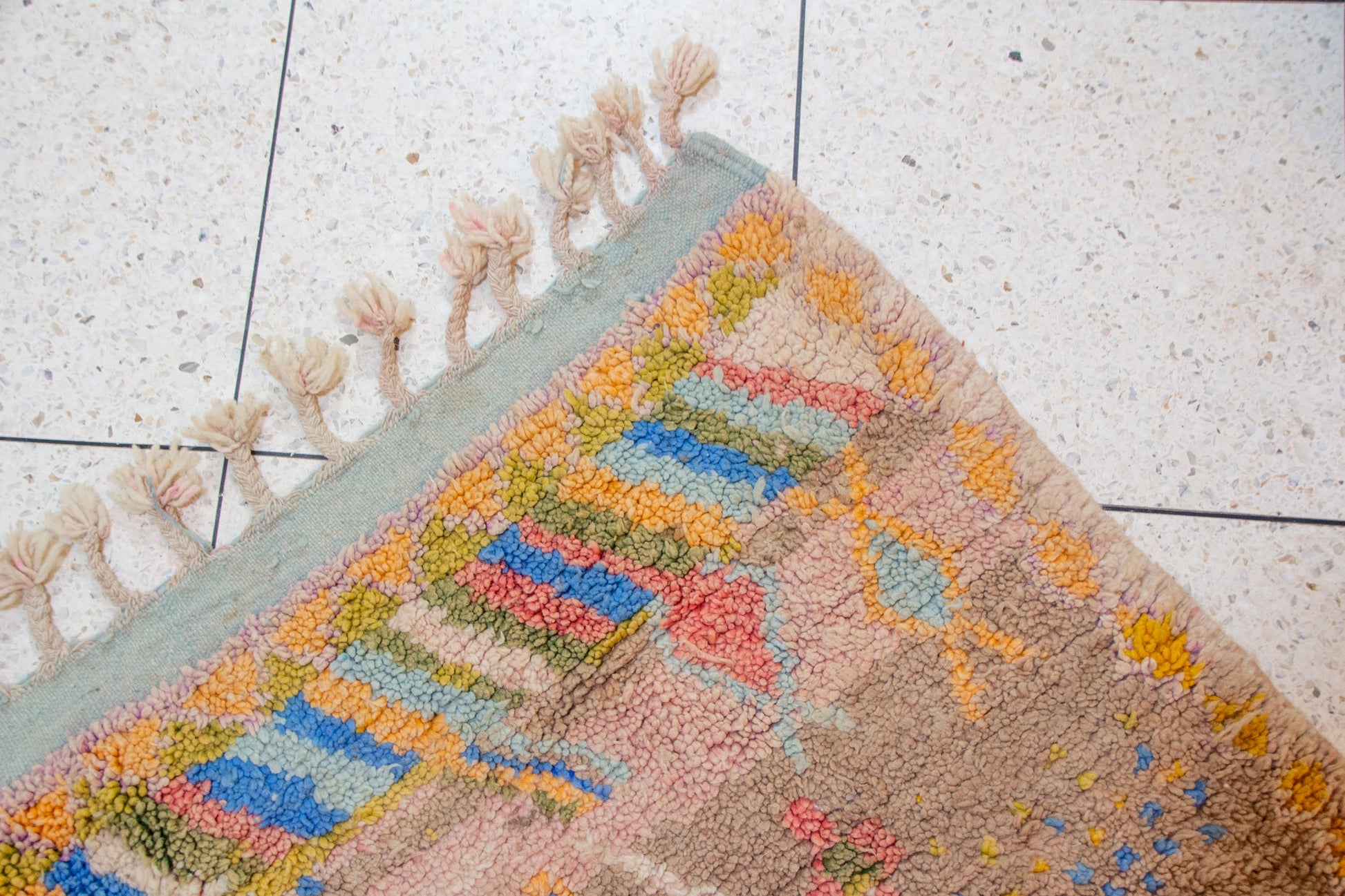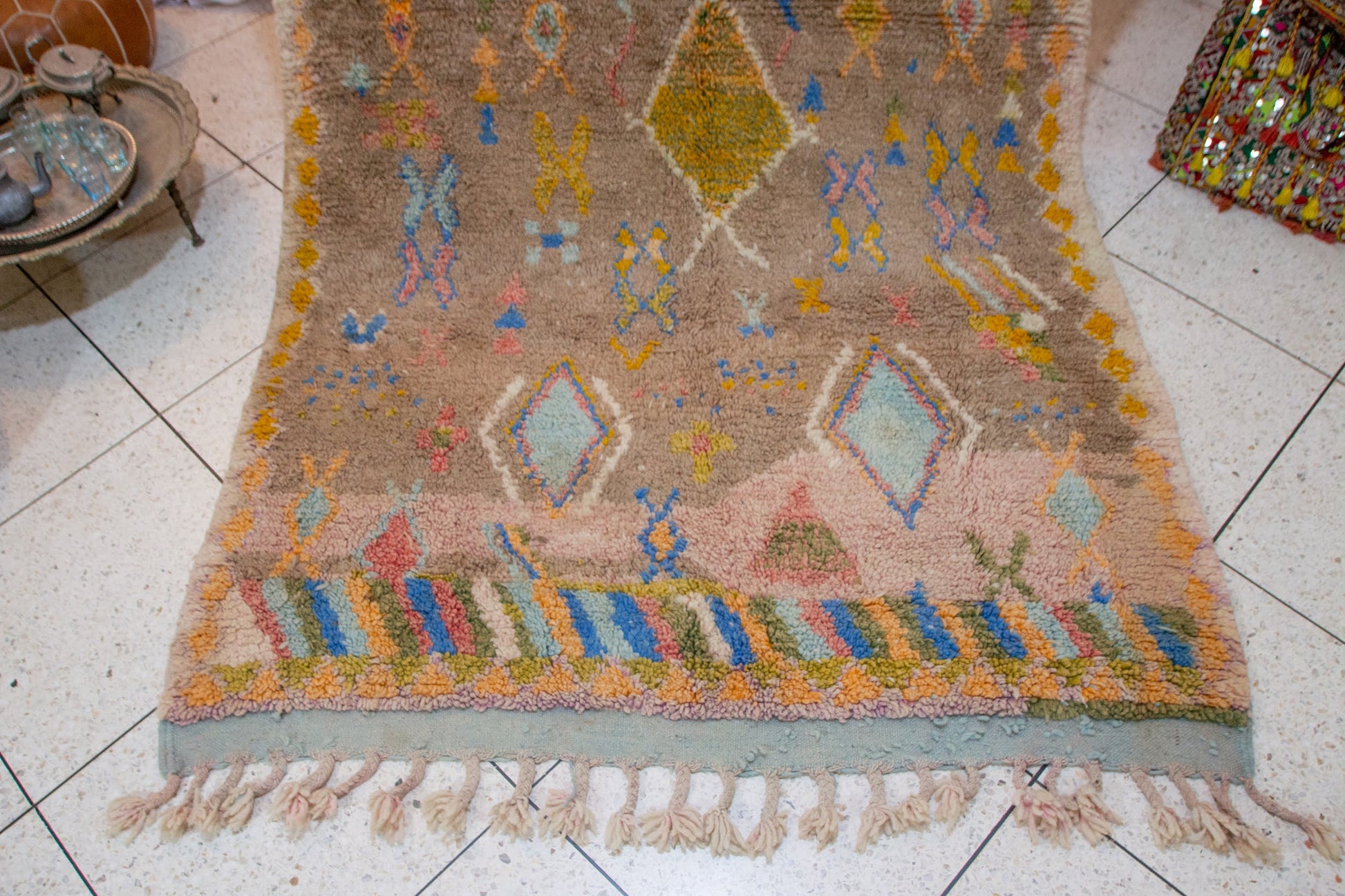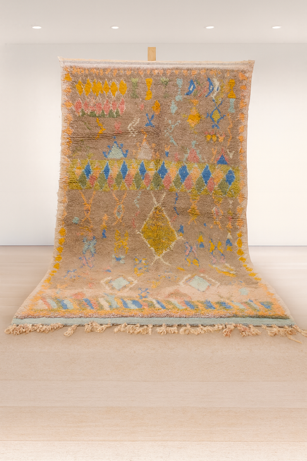 A luminous Boujaad composition woven on an earthy rose ground. Pastel-hued diamonds, glyphs, and scattered motifs in yellow, blue, mint, and coral soften the strong Middle Atlas geometry with an airy, dreamlike presence. A vintage-inspired palette suited to warm and contemporary interiors.