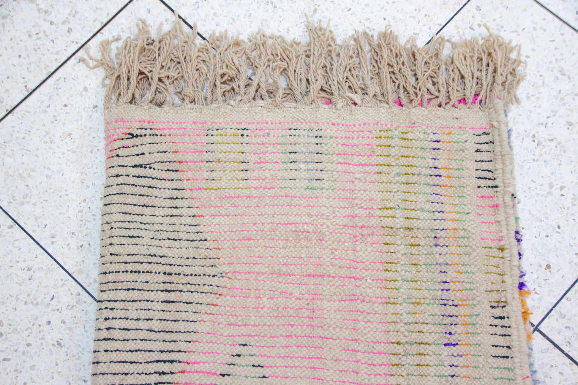Vivid Boujaad from Morocco’s Middle Atlas: a saturated fuchsia ground studded with lozenge medallions and totemic bars, finished with a rippling rainbow side band. Jewel tones in emerald, cobalt, teal, saffron, tangerine, and charcoal pop against the plush pink pile.