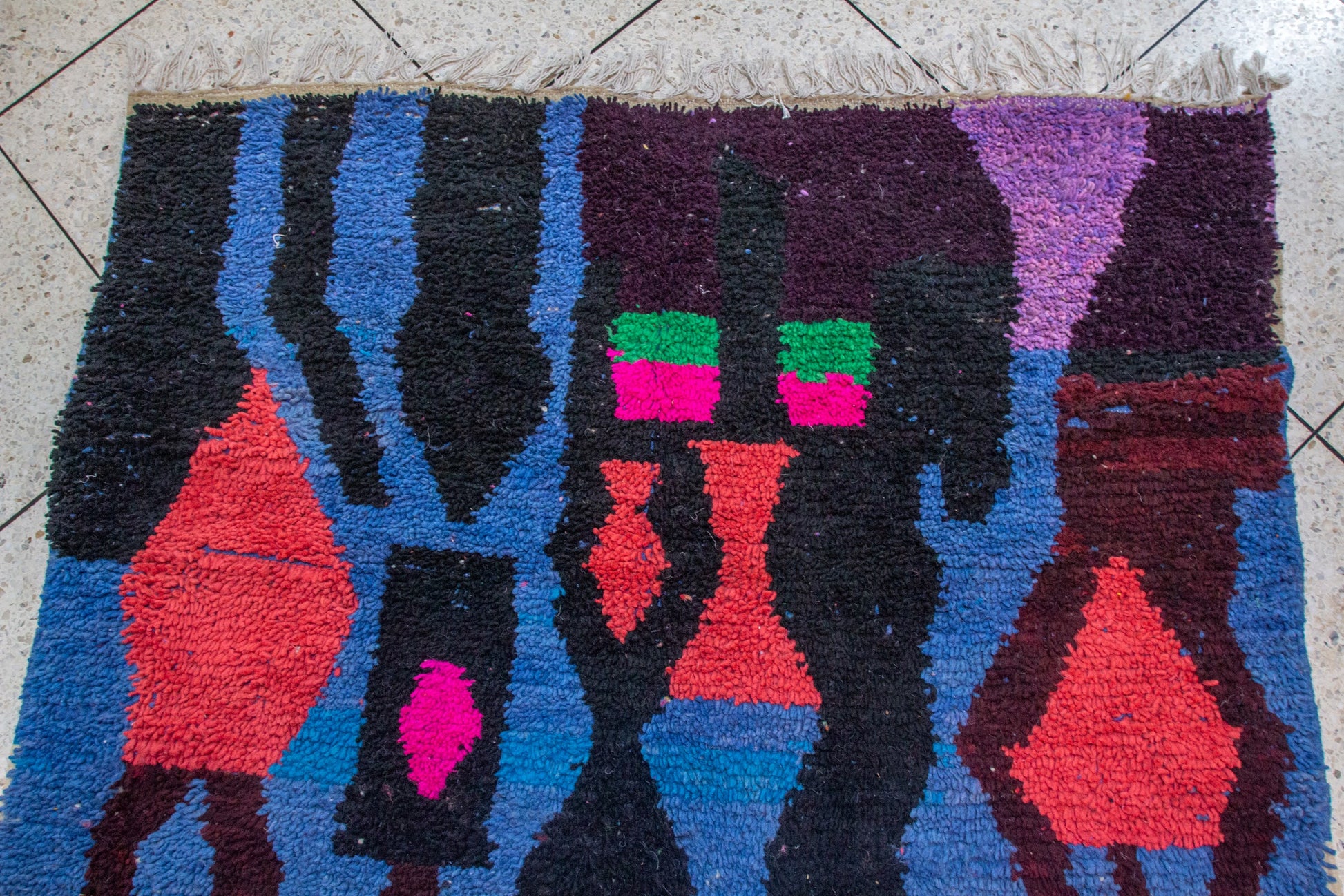 Hand-knotted Boujaad from Morocco’s Middle Atlas. A bold, totemic figure anchors the field, flanked by vertical bands and stepped blocks. The palette—deep cobalt and midnight with flashes of fuchsia, neon pink, ember orange, brick, and acid green—reads modern while honoring Amazigh symbolism.