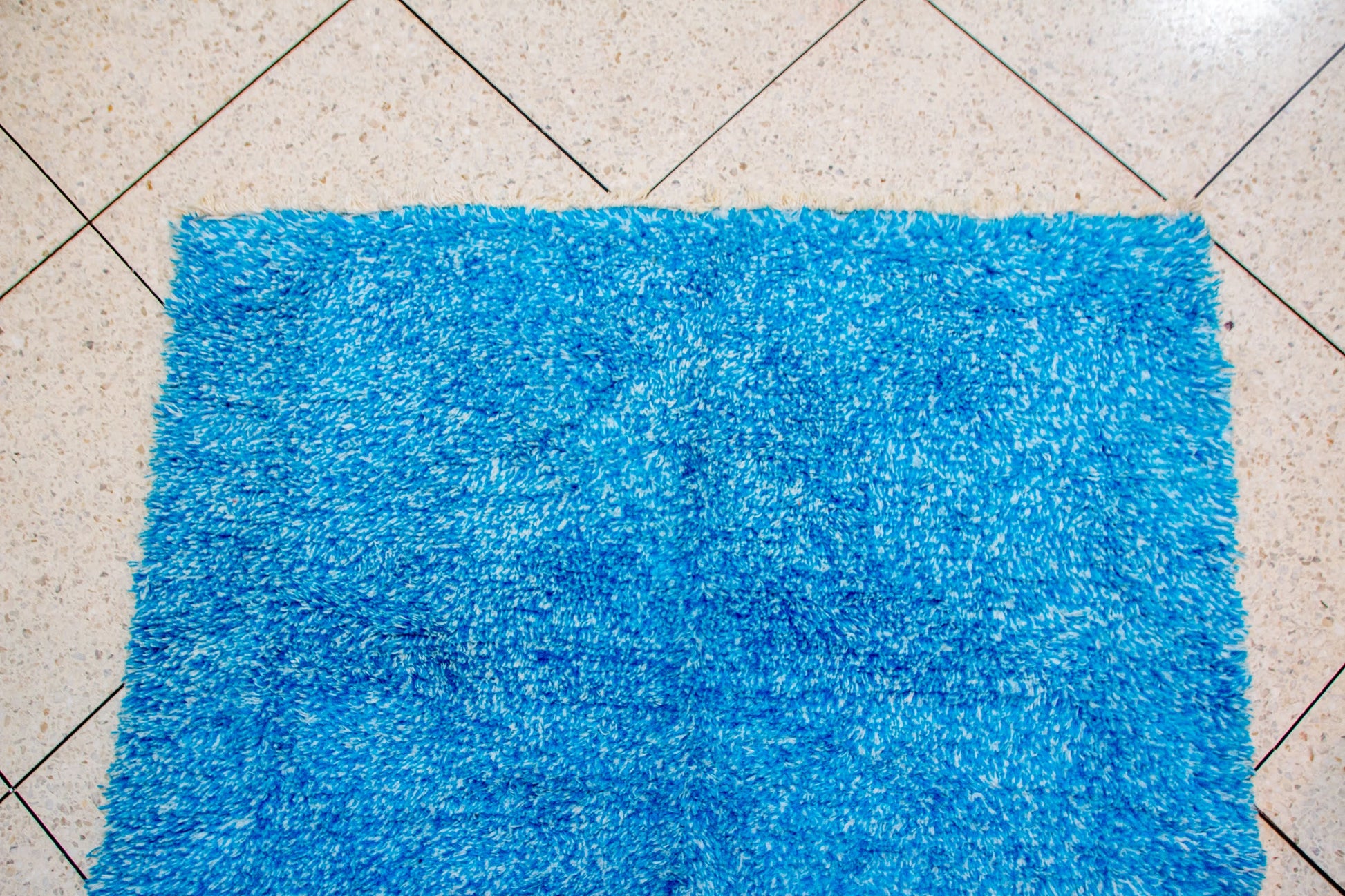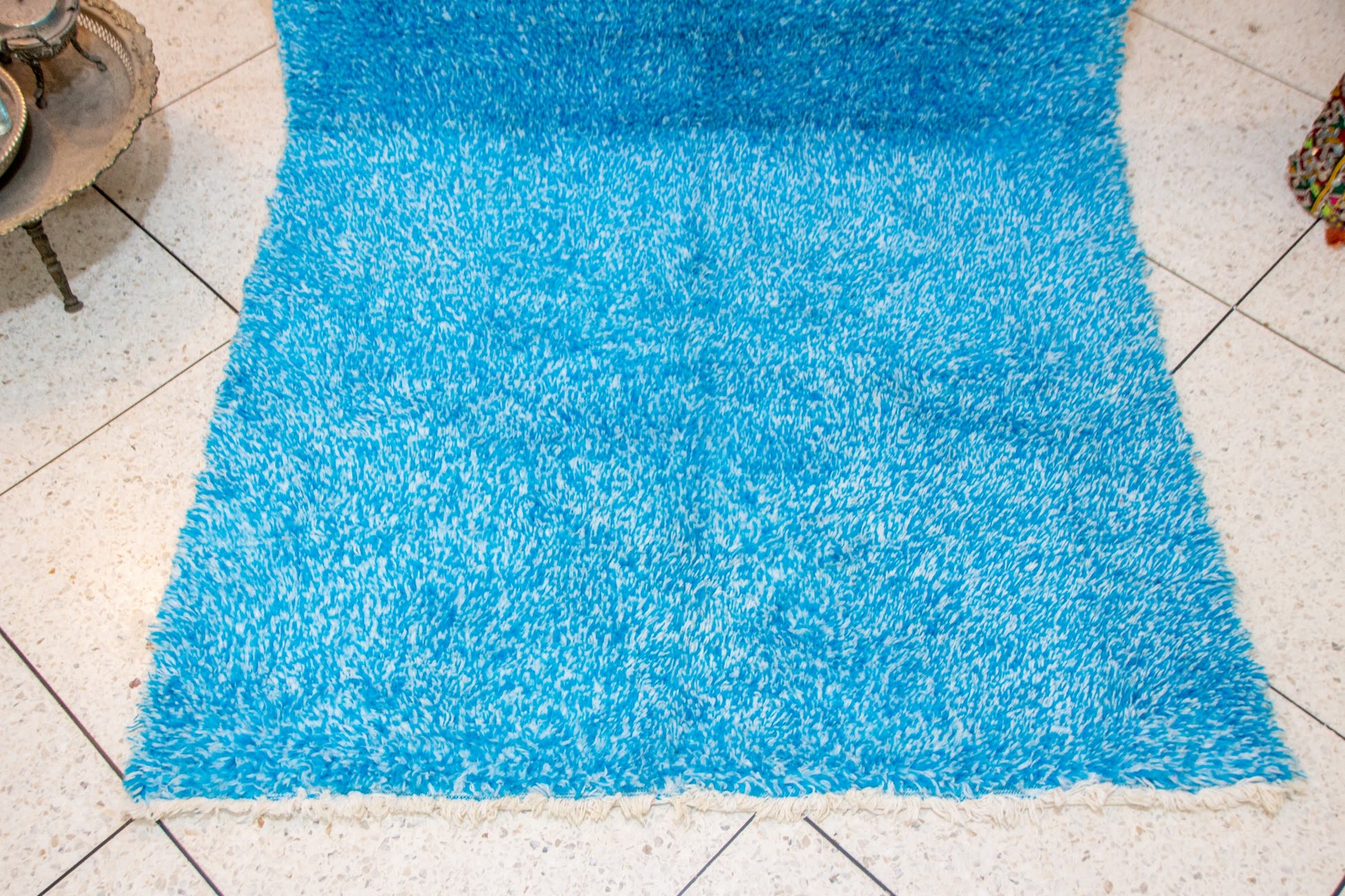 A rare Boujaad shag, saturated in crystalline azure blue, hand-knotted in wool with a plush, inviting pile. The single-field color creates a striking modern minimalism, while the handwoven ivory fringe anchors it in Amazigh tradition.