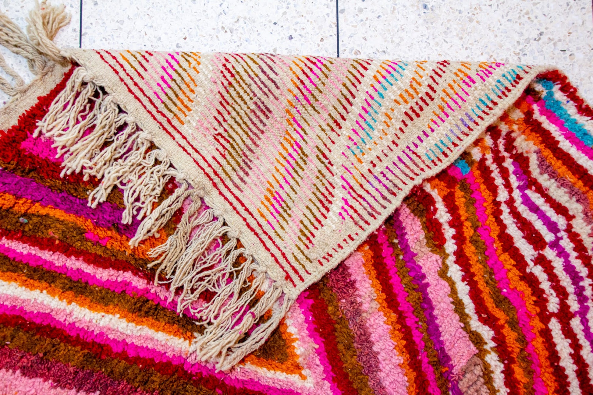A jubilant Boujaad composition from the Middle Atlas, this vintage-inspired piece stages a soaring kubba (shrine-peak) medallion rising through a cascade of chromatic fields. Fuchsia, vermilion, and saffron interplay with lavender and turquoise in a visual hymn to fertility and ascension.