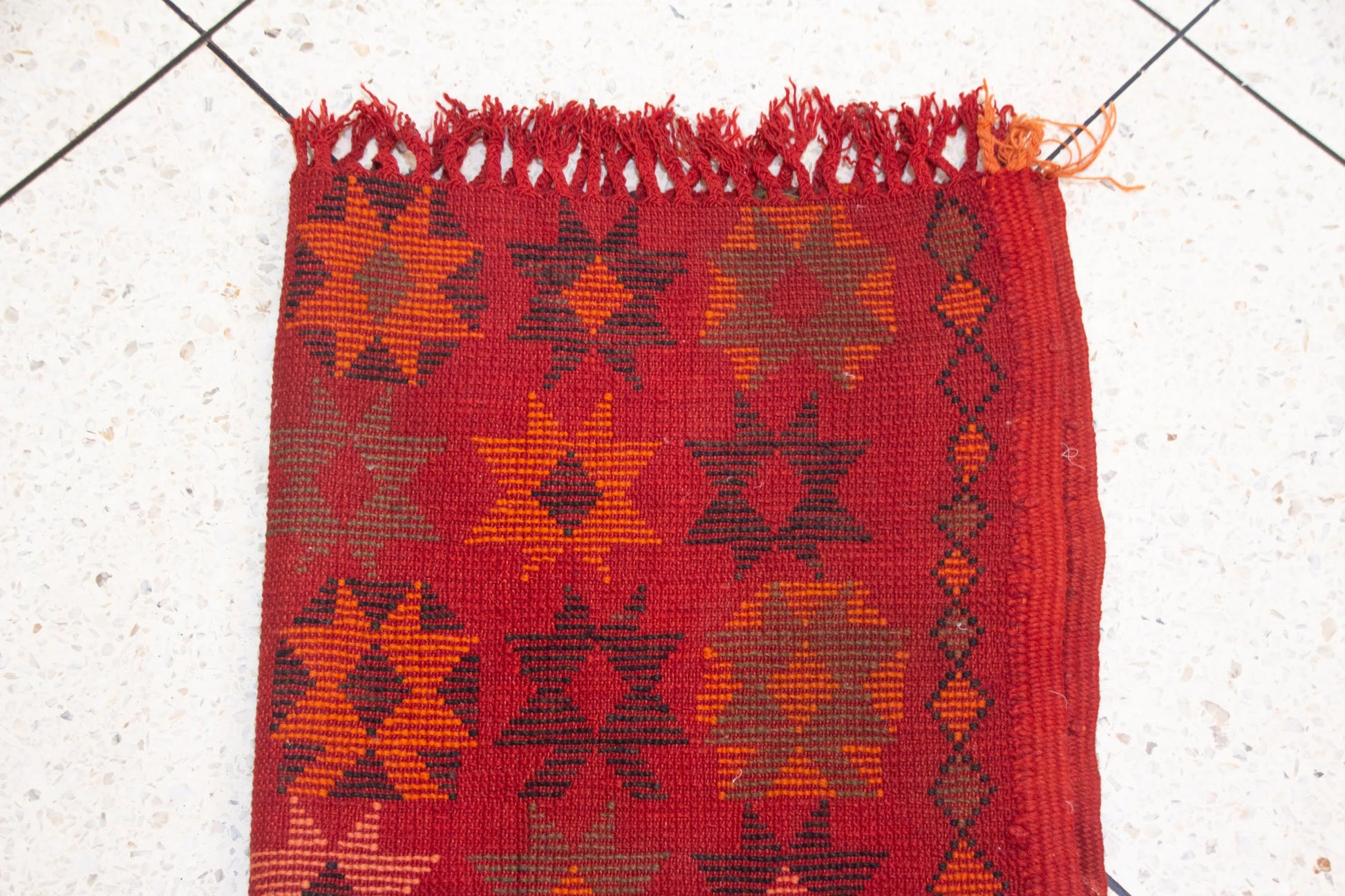 A luminous Boujaad hanbel (flatweave) arranged as an allover octagram star grid. Saffron, teal, blush, and charcoal rosettes bloom over a warm red ground, each star stepped and interlocked—an endlessly repeating constellation from the Middle Atlas.