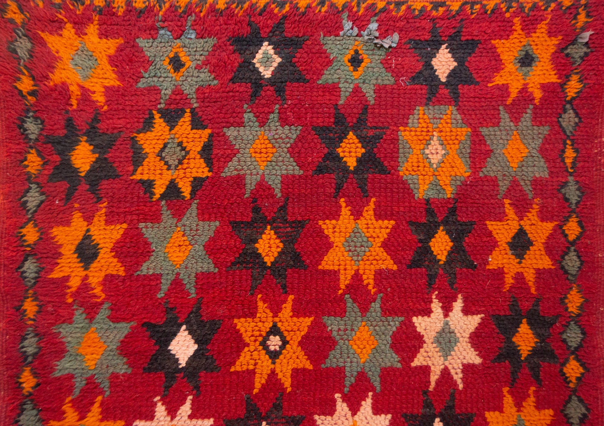 A celestial procession—octagram stars marching the length of a classic Boujaad hanbel.