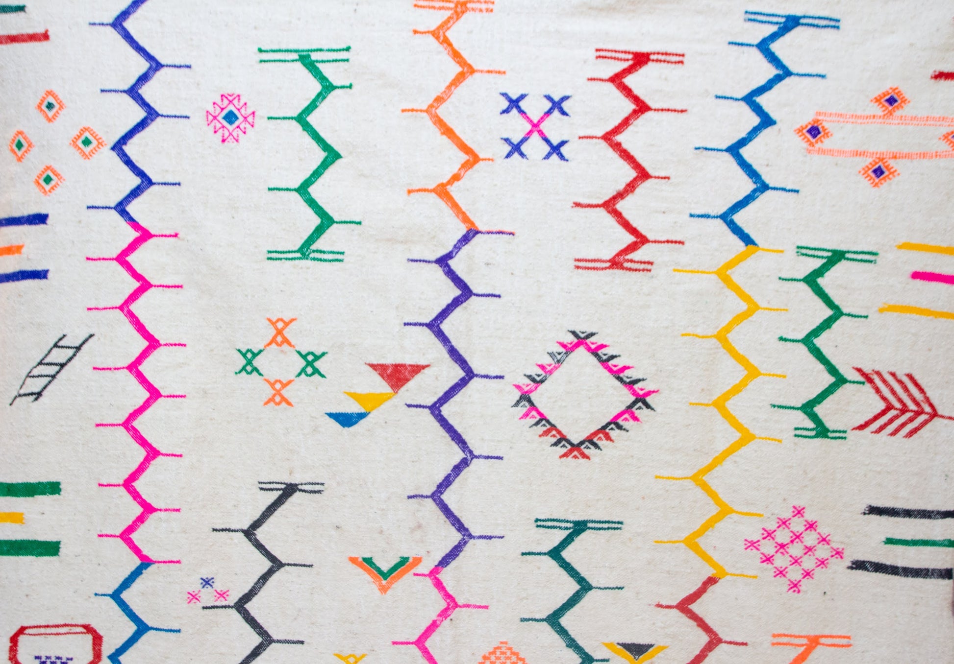 Boujaad–Zanafi Fusion Kilim — Ivory Wool with Multicolor Amazigh Glyphs