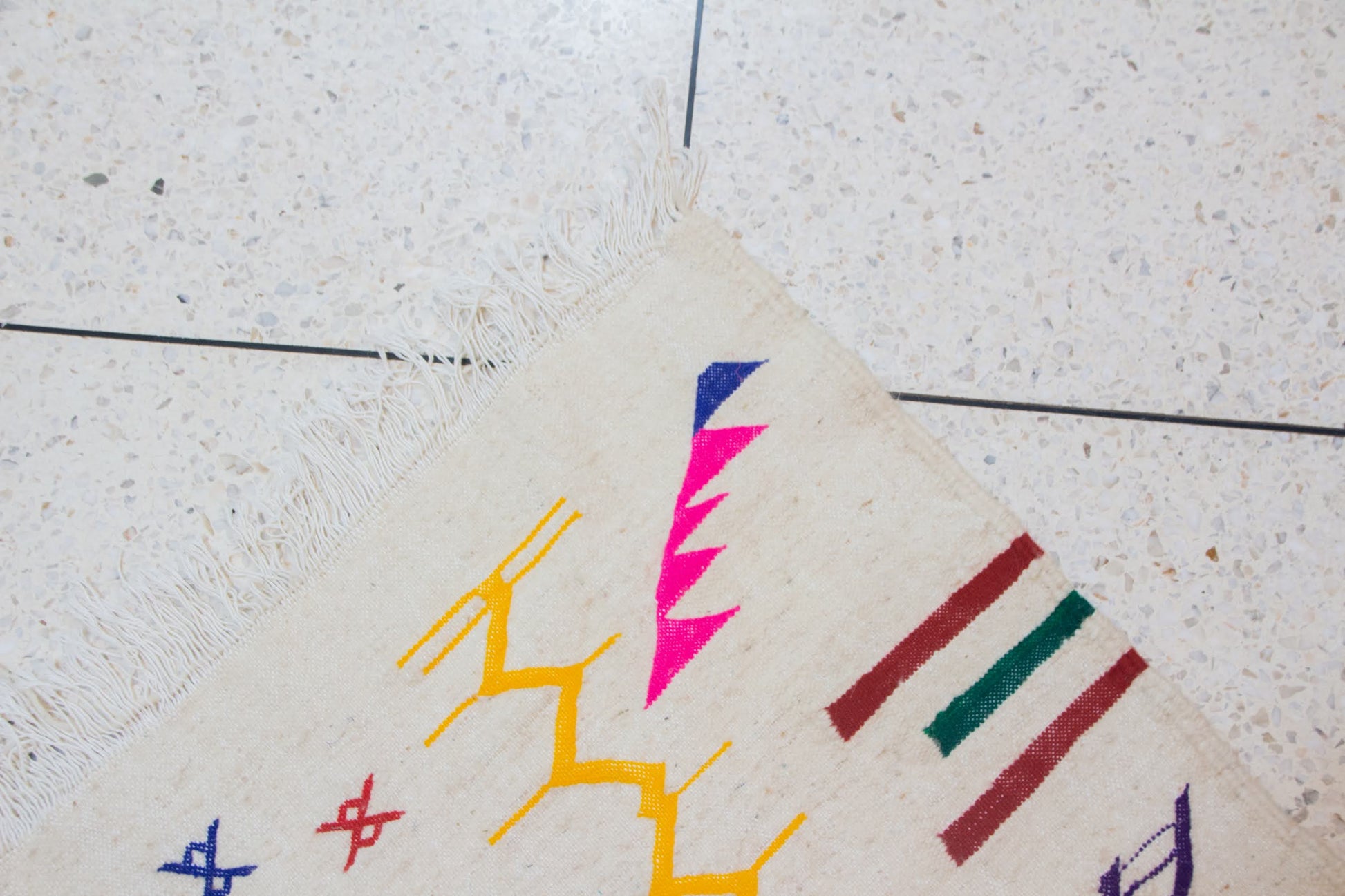 Flatwoven with knotted insertions in a technique characteristic of zanafi kilims yet infused with Boujaad’s chromatic daring. The surface alternates between flat and relief textures, balancing decorative clarity with subtle tactility.