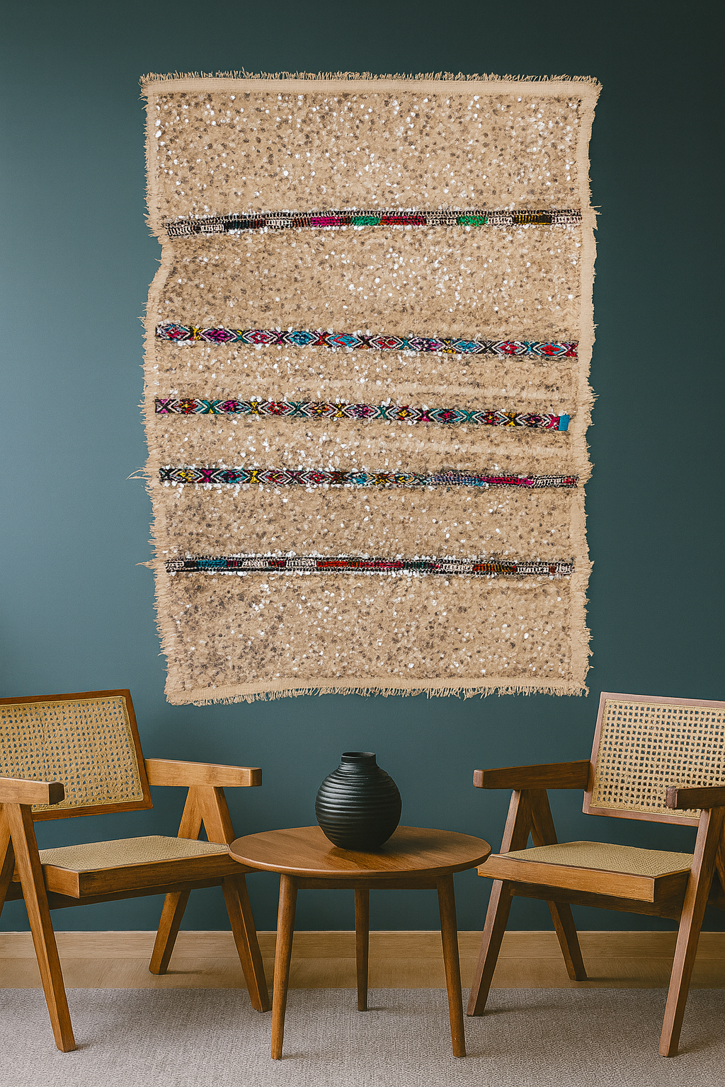 Hand-woven flatweave in the Amazigh tradition with a soft wool face and hand-applied sequins (mouzouna). Supple drape; gentle, tactile sheen.