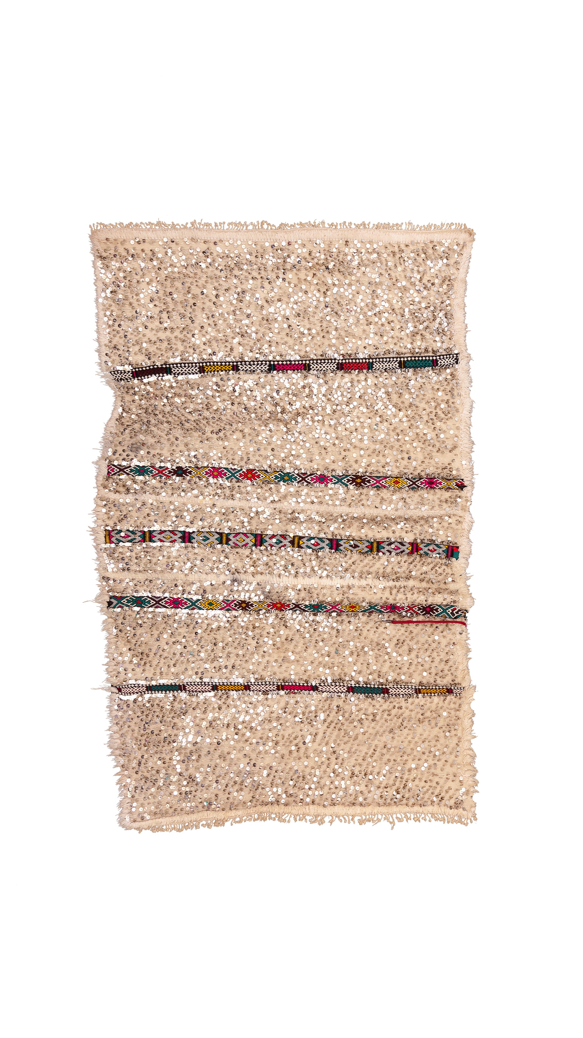 Traditional Handira (wedding blanket) from Beni Mrirt: a luminous ivory field studded with mirrored sequins, punctuated by horizontal bands of colorful tribal motifs. Worn historically by the bride, its shimmering surface invokes blessing, protection, and joyful abundance.