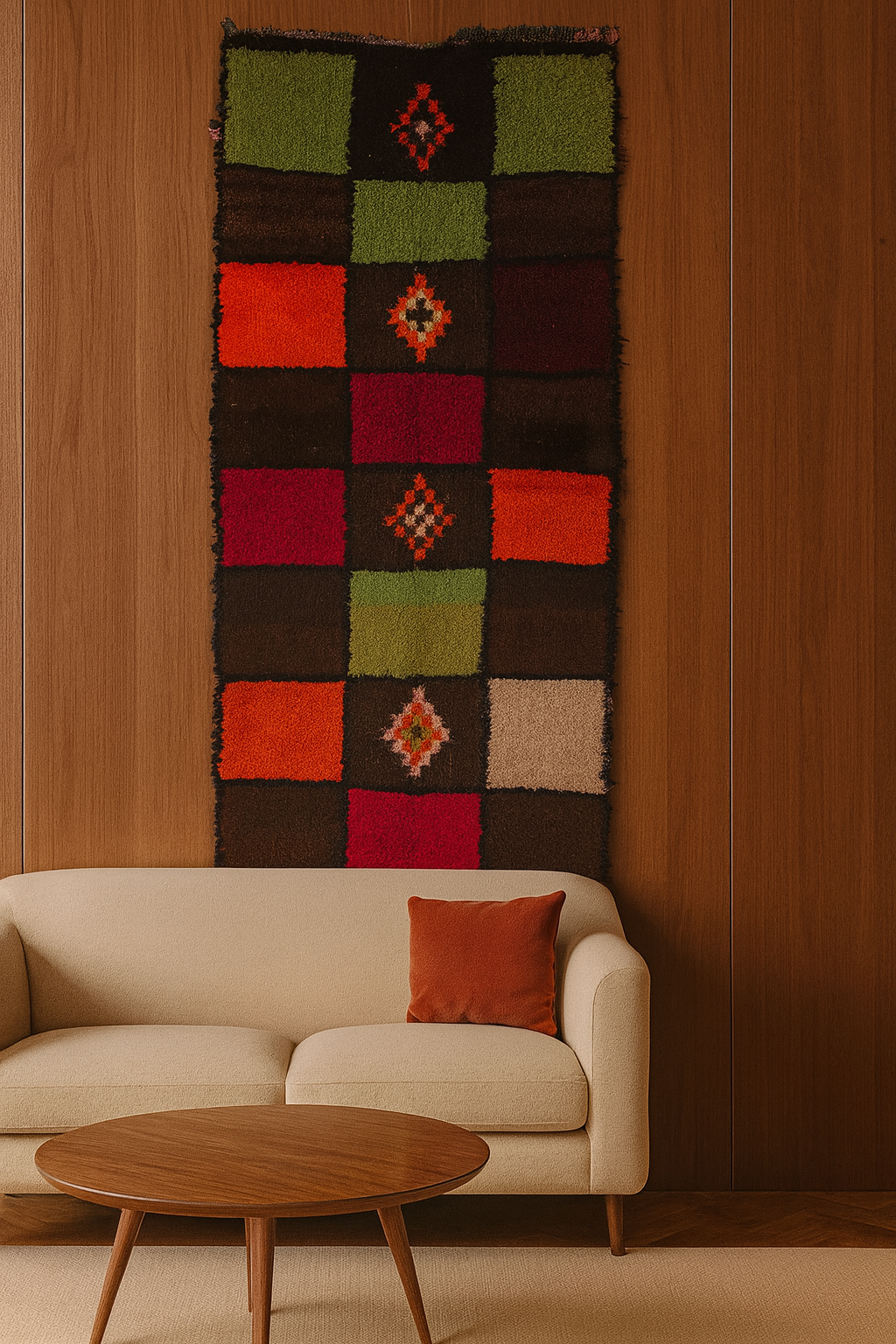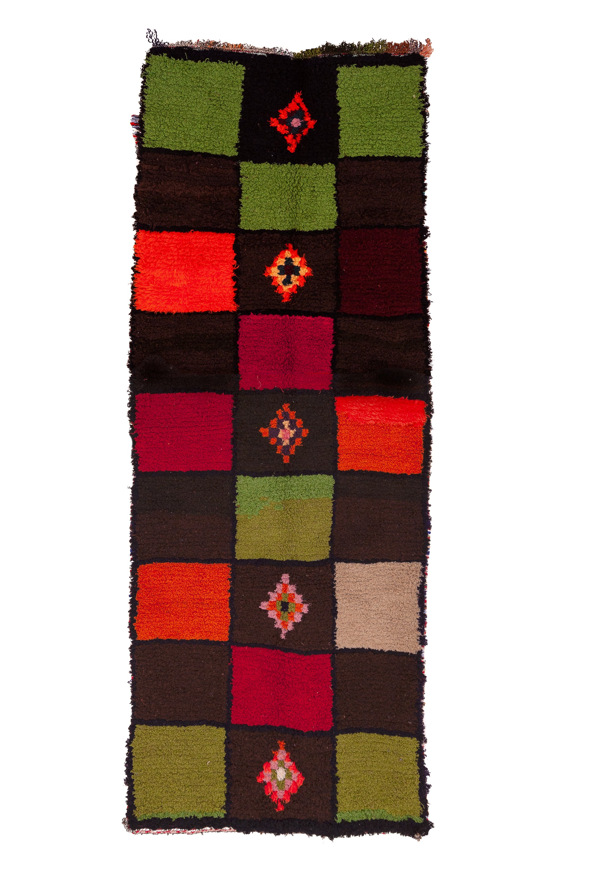 Playful yet elevated, this boucherouite runner lays out a graphic grid of plush squares—olive, tomato, claret, cocoa, coral and sand—punctuated by small diamond rosettes. A vibrant statement for long halls and gallery-like spaces.
