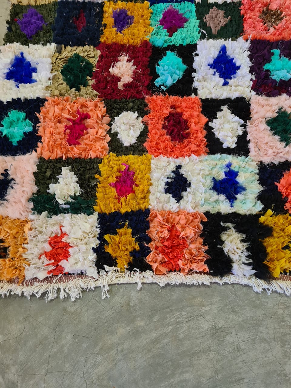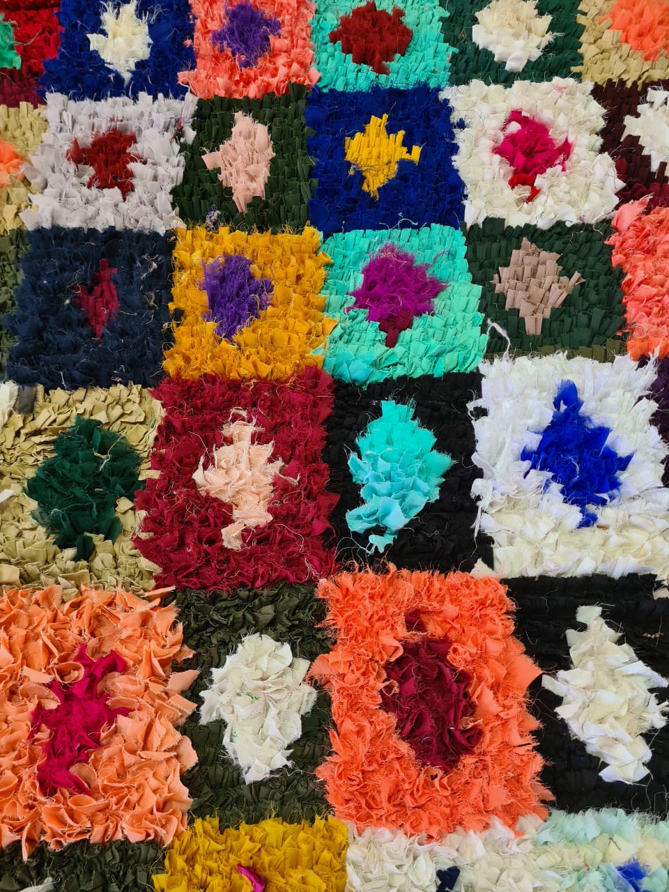 This Boucherouite is lightweight yet visually commanding. It works beautifully in modern interiors as a wall-hanging, hallway runner, or joyful living space centerpiece. Its asymmetry, irregular pile, and exuberant palette embrace imperfection as art form.