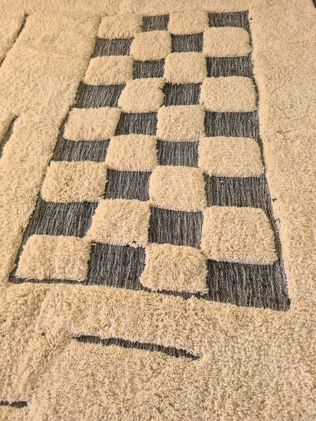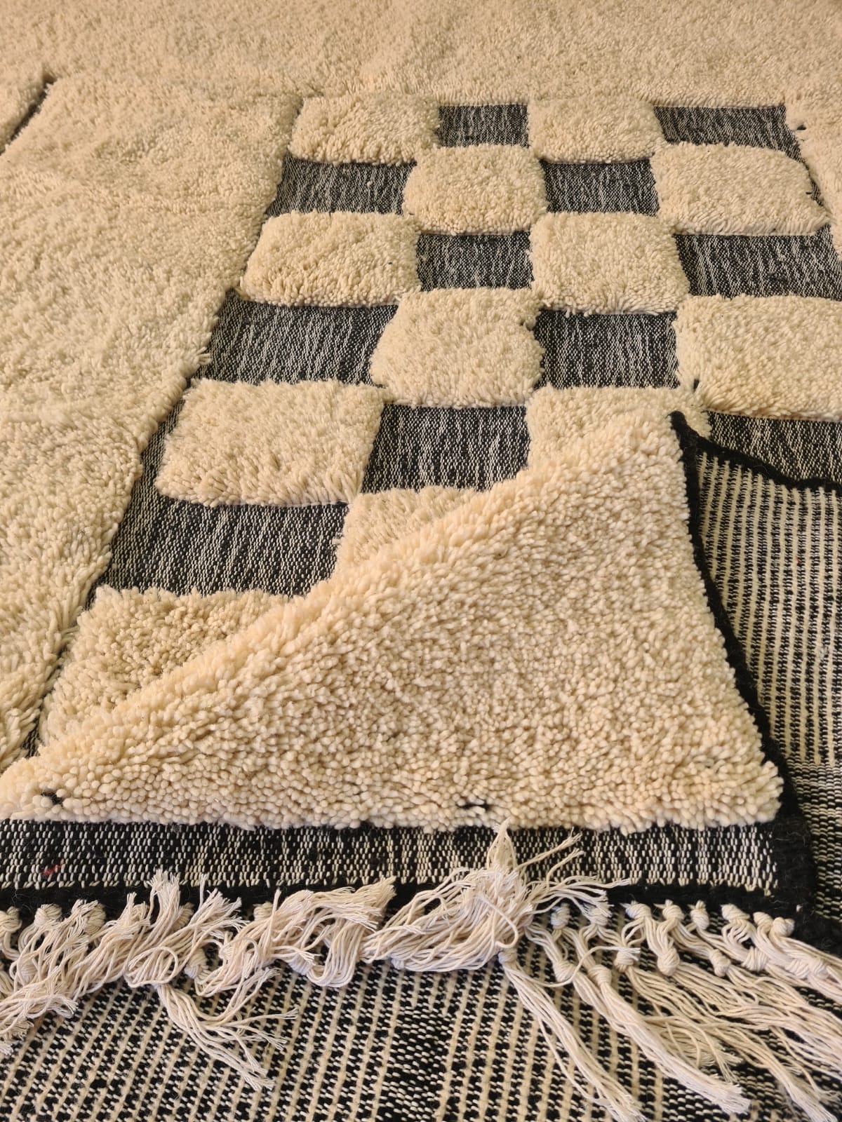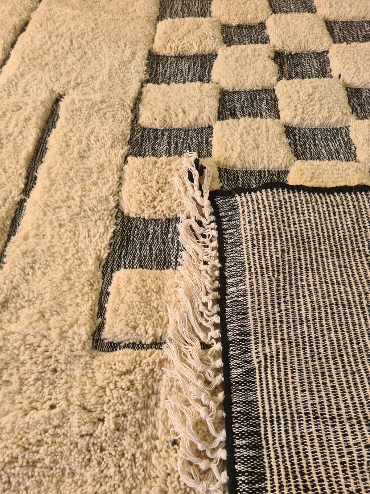 Monochrome Order is a handwoven Beni Ourain rug crafted high in the Central Middle Atlas mountains of Morocco. Its stark grid of alternating dark and ivory squares evokes the primal geometry of thought and rhythm—where opposites engage in perfect visual tension.