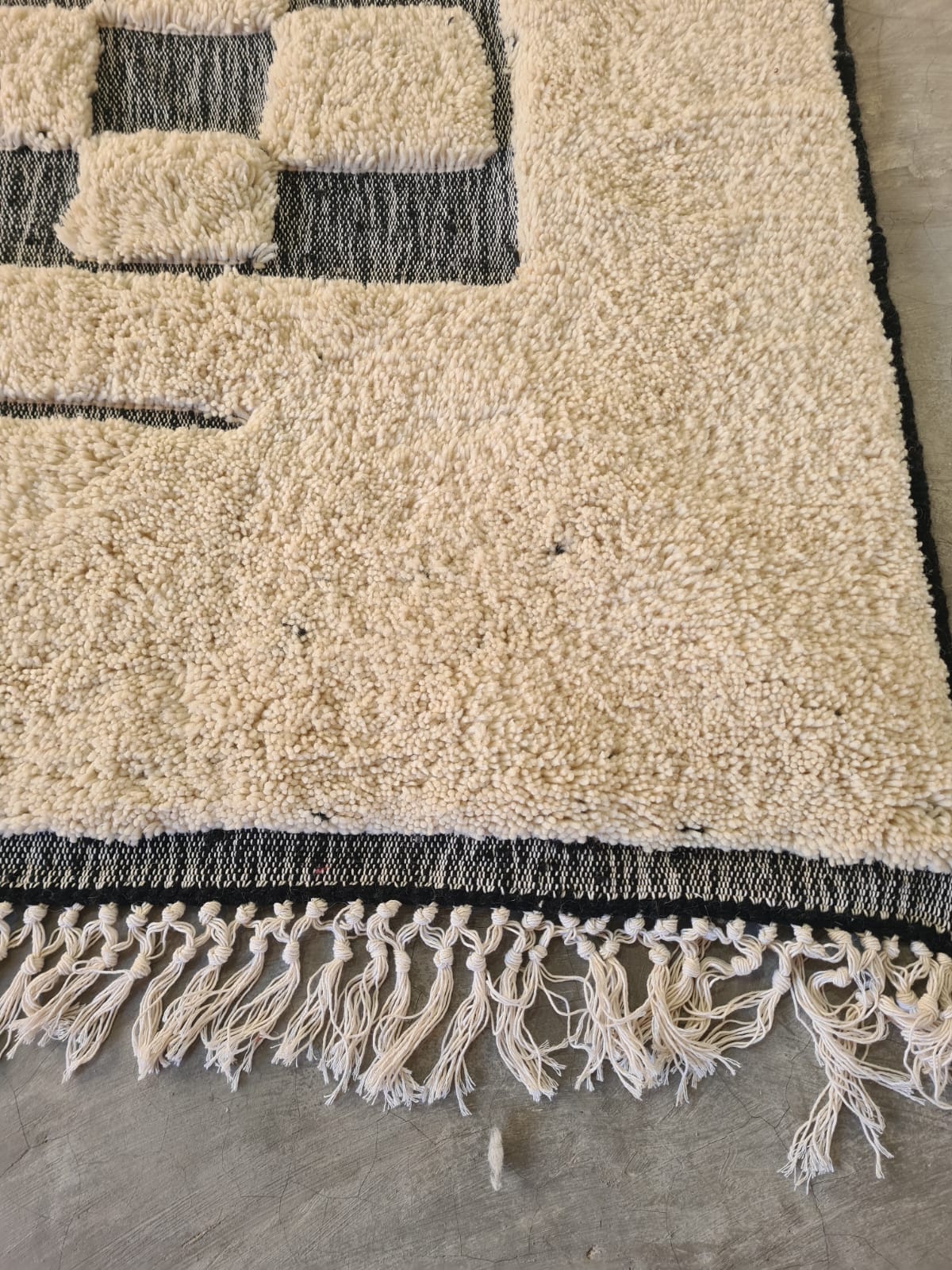 This rug exemplifies the minimalist elegance found in ancestral Amazigh weaving traditions. Its composition is bold yet meditative: black wool naturally dyed using walnut husk or iron oxide set into a soft, creamy wool field handspun by the weaver herself. Each square is not only a visual gesture but a spatial pulse—a silent chant on repetition, logic, and cosmic dualities.
