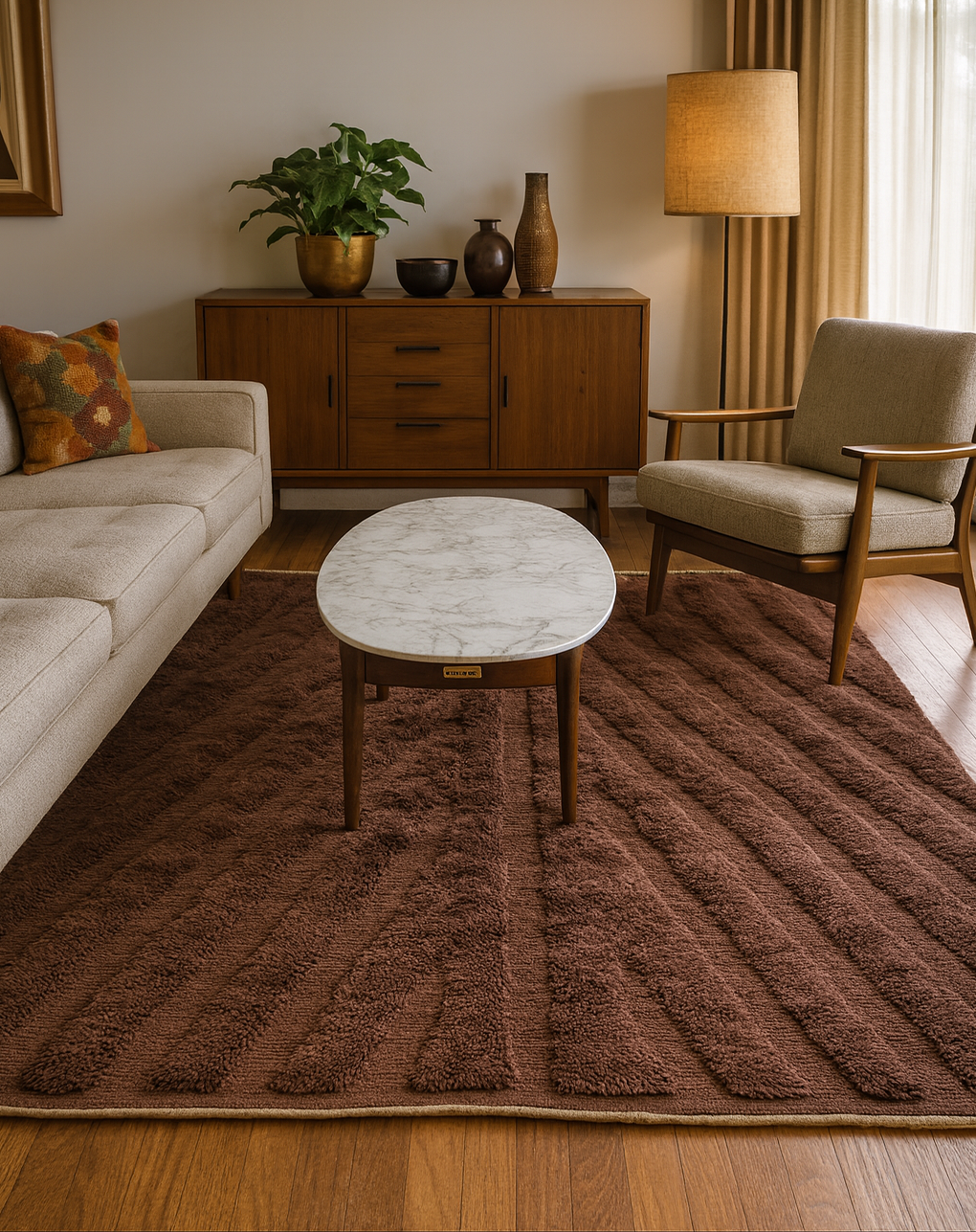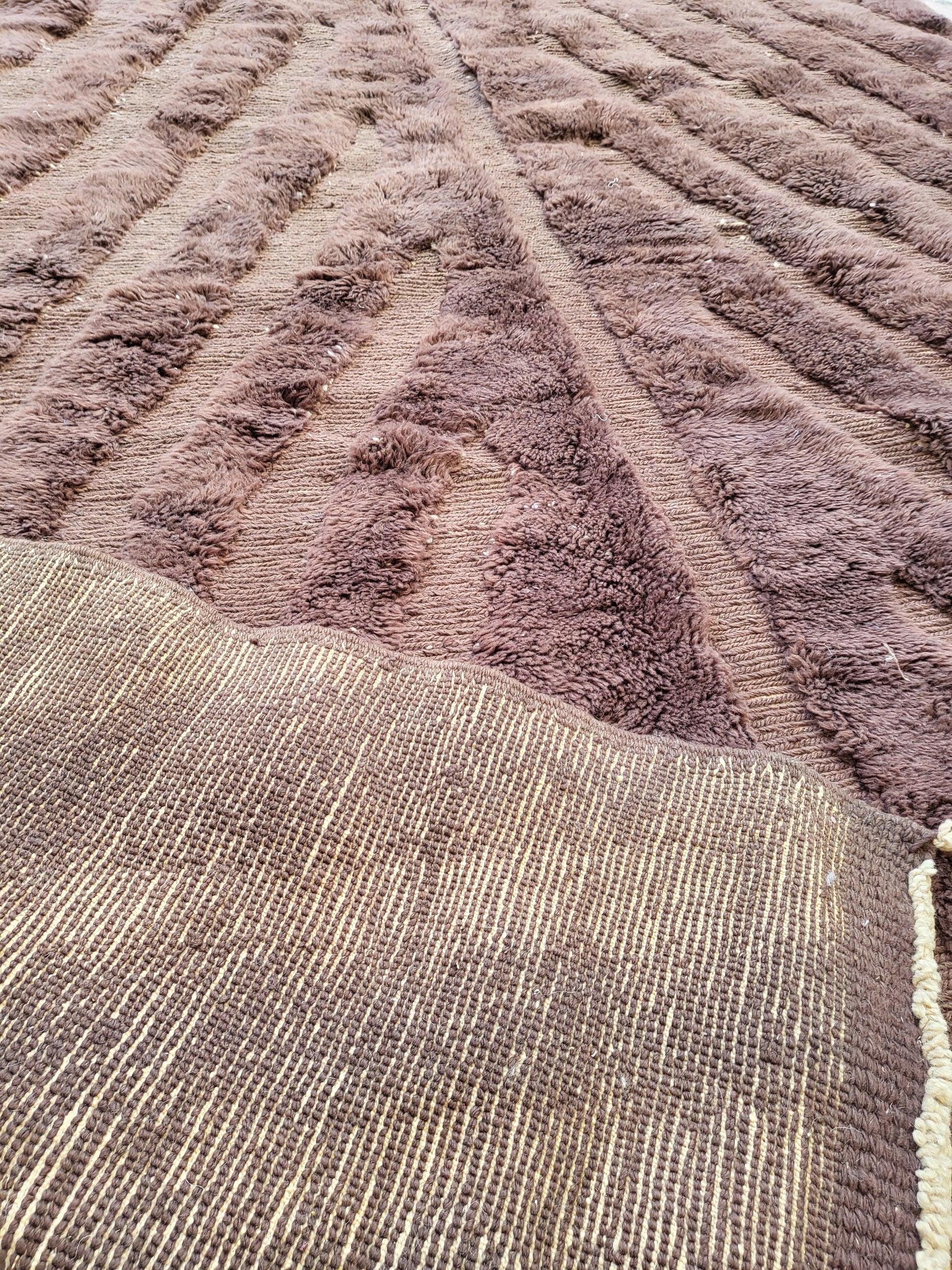 A contemporary Beni Mrirt in a deep cocoa brown, sculpted in high/low relief. From a central axis, ribbed “fan” branches sweep outward in measured arcs, creating a tactile topography that catches light. The profile is clean with bound edges—modern, plush, and quietly architectural.