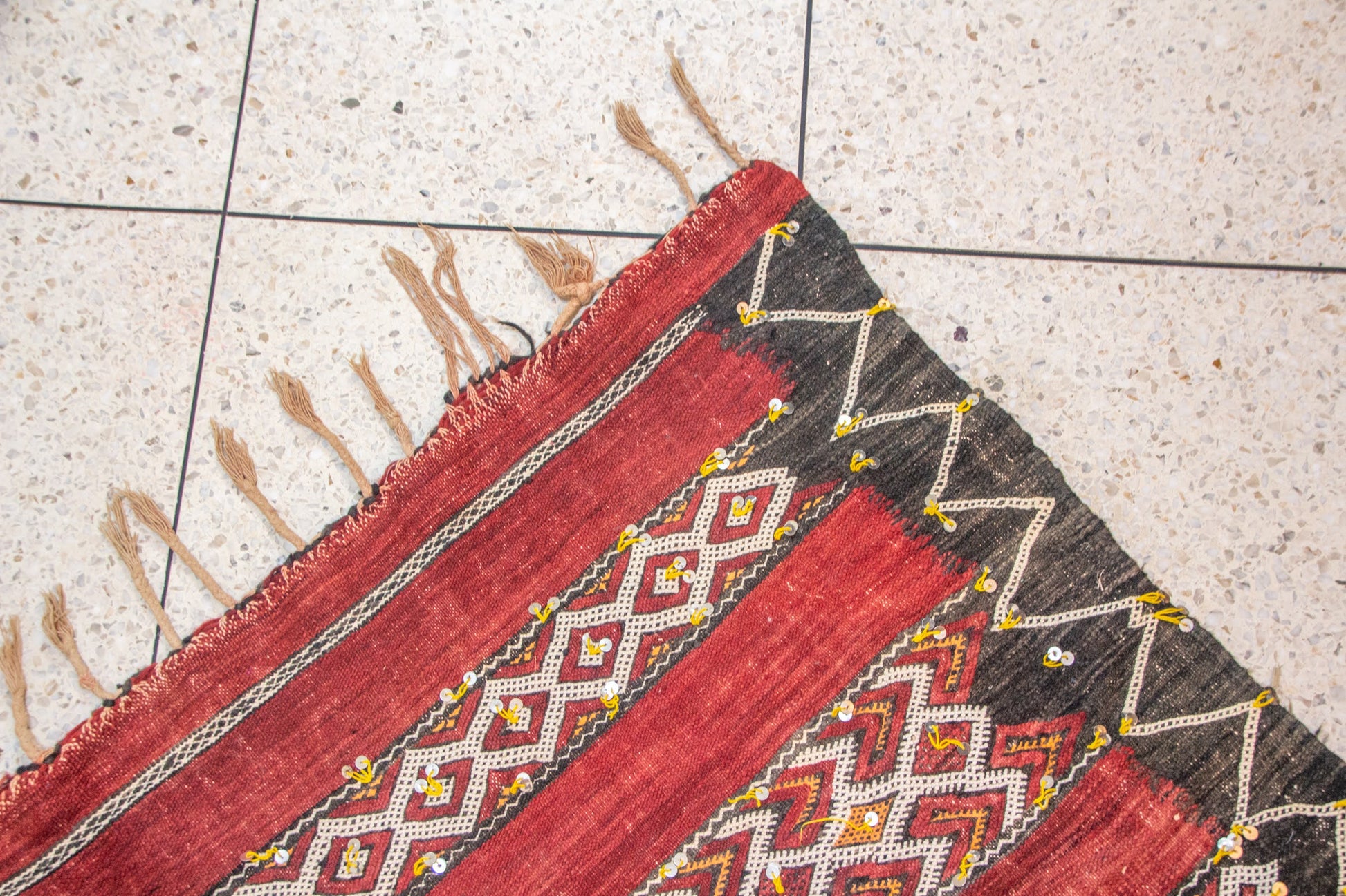 This Zayane vintage rug stands as a ceremonial archive of the Middle Atlas. Handwoven in deep crimson fields punctuated with ivory and sunlit yellow, its rhythmic zigzag bands and protective diamond lattices are more than ornament—they are a woven cosmology of the tribe’s pastoral traditions and spiritual lineage. A textile not merely made, but lived: its borders, flanked in bold onyx tones, frame a composition once used to anchor domestic and ritual spaces.