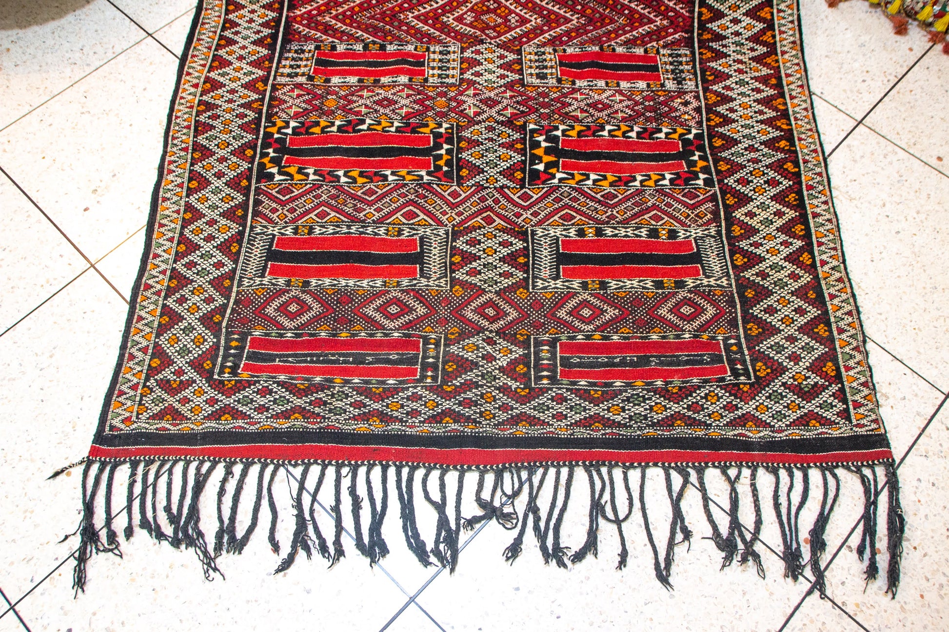 The alternating horizontal red panels recall ancient textile layering traditions, functioning both as visual anchors and symbolic thresholds. Each woven passage reflects the tribe’s mastery in balancing order, vitality, and spiritual safeguarding.
