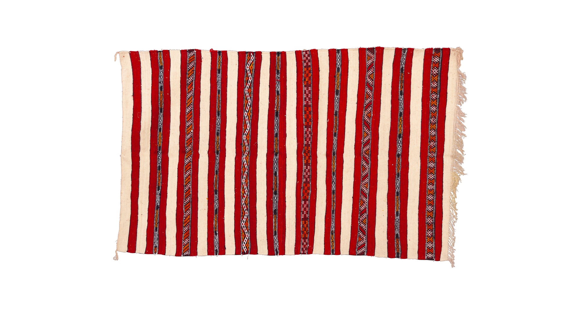 Classic Zemmour flatweave in ivory and crimson banding, punctuated by brocaded guard panels— chevrons, diamonds and tiny Xs. Graphic yet warm, it reads architectural and timeless across living rooms, dining spaces, or as a striking wall hanging.