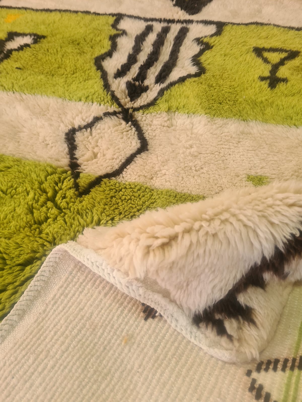 Set on a luminous natural wool base with cheerful tones of lime, tangerine, and ink black, this rug is not merely decorative—it is a metaphysical map of hope, prosperity, and renewal. Crafted by hand in the High Atlas mountains, its texture is soft and soulful, imbued with the meditative rhythm of ancestral knotting.