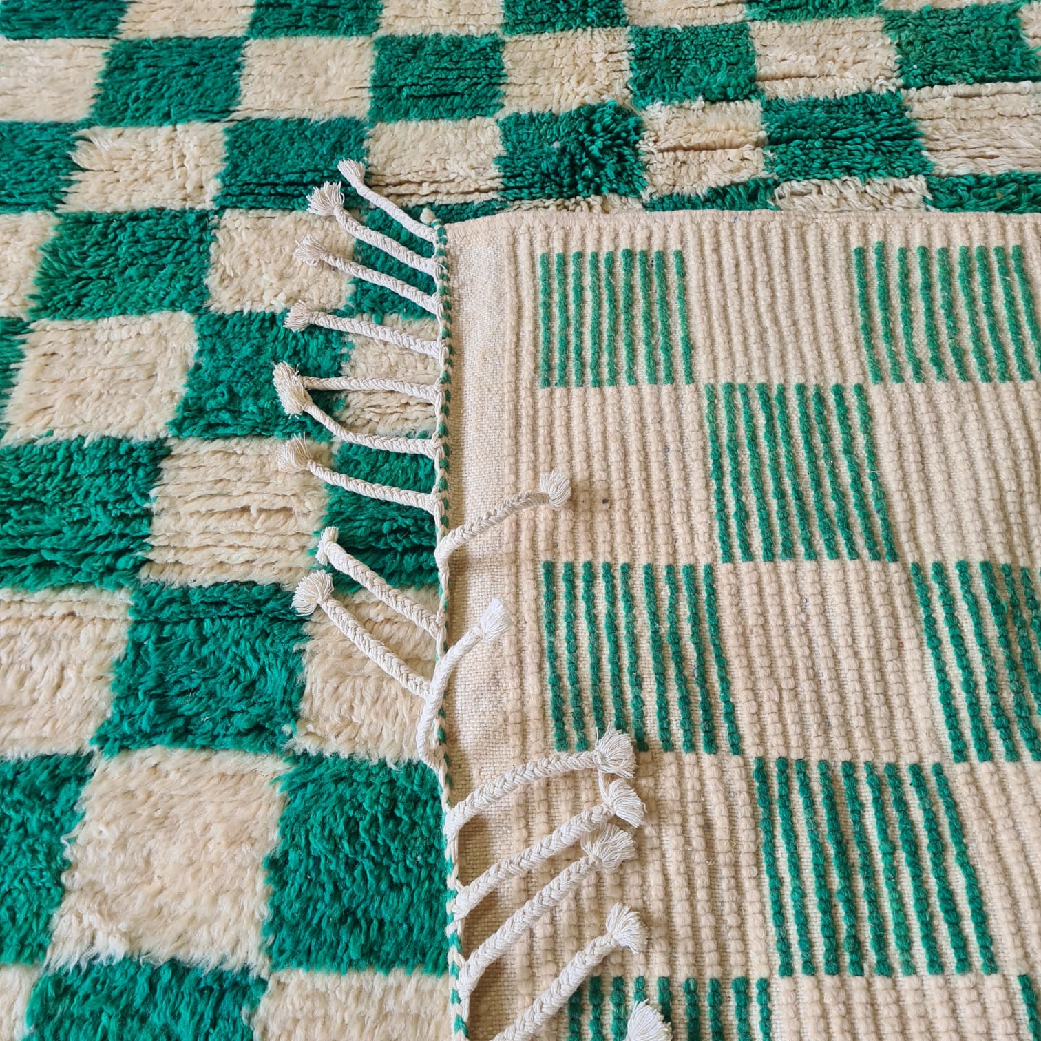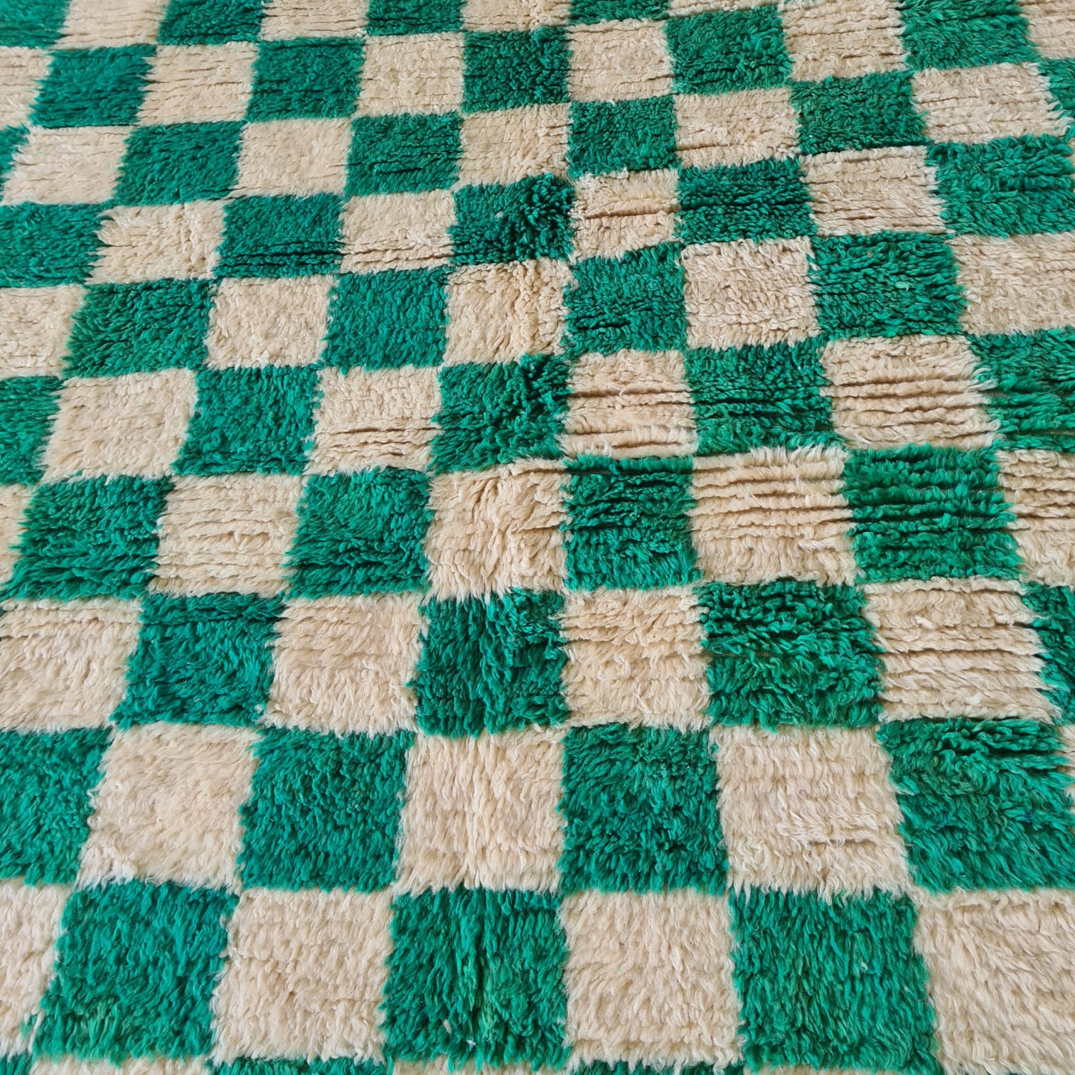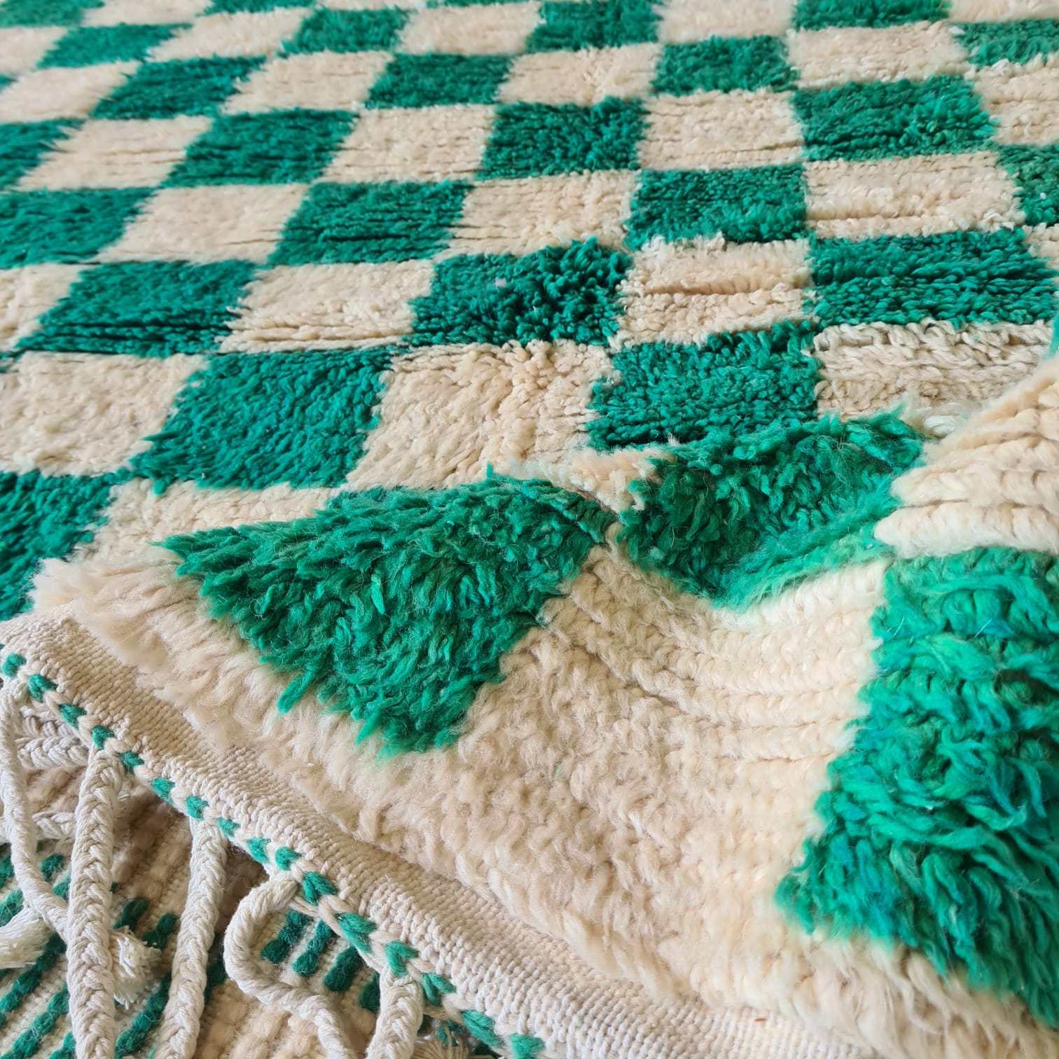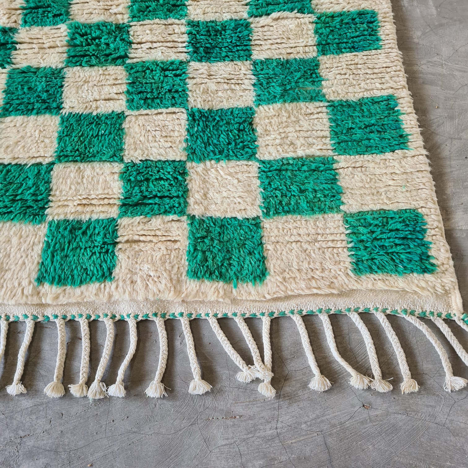 A refined Marmoucha woven in undyed ivory wool with a saturated emerald checker. Plush, even pile gives a velvety hand, while short flatweave aprons and natural fringe retain the classic Atlas finish. Graphic, warm, and easy to place.